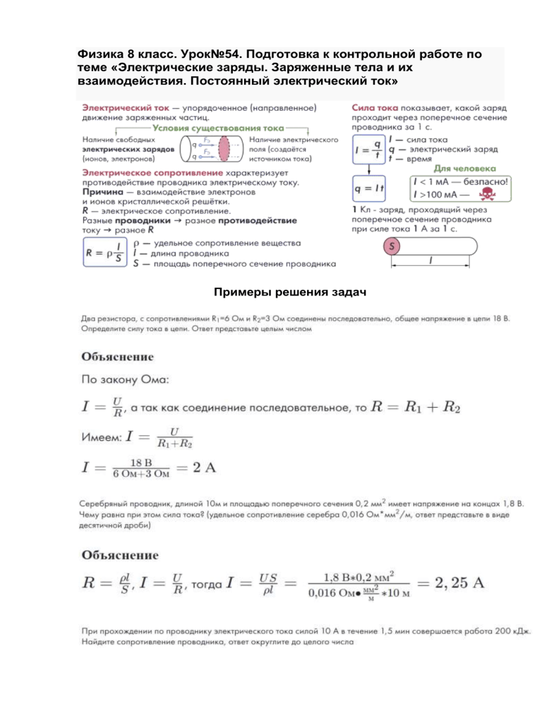 Физика 8 класс. Урок№54. Подготовка к контрольной работе по теме «Электрические заряды. Заряженные тела и их взаимодействия. Постоянный электрический ток» Примеры решения задач