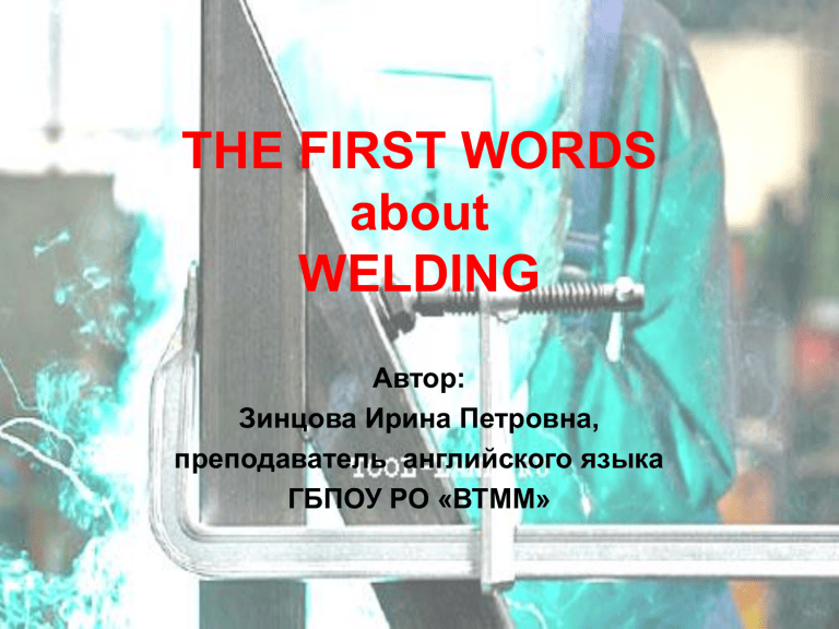 THE FIRST WORDS about WELDING Автор: Зинцова Ирина Петровна, преподаватель английского языка ГБПОУ РО «ВТММ» welder equipment welder shield welder jacket welder pants welder shoes welding gloves Equip a welder! gas reducer gas cylinder welding torch power supply filler wire control pedal base metal supply weight gas расходометр и регулятор сварочная горелка охлаждающая вода водоотвод педаль регулировки электрический проводник, соединяющий источник тока и заготовку газ электрический проводник между источником сварочного тока и электрододержателем flowmeter and regulator 1 electrode lead foot pedal fine control 8 3 water to drain 7 torch 10 6 2 12 gas 5 work lead 9 11 power source cooling water inert gas supply base metal filler metal 4 1 2 10 3 11 6 7 8 12 9 5 4 flowmeter and regulator electrode lead foot pedal fine control water to drain power source torch cooling water gas inert gas supply work lead base metal filler metal 1 2 10 3 11 6 7 8 12 9 5 4 welding machine АДГ-502 1. сварочный трактор 2. сварочный выпрямитель ВДУ500-1 3. дополнительный пульт управления welding rectifier welding tractor additional control panel ammeter coated electrode voltmeter electric holder weld metal base metal power supply welding arc welding cable: electrode cable reverse (ground) cable ground clamp