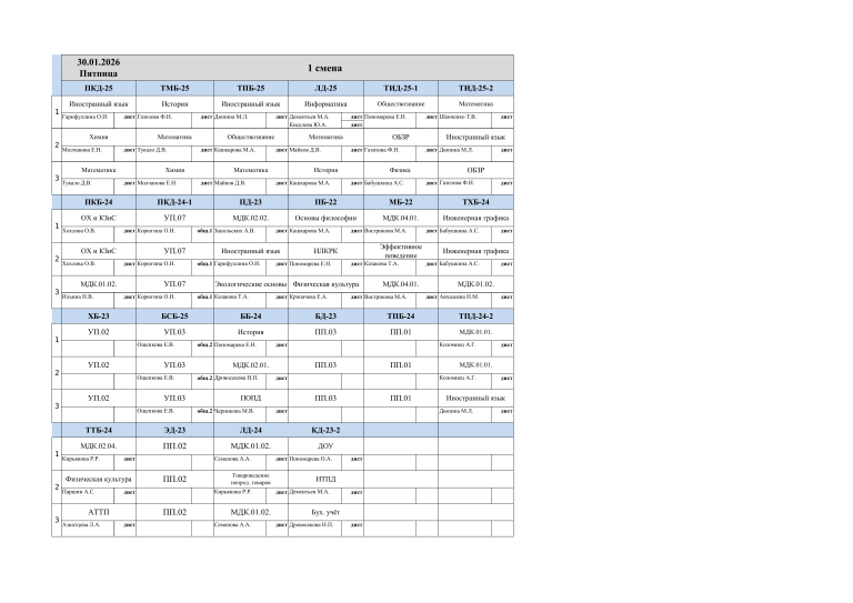 30.01.2026 Пятница 1 1 смена ПКД-25 ТМБ-25 ТПБ-25 ЛД-25 ТИД-25-1 ТИД-25-2 Иностранный язык История Иностранный язык Информатика Обществознание Математика Гарифуллина О.И. дист Газизова Ф.Н. Химия 2 Молчанова Е.Н. Математика дист Тукало Д.В. Математика 3 1 Тукало Д.В. Химия дист Молчанова Е.Н. Математика дист Майков Д.В. дист Газизова Ф.Н. История дист Кашкарова М.А. Физика дист Бабушкина А.С. Иностранный язык дист Дюпина М.Л. дист ОБЗР дист Газизова Ф.Н. дист МБ-22 ТХБ-24 ОХ и КЗиС УП.07 МДК.02.02. Основы философии МДК.04.01. Инженерная графика Хохлова О.В. дист Корюгина О.Н. УП.07 Хохлова О.В. дист Корюгина О.Н. УП.07 Ильина Н.В. дист Корюгина О.Н. общ.1 Запольских А.В. дист Кашкарова М.А. Иностранный язык общ.1 Гарифуллина О.И. дист Вострикова М.А. Эффективное поведение ИЛКРК дист Пономарева Е.Н. дист Казакова Т.А. Экологические основы Физическая культура общ.1 Казакова Т.А. дист Кропачева Е.А. МДК.04.01. дист Вострикова М.А. дист Бабушкина А.С. дист Бабушкина А.С. дист Авхадеева Н.М. ББ-24 БД-23 ТПБ-24 ТПД-24-2 УП.02 УП.03 История ПП.03 ПП.01 МДК.01.01. УП.03 Ощепкова Е.В. УП.02 УП.03 3 Ощепкова Е.В. общ.2 Пономарева Е.Н. ПП.03 МДК.02.01. общ.2 Дровосекова Н.П. ПП.03 дист ЛД-24 КД-23-2 МДК.02.04. ПП.02 МДК.01.02. ДОУ Физическая культура Паршин А.С. ПП.02 ПП.02 дист Товароведение непрод. товаров Кирьянова Р.Р. дист АТТП Азиатцева Л.А. Семенова А.А. МДК.01.02. Семенова А.А. дист Пономарева О.А. дист ИТПД дист Дементьев М.А. дист Бух. учёт дист Дровосекова Н.П. дист дист дист Иностранный язык Дюпина М.Л. ЭД-23 дист ПП.01 дист МДК.01.01. Коломиец А.Г. ТТБ-24 Кирьянова Р.Р. ПП.01 дист ПОПД общ.2 Черникова М.В. Коломиец А.Г. дист дист МДК.01.02. БСБ-25 Ощепкова Е.В. дист Инженерная графика ХБ-23 2 3 дист Майков Д.В. дист ПБ-22 УП.02 2 дист Кашкарова М.А. ОБЗР Математика дист Шевченко Т.В. ПД-23 1 1 Обществознание дист Пономарева Е.Н. дист ПКД-24-1 МДК.01.02. 3 дист Дементьев М.А. Киселева Ю.А. ПКБ-24 ОХ и КЗиС 2 дист Дюпина М.Л. дист 30.01.2026 Пятница 4 2 смена ПКБ-25 ТХБ-25 ББ-25 ТИБ-25 ТПД-25 ЛБ-25 Химия История Математика Математика Физика Биология Молчанова Е.Н. дист Газизова Ф.Н. Химия Математика 5 Тукало Д.В. дист Молчанова Е.Н. Биология 6 4 Казакова Т.А. дист Тукало Д.В. 4 История дист Кашкарова М.А. дист Киселева Ю.А. История дист Киселева Ю.А. Физика История дист Бабушкина А.С. Математика дист Майков Д.В. дист ОБЗР дист Газизова Ф.Н. дист ТМБ-24 МБ-23 ХБ-22 ОХ и КЗиС ПП.02 УП.06 МДК.01.01. МДК.02.01. Основы философии Хохлова О.В. Хохлова О.В. Ильина Н.В. Крючкова И.В. дист ПП.02 УП.06 МДК.01.01. Крючкова И.В. дист ПП.02 дист Вострикова М.А. УП.06 дист Вострикова М.А. Гарифуллина О.И. 403 Корюгина О.Н. Основы бер.произ-ва дист Крючкова И.В. дист МДК.04.01. МДК.02.01. Иностранный язык дист 403 Кашкарова М.А. дист МДК.04.01. дист Корюгина О.Н. дист БД-24 БСБ-24 ББ-23 ТПД-24-1 ТПСБ-24 ЭБ-23 МДК.02.01. Эффективное поведение МДК.03.01. МДК.01.01. МДК.03.01. Физическая культура Дровосекова Н.П. Дровосекова Н.П. Черникова М.В. дист Киселева Ю.А. дист Щуклина М.В. Физическая культура дист Кропачева Е.А. Аудит дист Ощепкова Е.В. дист Коломиец А.Г. МДК.03.01. дист Щуклина М.В. дист Назипова Г.Ф. Физическая культура дист Паршин А.С. дист Коломиец А.Г. КБ-23 КД-23-1 ПП.01 МДК.04.01. Физическая культура ИТПД ПП.01 5 Эффективное поведение Казакова Т.А. ПП.01 МДК.04.01. Семенова А.А. дист Паршин А.С. ИТПД дист Дементьев М.А. Бух. учет дист Дровосекова Н.П. дист Дементьев М.А. дист Паршин А.С. МДК.03.01. дист Назипова Г.Ф. дист Менеджмент дист Коломиец А.Г. дист ДОУ дист Пономарева О.А. дист Паршин А.С. Физическая культура МДК.01.01. Л