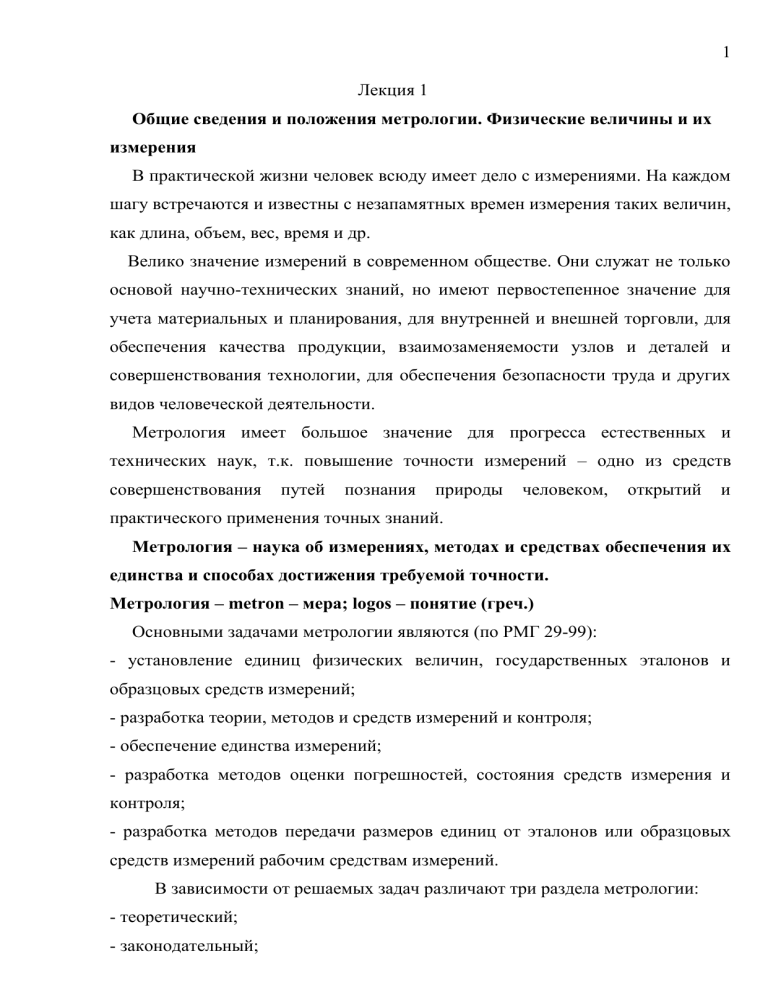 1 Лекция 1 Общие сведения и положения метрологии. Физические величины и их измерения В практической жизни человек всюду имеет дело с измерениями. На каждом шагу встречаются и известны с незапамятных времен измерения таких величин, как длина, объем, вес, время и др. Велико значение измерений в современном обществе. Они служат не только основой научно-технических знаний, но имеют первостепенное значение для учета материальных и планирования, для внутренней и внешней торговли, для обеспечения качества продукции, взаимозаменяемости узлов и деталей и совершенствования технологии, для обеспечения безопасности труда и других видов человеческой деятельности. Метрология имеет большое значение для прогресса естественных и технических наук, т.к. повышение точности измерений – одно из средств совершенствования путей познания природы человеком, открытий и практического применения точных знаний. Метрология – наука об измерениях, методах и средствах обеспечения их единства и способах достижения требуемой точности. Метрология – metron – мера; logos – понятие (греч.) Основными задачами метрологии являются (по РМГ 29-99): - установление единиц физических величин, государственных эталонов и образцовых средств измерений; - разработка теории, методов и средств измерений и контроля; - обеспечение единства измерений; - разработка методов оценки погрешностей, состояния средств измерения и контроля; - разработка методов передачи размеров единиц от эталонов или образцовых средств измерений рабочим средствам измерений. В зависимости от решаемых задач различают три раздела метрологии: - теоретический; - законодательный; 2 - прикладной. 1.1 Краткая история развития метрологии Потребность в измерениях возникла в незапамятные времена. Для этого в первую очередь использовались подручные средства. Например, единица веса драгоценных камней – карат, что в переводе с языков древнего юга-востока означает «семя боба», «горошина»; единица аптекарского веса – гран, что в переводе с латинского, французского, английского и испанского означает «зерно». Многие меры имели антропометрическое происхождение или были связаны с конкретной трудовой деятельностью человека. Так, в Киевской Руси применялись в обиходе вершок – длина фаланги указательного пальца; пядь – расстояние между концами вытянутых большого и указательного пальцев; локоть – расстояние от локтя до конца среднего пальца; сажень – от «сягать», «достигать» т.е. можно достать; косая сажень – предел того, что можно достать: расстояние от подошвы левой ноги до конца среднего пальца вытянутой вверх правой руки; верста – от «верти», «поворачивая» плуг обратно, длина борозды. Древние вавилоняне установили год, месяц, час. Впоследствии 1/86400 часть среднего периода обращения Земли вокруг своей оси (суток) получила название секунды. В Вавилоне во II в. до н.э. время измерялось в минах, которая равнялась промежутку времени ( равному примерно двум астрономическим часам), за который из принятых в Вавилоне водяных часов вытекала «мина» воды, массой около 500 г. Затем мина превратилась в привычную для нас минуту. Со временем водяные часы уступили место песочным, а затем более сложным маятниковым механизмам. Важнейшим метрологическим документом в России является Двинская грамота Ивана Грозного (1550 г.). В ней регламентир