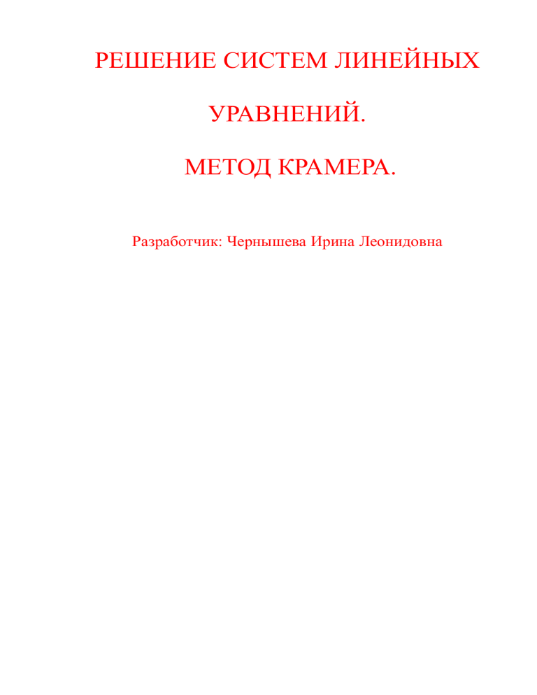 РЕШЕНИЕ СИСТЕМ ЛИНЕЙНЫХ УРАВНЕНИЙ. МЕТОД КРАМЕРА. Разработчик: Чернышева Ирина Леонидовна ПОЯСНИТЕЛЬНАЯ ЗАПИСКА Данная методическая разработка предназначена для проведения учебного занятия по дисциплине «Математика» на тему «Решение систем линейных уравнений методом Крамера» для студентов второго курса по программе учебной дисциплины, разработанной на основе Федерального государственного образовательного стандарта для специальностей среднего профессионального образования. В результате изучения темы студент должен: знать: решение систем линейных уравнений методом Крамера; применение знаний при решении систем линейных уравнений. уметь: решать системы двух линейных уравнений с двумя неизвестными методом Крамера решать системы трех линейных уравнений с тремя неизвестными методом Крамера При разработке данного урока в зависимости от специфики подготовки студентов можно внести дополнения и изменения в содержание, последовательность изучения материала урока и распределение времени. Наблюдается связь истории с математикой, при изучении материала использована задача прикладного характера для будущей практической деятельности, что прививает интерес к предмету. Данная методическая разработка содержит: учебно-методическую карту, ход, где сформулированы цели занятия и последовательность проведения урока, указан список литературы. При проведении занятия, использованы учебные пособия, технические и наглядные средства обучения УЧЕБНО-МЕТОДИЧЕСКАЯ КАРТА Дисциплина: Математика Тема занятия: Решение систем линейных уравнений методом Крамера Вид занятия (тип урока): Комбинированный Цели урока: Дидактическая: повторить пройденный материал; углубить знания студентов по теме «Решение систем линейных уравнений»; 3) изучить решение систем линейных уравнений c помощью метода Крамера; 4) научиться решать системы двух линейных уравнений с двумя неизвестными и трех линейных уравнений с тремя неизвестными, используя метод Крамера. Развивающая: способствовать развитию: логического мышления; памяти; умению сравнивать, обобщать, анализировать; интереса к избранной специальности. Воспитательная: стремиться воспитывать: чувства ответственности, исполнительности, аккуратности; чувство гордости за избранную профессию; положительное отношение к знаниям, учениям; интерес к математике Межпредметные связи: Обеспечивающие: история, русский язык, информатика Обеспечиваемые: специальные предметы Обеспечение занятия: Наглядные пособия: Приложение (Презентация к уроку) Раздаточный материал: карточки. Технические средства обучения: калькуляторы, компьютеры, интерактивная доска ХОД УРОКА №п/ Элементы урока, п содержание и последовательно сть изучаемых вопросов Формы и методы обучения, контроля Наглядные Преподаватель Студент Врем пособия, ы я 45 ТСО, мин. дидактичес кий материал 1. Организационный Проверка момент. Взаимное отсутствующ приветствие. их, рабочих мест Интерактив ная доска слайд №1 Приветствует, Приветст отмечает в вуют журнале отсутствующих. 2. Постановка целей занятия. Организация внимания Интерактив ная доска Ставит цели урока Слушают 1 мин 3. Проверка домашнего задания Групповая работа Интерактив ная доска Контролирует Дежурны й проверяет 5 мин 4. Проверка знаний Экспрессопрос Слайды № 2,3,4 Задает вопрос, поправ