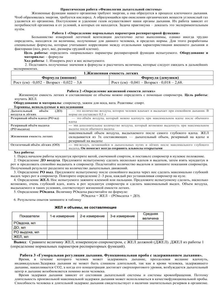 Практическая работа «Физиология дыхательной системы» Жизненные функции нашего организма требуют энергии, а она образуется в процессе клеточного дыхания. Чтоб образовалась энергия, требуется кислород. А образующийся при окислении органических веществ углекислый газ удаляется из организма. Поступление и удаление газов осуществляют наши органы дыхания. Их работа зависит от потребностей организма и от условий, в которых он находится. Задача практикума – доказать это экспериментальным путём. Работа 1 «Определение нормальных параметров респираторной функции» Большинство измерений легочной вентиляции достаточно легко выполнимы, однако иногда трудно определить, находятся ли величины, полученные для данного человека, в пределах нормы. Для этого разработаны специальные формулы, которые учитывают корреляцию между отдельными характеристиками внешнего дыхания и факторами (пол, рост, вес, размеры грудной клетки). Цель работы: определить «нормальные» параметры респираторной функции испытуемого. Оборудование и материалы: – формулы Ход работы: 1. Измерить рост и вес испытуемого. 2. Подставить полученные значения в формулы и рассчитать величины, которые следует ожидать в дальнейших экспериментах. 1.Жизненная емкость легких Формула (юноши) Рост (см) 0,052 – Возраст 0,022 – 3,6 Формула (девушки) Рост (см) 0,041 – Возраст 0,018 – 2,68. Работа 2 «Определение жизненной емкости легких» Жизненную емкость легких и составляющие ее объемы можно определить с помощью спирометра. Цель работы: изучить ЖЕЛ. Оборудование и материалы: спирометр, зажим для носа, вата. Реактивы: спирт. Термины, используемые в исследовании Дыхательный объём (ДО) воздуха в лёгких Резервный объём вдоха (РО вд) Резервный объём выдоха (РО выдоха) Жизненная емкость легких Остаточный объём лёгких (ОО) — это количество воздуха, которое человек вдыхает и выдыхает при спокойном дыхании. В норме он составляет 0,5 л — это объём воздуха, который можно вдохнуть при максимальном вдохе после обычного вдоха — это дополнительное количество воздуха, который возможно выдохнуть при максимальном выдохе после обычного выдоха максимальный объем воздуха, выдыхаемого после самого глубокого вдоха. ЖЕЛ складывается из 3х составляющих — дыхательный объем, резервный на вдохе и резервный на выдохе — это воздух, остающийся в дыхательных путях и лёгких после максимального глубокого выдоха. Он помогает всегда сохранить альвеолы открытыми Ход работы: 1. Перед началом работы мундштук протрите ватой, смоченной спиртом, и поставьте спирометр в нулевое положение. 2. Определение ДО воздуха. Предложите испытуемому сделать несколько вдохов и выдохов, затем взять мундштук в рот и продолжать спокойно выдыхать в спирометр. Подсчитайте количество выдохов и запишите показания спирометра. Полученный результат разделите на количество дыхательных движений. 3. Определение РО выд. Предложите испытуемому после спокойного выдоха через нос сделать максимально глубокий выдох через рот в спирометр. Повторите определение 2–3 раза, каждый раз устанавливая спирометр на нуле. 4. Определение ЖЕЛ. Нос испытуемого зажмите клеммой или пальцами. Предложите испытуемому сделать, насколько возможно, очень глубокий вдох, взять в рот мундштук спирометра и сделать максимальный выдох. Объем воздуха, выдыхаемого в таких условиях, соответствуе