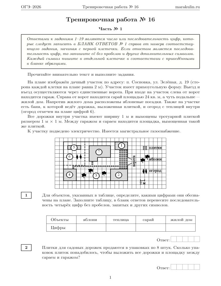 ОГЭ–2026 Тренировочная работа № 16 marakulin.ru Тренировочная работа № 16 Часть № 1 Ответами к заданиям 1–19 являются число или последовательность цифр, которые следует записать в БЛАНК ОТВЕТОВ № 1 справа от номера соответствующего задания, начиная с первой клеточки. Если ответом является последовательность цифр, то запишите её без пробелов и других дополнительных символов. Каждый символ пишите в отдельной клеточке в соответствии с приведёнными в бланке образцами. Прочитайте внимательно текст и выполните задания. На плане изображён дачный участок по адресу: п. Сосновка, ул. Зелёная, д. 19 (сторона каждой клетки на плане равна 2 м). Участок имеет прямоугольную форму. Выезд и въезд осуществляются через единственные ворота. При входе на участок слева от ворот находится гараж. Справа от ворот находится сарай площадью 24 кв. м, а чуть подальше — жилой дом. Напротив жилого дома расположены яблоневые посадки. Также на участке есть баня, к которой ведёт дорожка, выложенная плиткой, и огород с теплицей внутри (огород отмечен на плане цифрой 6). Все дорожки внутри участка имеют ширину 1 м и вымощены тротуарной плиткой размером 1 м × 1 м. Между гаражом и сараем находится площадка, вымощенная такой же плиткой. К участку подведено электричество. Имеется магистральное газоснабжение. 1 Для объектов, указанных в таблице, определите, какими цифрами они обозначены на плане. Заполните таблицу, в бланк ответов перенесите последовательность четырёх цифр без пробелов, запятых и других символов. Объекты яблони теплица сарай жилой дом Цифры Ответ: 2 Плитки для садовых дорожек продаются в упаковках по 8 штук. Сколько упаковок плиток понадобилось, чтобы выложить все дорожки и площадку между сараем и гаражом? Ответ: 1 ОГЭ–2026 3 Тренировочная работа № 16 marakulin.ru Найдите расстояние от жилого дома до гаража (расстояние между двумя ближайшими точками по прямой) в метрах. Ответ: 4 Сколько процентов от площади всего участка занимают строения (жилой дом, гараж, сарай, баня)? Ответ округлите до целого. Ответ: 5 Хозяин участка планирует установить в жилом доме систему отопления. Он рассматривает два варианта: электрическое или газовое отопление. Цены на оборудование и стоимость его установки, данные о расходе газа, электроэнергии и их стоимости даны в таблице. Нагреватель Прочее обо(котёл) рудование и монтаж Средний расход газа/средняя потребл. мощность Стоимость газа/ электроэнергии Газовое отопление 20 000 руб. 15 370 руб. 1,6 куб. м/ч 4,9 руб./куб. м Электр. отопление 15 000 руб. 14 000 руб. 4,9 кВт 4,2 руб./(кВт · ч) Обдумав оба варианта, хозяин решил установить газовое отопление. Через сколько часов непрерывной работы отопления экономия от использования газа вместо электричества компенсирует разницу в стоимости покупки и установки газового и электрического оборудования? Ответ: 6 Найдите значение выражения 21 3 : 2 5 Ответ: 7 На координатной прямой точки 𝐴, 𝐵, 𝐶 и 𝐷 соответствуют числам 0,508; 0,85; −0,05 и 0,058. 𝐴 𝐵 𝐶 𝐷 𝑥 Какой точке соответствует число 0,058? 1) 𝐴; 2) 𝐵; 3) 𝐶; 4) 𝐷. Ответ: 8 Найдите значение выражения √ 𝑎2 − 4𝑎𝑏 + 4𝑏2 при 𝑎 = 3 и 𝑏 = 4. Ответ: 2 ОГЭ–2026 9 Тренировочная работа № 16 marakulin.ru Решите уравнение 4𝑥2 = 20𝑥. Если уравнение имеет более одного корня, в ответ запишите меньший из корней. Ответ: 10 В лыжных гонках участвуют 7 спортсменов из России, 1 спортсмен из Норвегии и 2 спортсмена из Швеции. Порядо