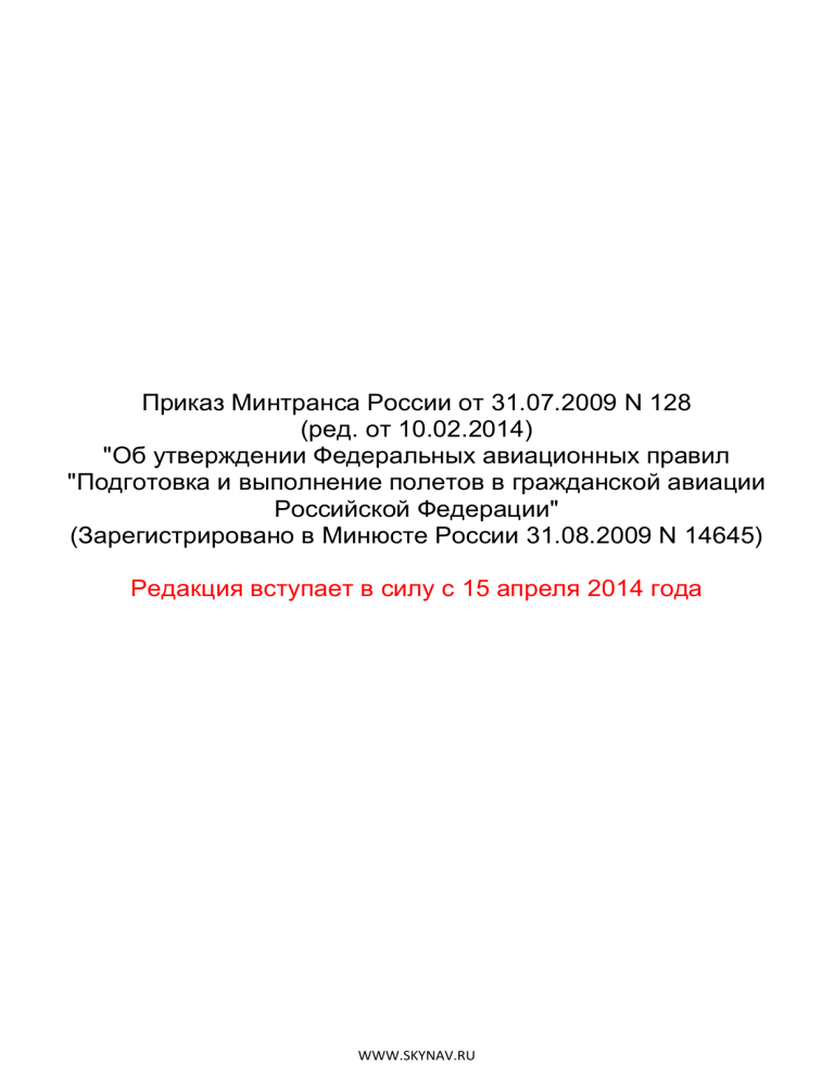 Приказ Минтранса России от 31.07.2009 N 128 (ред. от 10.02.2014) "Об утверждении Федеральных авиационных правил "Подготовка и выполнение полетов в гражданской авиации Российской Федерации" (Зарегистрировано в Минюсте России 31.08.2009 N 14645) Редакция вступает в силу с 15 апреля 2014 года WWW.SKYNAV.RU Зарегистрировано в Минюсте России 31 августа 2009 г. N 14645 МИНИСТЕРСТВО ТРАНСПОРТА РОССИЙСКОЙ ФЕДЕРАЦИИ ПРИКАЗ от 31 июля 2009 г. N 128 ОБ УТВЕРЖДЕНИИ ФЕДЕРАЛЬНЫХ АВИАЦИОННЫХ ПРАВИЛ "ПОДГОТОВКА И ВЫПОЛНЕНИЕ ПОЛЕТОВ В ГРАЖДАНСКОЙ АВИАЦИИ РОССИЙСКОЙ ФЕДЕРАЦИИ" (в ред. Приказов Минтранса России от 21.12.2009 N 242, от 22.11.2010 N 263, от 16.11.2011 N 284, от 27.12.2012 N 453, от 25.11.2013 N 362, от 10.02.2014 N 32) В соответствии со статьями 67, 68, 69, 71, 74, 79, пунктом 2 статьи 87, пунктами 1 и 2 статьи 114 Федерального закона от 19 марта 1997 г. N 60-ФЗ "Воздушный кодекс Российской Федерации" (Собрание законодательства Российской Федерации, 1997, N 12, ст. 1383; 1999, N 28, ст. 3483; 2004, N 35, ст. 3607, N 45, ст. 4377; 2005, N 13, ст. 1078; 2006, N 30, ст. 3290, 3291; 2007, N 1 (ч. I), ст. 29, N 27, ст. 3213, N 46, ст. 5554, N 49, ст. 6075, N 50, ст. 6239, 6244, 6245; 2008, N 29 (ч. I), ст. 3418, N 30 (ч. II), ст. 3616; 2009, N 1, ст. 17) и в целях реализации стандартов и рекомендуемой практики Международной организации гражданской авиации при подготовке и выполнении полетов в гражданской авиации Российской Федерации приказываю: 1. Утвердить прилагаемые Федеральные авиационные правила "Подготовка и выполнение полетов в гражданской авиации Российской Федерации". 2. Признать утратившими силу Приказы Министерства транспорта Российской Федерации от 17 июля 2008 г. N 108 "Об утверждении Федеральных авиационных правил "Подготовка и выполнение полетов в гражданской авиации Российской Федерации" (зарегистрирован Минюстом России 14 августа 2008 г., регистрационный N 12119), от 27 ноября 2008 г. N 197 <*>, от 23 июня 2009 г. N 100 <**>. -------------------------------<*> Зарегистрирован Минюстом России 09 декабря 2008 г., регистрационный N 12810. <**> Зарегистрирован Минюстом России 01 июля 2009 г., регистрационный N 14192. 3. Установить, что настоящий Приказ вступает в силу через 60 дней со дня официального опубликования. 4. Установить, что в прилагаемых правилах: пункты 4.10, 5.5 и 5.12 вступают в силу с 1 января 2010 г.; пункты 2.18.14 и 4.6 вступают в силу с 1 января 2011 г.; абзац второй и третий пункта 4.20, пункты 5.75, 5.76 и 5.78 вступают в силу с 1 июля 2012 г.; (в ред. Приказа Минтранса России от 16.11.2011 N 284) абзац четвертый пункта 4.20 вступает в силу с 1 января 2014 г. (абзац введен Приказом Минтранса России от 16.11.2011 N 284) Министр И.Е.ЛЕВИТИН WWW.SKYNAV.RU 2 Утверждены Приказом Минтранса России от 31 июля 2009 г. N 128 ФЕДЕРАЛЬНЫЕ АВИАЦИОННЫЕ ПРАВИЛА "ПОДГОТОВКА И ВЫПОЛНЕНИЕ ПОЛЕТОВ В ГРАЖДАНСКОЙ АВИАЦИИ РОССИЙСКОЙ ФЕДЕРАЦИИ" (в ред. Приказов Минтранса России от 21.12.2009 N 242, от 22.11.2010 N 263, от 16.11.2011 N 284, от 27.12.2012 N 453, от 25.11.2013 N 362, от 10.02.2014 N 32) I. Общие положения 1.1. Федеральные авиационные правила "Подготовка и выполнение полетов в гражданской авиации Российской Федерации" (далее - Правила) устанавливают правила подготовки воздушного судна и его экипажа к полету, обеспечения и выполнения полетов в гражданской авиации, а также аэронавигационного обслуживания полетов в Российской Федерации, и разработаны в соответствии со статьями 67, 68, 69, 71, 74, 79, пунктом 2 статьи 87, пунктами 1 и 2 статьи 114 Федерального закона от 19 марта 1997 г. N 60-ФЗ "Воздушный кодекс Российской Федерации". 1.2. Настоящие Правила обязательны для исполнения эксплуатантами и владельцами воздушных судов, зарегист