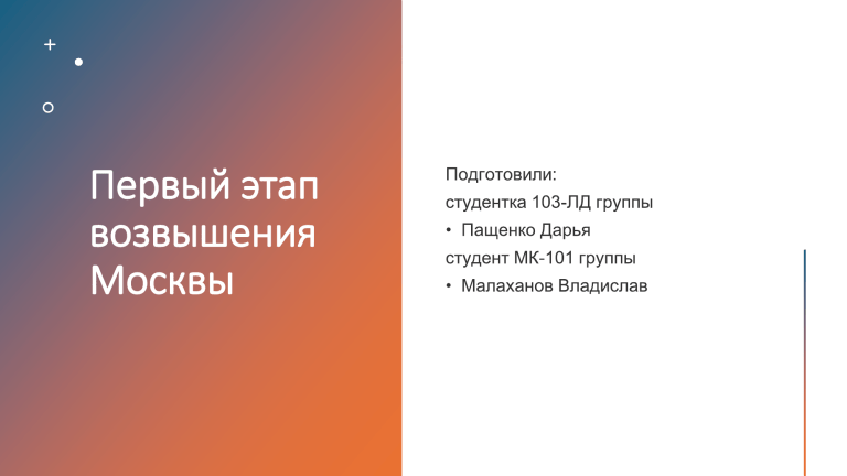Первый этап возвышения Москвы Борьба за ярлык великого князя владимирского На рубеже XIII—XIV вв. политическое дробление Руси достигло своего апогея. Только на Северо-Востоке появилось 14 княжеств, которые продолжали делиться на уделы. К началу XIV в. возросло значение новых политических центров: Твери, Москвы, Нижнего Новгорода, тогда как многие старые города пришли в упадок, так и не"восстановив свои позиции после нашествия. Великий князь владимирский, будучи номинальным главой всей земли, получив ярлык, практически оставался правителем только в собственном княжестве и не переезжал во Владимир. Правда, великое княжение давало ряд преимуществ: князь, получивший его, распоряжался землями, входившими в состав великокняжеского домена и мог раздавать их своим слугам, он контролировал сбор дани, как «старейший» представлял Русь в Орде. Это, в итоге, поднимало престиж князя, усиливало его власть. Вот почему князья отдельных земель вели ожесточенную борьбу за ярлык на великое княжение. Основными претендентами в XIV в. были тверские, московские и суздальско-нижегородские князья. В их противостоянии и решалось, каким путем будет происходить объединение русских земель. Соперничество Москвы и Твери • В XIV веке на северо-востоке Руси начался процесс государственного объединения земель, который шел одновременно с борьбой за освобождение от ордынской зависимости. С самого начала обозначилось два центра государственного объединения, которые повели борьбу за лидерство, – Тверь и Москва. • Выгодным было и их географическое положение, так как Москва и Тверь располагались в центре старых русских земель и были относительно удалены от районов постоянных вражеских набегов. Даниил Московский • Незадолго до своей смерти Александр Невский завещал Москву в качестве удела своему младшему сыну Даниилу (1263‒1303), прозванному в дальнейшем Московским. Даниил Московский очень мало воевал — он добился успеха в большей степени благодаря политической мудрости и умению находить общий язык с другими князьями. • В итоге Даниил Московский к концу жизни расширил территорию своего княжества почти в два раза. Юрий Московский • Старший сын Даниила Московского - Юрий (1303–1325), опираясь на выросшую силу княжества, стал активно бороться за власть с другими князьями. • В 1303 г. он отвоевал у смоленского князя город Можайск и прилегающие к нему земли в верховьях реки Москвы • В 1305 г. ярлык на великое княжение достался тверскому князю. Михаил Тверской стал сам, без помощи баскаков, собирать дань для ордынцев с земель Северо-Восточной Руси. • Юрий отправился с богатыми дарами в Орду, где пробыл несколько лет в поиске союзников. Юрий Московский • Московский князь сумел заключить брак с сестрой хана Узбека (1313‒1341). Он вернулся на Русь в сопровождении ордынского отряда и сразу же начал войну против Михаила Тверского. • После смерти Михаила Тверского Юрий получил ярлык на великое княжение. • Юрий не сумел сохранить великокняжеский ярлык, поскольку использовал ордынскую дань в своих корыстных интересах. Экономическое и военное укрепление Московского княжества. Иван Калита и его сыновья • После гибели Юрия московским князем стал его младший брат Иван Калита (1325-1340). Во главе московско-ордынского войска он подавил народное движение и опустошил Тверскую землю. В качестве н