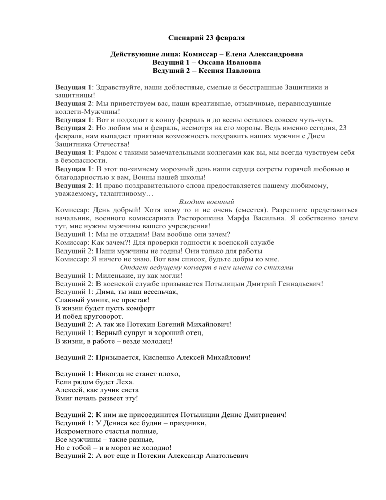 Сценарий 23 февраля Действующие лица: Комиссар – Елена Александровна Ведущий 1 – Оксана Ивановна Ведущий 2 – Ксения Павловна Ведущая 1: Здравствуйте, наши доблестные, смелые и бесстрашные Защитники и защитницы! Ведущая 2: Мы приветствуем вас, наши креативные, отзывчивые, неравнодушные коллеги-Мужчины! Ведущая 1: Вот и подходит к концу февраль и до весны осталось совсем чуть-чуть. Ведущая 2: Но любим мы и февраль, несмотря на его морозы. Ведь именно сегодня, 23 февраля, нам выпадает приятная возможность поздравить наших мужчин с Днем Защитника Отечества! Ведущая 1: Рядом с такими замечательными коллегами как вы, мы всегда чувствуем себя в безопасности. Ведущая 1: В этот по-зимнему морозный день наши сердца согреты горячей любовью и благодарностью к вам, Воины нашей школы! Ведущая 2: И право поздравительного слова предоставляется нашему любимому, уважаемому, талантливому… Входит военный Комиссар: День добрый! Хотя кому то и не очень (смеется). Разрешите представиться начальник, военного комиссариата Расторопкина Марфа Васильна. Я собственно зачем тут, мне нужны мужчины вашего учреждения! Ведущий 1: Мы не отдадим! Вам вообще они зачем? Комиссар: Как зачем?! Для проверки годности к военской службе Ведущий 2: Наши мужчины не годны! Они только для работы Комиссар: Я ничего не знаю. Вот вам список, будьте добры ко мне. Отдает ведущему конверт в нем имена со стихами Ведущий 1: Миленькие, ну как могли! Ведущий 2: В военской службе призывается Потылицын Дмитрий Геннадьевич! Ведущий 1: Дима, ты наш весельчак, Славный умник, не простак! В жизни будет пусть комфорт И побед круговорот. Ведущий 2: А так же Потехин Евгений Михайлович! Ведущий 1: Верный супруг и хороший отец, В жизни, в работе – везде молодец! Ведущий 2: Призывается, Кисленко Алексей Михайлович! Ведущий 1: Никогда не станет плохо, Если рядом будет Леха. Алексей, как лучик света Вмиг печаль развеет эту! Ведущий 2: К ним же присоединится Потылицин Денис Дмитриевич! Ведущий 1: У Дениса все будни – праздники, Искрометного счастья полные, Все мужчины – такие разные, Но с тобой – и в мороз не холодно! Ведущий 2: А вот еще и Потекин Александр Анатольевич Ведущий 1: Такой как ты поможет в жизни Поможет справиться в беде, Поможет все забыть обиды, Даст руку помощи везде. Ведущий 2: Да как же это! И Николая Сергеевича Макарова забирают Ведущий 1: Совет и помощь нужны бывают Поможет Коля – все это знают. Спокойный, мудрый, товарищ верный, Ты в нашем сердце, наш друг, поверь нам! Ведущий 2: И Владимиров Владимир Владимирович туда же Ведущий 1: Где он – там мир, партнерство, дружба, С ним спорить сложно и не нужно Отличный друг, супруг, отец. Владимир, право, молодец! Ведущий 2: Все по списку построены Ведущий 1: Вы посмотрите только на них! Ну говорю же не годны! Комиссар: Годны не годны это комиссия решит! Мое дело забрать, ваше отдать! Ведущий 1: Да люди добрые, что ж это твориться! Нам самим мужского внимания не хватает, а тут еще и отдавать кому то! Пусть лучше супружеский долг отдаю как положено, чем Отечественный! Комиссар: Дамочки, достаточно воплей! Служба зовет! Ведущий 2: А вы их проверьте сейчас, сразу увидите, качество солдат! Комиссар: Ладно, устроим экспресс тест! Ведущий 1: (обращается к мужчинам, полу шепотом) Мальчики, давайте как на пед совете, мол я не я, ничего не знаю. Комиссар: Отставить подсказки! Для начала проверим вашу ст