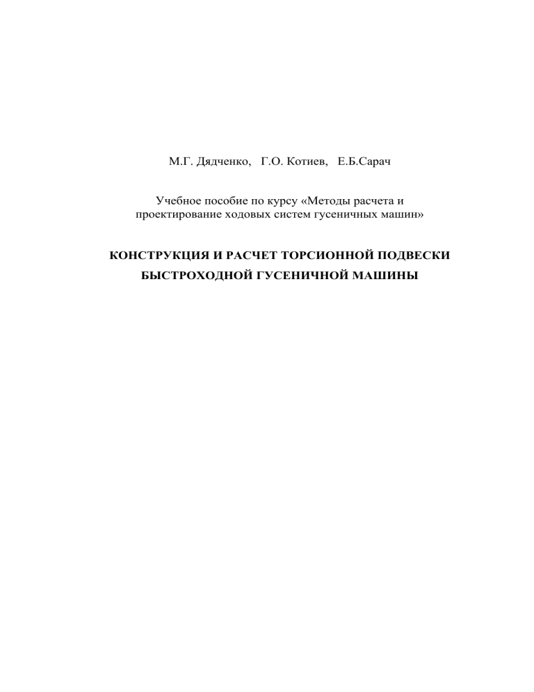 М.Г. Дядченко, Г.О. Котиев, Е.Б.Сарач Учебное пособие по курсу «Методы расчета и проектирование ходовых систем гусеничных машин» КОНСТРУКЦИЯ И РАСЧЕТ ТОРСИОННОЙ ПОДВЕСКИ БЫСТРОХОДНОЙ ГУСЕНИЧНОЙ МАШИНЫ Рассмотрены вопросы конструирования торсионных подвесок быстроходных гусеничных машин. В первом разделе дан обзор конструкций подвесок современных быстроходных гусеничных машин с подробным анализом элементов конструкции. Вторая и третья главы посвящены проектировочному расчету торсионной подвески. В них представлен порядок получения упругой и демпфирующей характеристик подвески, предложен метод уточнения характеристики демпфера с использованием программного комплекса «Trak», дан расчет на прочность элементов конструкции подвески. Для студентов специальности «Многоцелевые гусеничные машины и мобильные роботы». 1. Конструкции подвесок быстроходных гусеничных машин Обзор конструкций подвесок быстроходных гусеничных машин (БГМ) за все время их развития показывает большое разнообразие как использованных кинематических схем (направляющий аппарат), так и типов упругих и демпфирующих элементов. Однако в настоящее время на быстроходных гусеничных машинах в основном применяются независимые подвески с металлическими (торсионы, редко — пружины) или пневматическими упругими элементами и гидравлическими демпфирующими элементами (фрикционные демпферы не находят широкого применения). В то же время существует большое разнообразие конструктивных особенностей конкретных БГМ, что связано с компоновочными и технологическими требованиями, а также длительным жизненным циклом образцов бронетанковой техники. Вследствие того, что анализ существующих конструкций является неотъемлемой частью процесса проектирования подвески БГМ, обзору наиболее распространенных конструктивных решений посвящен данный раздел. 1.1. Опорные катки На большинстве современных отечественных БГМ применяются опорные катки с наружными резиновыми шинами (бандажами) (приложение рис. 1.1). Исключение составляют катки танка Т-64 (приложение рис. 1.9), оснащенные внутренней амортизацией. Резиновый массив в катках с внутренней амортизацией работает в более тяжелых условиях, что приводит к меньшей долговечности катков. Катки машин легкой категории, имеющие одинарные шины, выполняются стальными неразборными (приложение рис. 1.3). Они состоят из обода с привулканизированной шиной, ступицы и вваренных между ними дисков. Такая конструкция обеспечивает малую массу катка и его герметичность, что важно для плавающих машин. Отверстия, которые предусмотрены в дисках для сообщения внутренней полости с атмосферой при сварке, после сборки закрываются специальными заглушками. На машинах средней и тяжелой категорий сейчас используются разборные катки со сдвоенными шинами (приложение рис. 1.10, 1.11). Диски катков изготавливаются из легких сплавов. Катки основных танков имеют стальные ступицы, а у машин средней категории подшипники могут устанавливаться непосредственно в расточки дисков (приложение рис. 1.7). На машинах более ранних выпусков использовались неразборные стальные катки (приложение рис. 1.8). Они не требовали использования дополнительных стальных ступиц и реборд, но были значительно тяжелей современных легкосплавных. В связи с этим катки такой конструкции цел