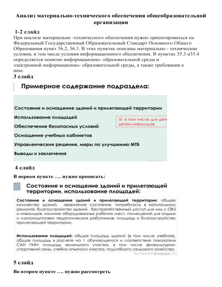 Анализ материально-технического обеспечения общеобразовательной организации 1-2 слайд При анализе материально -технического обеспечения нужно ориентироваться на Федеральный Государственный Образовательный Стандарт Основного Общего Образования пункт 36.2, 36.3. В этих пунктах описаны материально - технические условия, в том числе условия информационного обеспечения. В пунктах 35.3 и35.4 определяется понятие информационно- образовательной среды и электронной информационно- образовательной среды, а также требования к ним. 3 слайд 4 слайд В первом пункте …. нужно прописать: 5 слайд Во втором пункте …. нужно рассмотреть На слайде 8-9 вы можете увидеть примеры этого пункта 10 слайд В третий пункт входит 11 слайд На слайдах 12-13 можно посмотреть, как оформить этот пункт 14 слайд 15 слайд На этом слайде можно увидеть пример вывода. Спасибо за внимание!