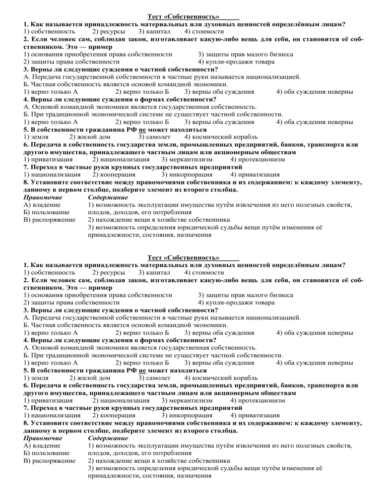 Тест «Собственность» 1. Как называется принадлежность материальных или духовных ценностей определённым лицам? 1) собственность 2) ресурсы 3) капитал 4) стоимости 2. Если человек сам, соблюдая закон, изготавливает какую-либо вещь для себя, он становится её собственником. Это — пример 1) основания приобретения права собственности 3) защиты прав малого бизнеса 2) защиты права собственности 4) купли-продажи товара 3. Верны ли следующие суждения о частной собственности? А. Передача государственной собственности в частные руки называется национализацией. Б. Частная собственность является основой командной экономики. 1) верно только А 2) верно только Б 3) верны оба суждения 4) оба суждения неверны 4. Верны ли следующие суждения о формах собственности? А. Основой командной экономики является государственная собственность. Б. При традиционной экономической системе не существует частной собственности. 1) верно только А 2) верно только Б 3) верны оба суждения 4) оба суждения неверны 5. В собственности гражданина РФ не может находиться 1) земля 2) жилой дом 3) самолет 4) космический корабль 6. Передача в собственность государства земли, промышленных предприятий, банков, транспорта или другого имущества, принадлежащего частным лицам или акционерным обществам 1) приватизация 2) национализация 3) меркантилизм 4) протекционизм 7. Переход в частные руки крупных государственных предприятий 1) национализация 2) кооперация 3) инкорпорация 4) приватизация 8. Установите соответствие между правомочиями собственника и их содержанием: к каждому элементу, данному в первом столбце, подберите элемент из второго столбца. Правомочие Содержание А) владение 1) возможность эксплуатации имущества путём извлечения из него полезных свойств, Б) пользование плодов, доходов, его потребления В) распоряжение 2) нахождение вещи в хозяйстве собственника 3) возможность определения юридической судьбы вещи путём изменения её принадлежности, состояния, назначения Тест «Собственность» 1. Как называется принадлежность материальных или духовных ценностей определённым лицам? 1) собственность 2) ресурсы 3) капитал 4) стоимости 2. Если человек сам, соблюдая закон, изготавливает какую-либо вещь для себя, он становится её собственником. Это — пример 1) основания приобретения права собственности 3) защиты прав малого бизнеса 2) защиты права собственности 4) купли-продажи товара 3. Верны ли следующие суждения о частной собственности? А. Передача государственной собственности в частные руки называется национализацией. Б. Частная собственность является основой командной экономики. 1) верно только А 2) верно только Б 3) верны оба суждения 4) оба суждения неверны 4. Верны ли следующие суждения о формах собственности? А. Основой командной экономики является государственная собственность. Б. При традиционной экономической системе не существует частной собственности. 1) верно только А 2) верно только Б 3) верны оба суждения 4) оба суждения неверны 5. В собственности гражданина РФ не может находиться 1) земля 2) жилой дом 3) самолет 4) космический корабль 6. Передача в собственность государства земли, промышленных предприятий, банков, транспорта или другого имущества, принадлежащего частным лицам или акционерным обществам 1) приватизация 2) национализация 3) меркантилизм 4) протекционизм 7. Переход в частные руки крупных