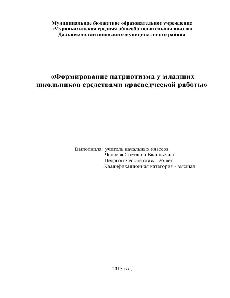Муниципальное бюджетное образовательное учреждение «Муравьихинская средняя общеобразовательная школа» Дальнеконстантиновского муниципального района «Формирование патриотизма у младших школьников средствами краеведческой работы» Выполнила: учитель начальных классов Чанаева Светлана Васильевна Педагогический стаж - 26 лет Квалификационная категория - высшая 2015 год Введение «Сделать как можно больше пользы моему Отечеству – вот единственная цель моей жизни, и к ней-то я должен направлять все свои способности» К.Д. Ушинский Патриотическое и гражданское воспитание – сложный процесс, требующий продуманной системы, органической связи со всеми сторонами формирования личности ребенка. Сегодня очень важно воспитывать молодое поколение на исторических традициях нашего народа, на героических подвигах его сынов и дочерей, на опыте великих свершений. Необходимо формировать у подрастающего поколения беззаветную любовь к Родине, делу мира, готовность к защите Отечества, несмотря на то, что эти чувства в нашем обществе подвергаются серьезным испытаниям. Изменилось Отечество. Пересматривается его прошлое. Тревожит настоящее и будущее. Задача педагога – воспитание уважительного, бережного отношения к истории народа. Это качество гражданина хорошо выразил в свое время А. С. Пушкин: «Клянусь честью, что ни за что на свете я не хотел бы переменить Отечество или иметь другую историю, кроме истории наших предков». Воспитать человека – гражданина, преданного своей стране, стремящегося к приумножению славы своего Отечества, – в этом одна из главных проблем современного образования. Вопросы патриотического воспитания подрастающего поколения всегда волновали выдающихся педагогов и общественных деятелей прошлого. Они поднимались в трудах В.Г.Белинского, Е.Р.Дашковой, Н.А.Добролюбова, Н.М. Карамзина, М.В.Ломоносова, А.Н.Радищева, Л.Н.Толстого, К.Д.Ушинского, Н.Г. Чернышевского. Они заостряли внимание на том, как важно воспитать сознательных граждан, способных отстаивать интересы государства, любящих свое Отечество. Их идеи нашли свое отражение в современных концепциях патриотического воспитания подрастающего 3 поколения. Проблема патриотического воспитания младших школьников находилась в поле зрения и советских педагогов (Н.С. Крупской, А.С.Макаренко, В.А. Сухомлинского и др.). В настоящее время в этой области ведутся исследования по многим направлениям. Отчетливо прослеживается идея патриотического воспитания в работах Т.Н. Дороновой, в исследовании С.Н.Николаевой патриотическое воспитание рассматривается в русле экологического воспитания. Исследователи С.А.Козлова и Т.А.Куликова предлагают одно из решений проблемы воспитания патриотизма у детей – младшего школьного возраста через познание Родины – России. Изучаются вопросы основ гражданственности (Е.А.Казаева), краеведения, как средство патриотического воспитания (Л.А.Кондрыкинская). Т.С.Комарова, Т.А.Ротанова, В.И.Логинова, Т. И.Бабаева, Н.А.Ноткина, О.Л.Князева, М.Д.Маханева, Е.В.Пчелинцева, Л.Е. Никонова, Е.И.Корнеева и другие делают акцент на приобщение детей к культурному наследию народа. Важной составной частью работы по патриотическому воспитанию младших школьников является приобщение их к традициям и обычаям семьи, школы, села, области, страны. Дети должны не только знать 