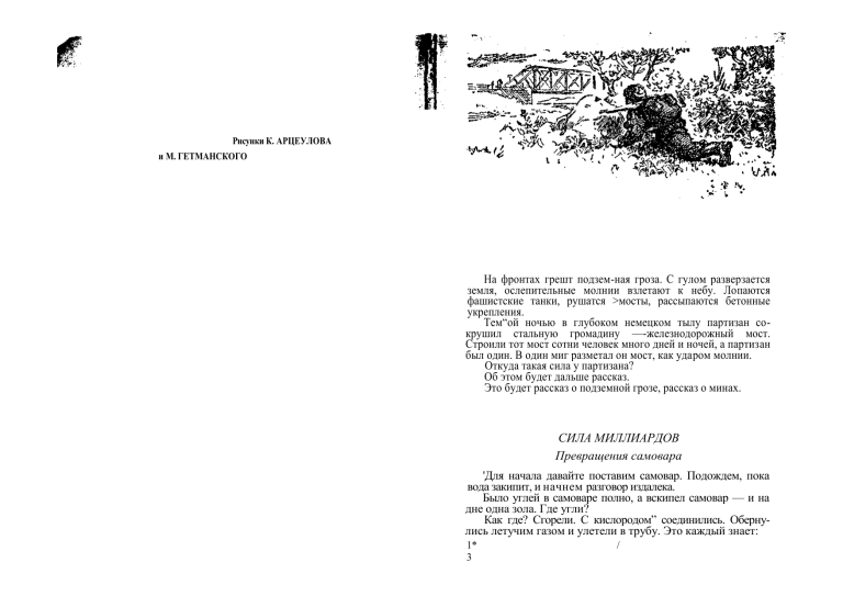 Рисунки К. АРЦЕУЛОВА и М. ГЕТМАНСКОГО На фронтах грешт подзем-ная гроза. С гулом разверзается земля, ослепительные молнии взлетают к небу. Лопаются фашистские танки, рушатся >мосты, рассыпаются бетонные укрепления. Тем“ой ночью в глубоком немецком тылу партизан сокрушил стальную громадину —-железнодорожный мост. Строили тот мост сотни человек много дней и ночей, а партизан был один. В один миг разметал он мост, как ударом молнии. Откуда такая сила у партизана? Об этом будет дальше рассказ. Это будет рассказ о подземной грозе, рассказ о минах. СИЛА МИЛЛИАРДОВ Превращения самовара 'Для начала давайте поставим самовар. Подождем, пока вода закипит, и начнем разговор издалека. Было углей в самоваре полно, а вскипел самовар — и на дне одна зола. Где угли? Как где? Сгорели. С кислородом” соединились. Обернулись летучим газом и улетели в трубу. Это каждый знает: 1* 3 / А кто не поверит, те могут газ.лзловить. Газ, конечно, не конь, в упряжку его не возьмешь. Ну, а если сплести упряжку из множества тонких нитей, да так плотно, чтобы ни щелки между ними не оставалось,— из такой упряжки и газ, пожалуй, не ускользнет. Если взять, говоря проще, мешок поплотнее и побольше и пристроить его к самоварной трубе, станет мешок от газов толстеть и раздуваться. Вздуется огромным шаром, величиной с комнату. А теперь держись! Взмоет шар квер,-ху, да и нас с-собйй унесет. Вот сколько газов получилось из самоварных углей. А нельзя ли побыстрее вскипятить самовар? Можно. Дайте больше воздуху в топку. Садитесь рядом и дуйте в поддувало. Весело загудит огонь в трубе. Быстрее сгорят угли, быстрей закипит вода. Это понятно. Жадная воздушная струя лижет угли. Со всех сторон подступает к ним кислород. Потому такое жаркое пламя. И если по-серьезному поставить дело и приделать к самовару -насоо, чтоб качал в поддувало горячий воздух, то такой нестерпимый, жар разовьется в топке, что не только вода — железо расплавится'и закипит в самоваре. Самовар превратится в домну — маленькую доменную печь. А нельзя ли еще быстрее? Трудное это дело. Уголь пронизан по толще множеством тонких, тоньше волоса, канальцев. В этих канальцах нет огня. Мало воздуху. Задыхается огонь в канальцах. Уголь горит снаружи, медленно, слой за слоем. Вот если б воздух в самоваре сжать, чтоб и в канальцы проник кислород, чтоб и в толще загорелся уголь, быстрее пошло бы дело. Только как его сожмешь в самоваре? Но не будем от этого отступаться. Можно, слышалп мы, воздух так охладить, что осядет он жидкими каплями, точно пар из самовара на холодном блюдце. Существуют для этого холодильные машины. Получается жидкий воздух. В одну кастрюлю можно собрать воздух из целой комнаты. Подольем жидкого воздуха в самовар с углем. Пропитается воздухом уголь, точно губка водой; засосет его в тончайшие канальцы. Поднесем лучину. Взрыв! Самовар — вдребезги. Окна и двери — вон! Самовар превратился в мину. Непокорный состав Получилось нечаянно взрывчатое вещество: В такую тесную смесь перемешалось горючее с кислородом, что сгорела она в один миг — какое там>! — в одну тридцатитысячную мига. В тридцать тысяч раз быстрее, чем успеет мигнуть человек. В одну стотысячную секунды превратились угли в раскаленный газ. Молниеносно исчезли угли, и остался в трубе крепко сжатый газовый кулак. Расширяясь, рванулись газы по сторонам, двинули в стенки труб