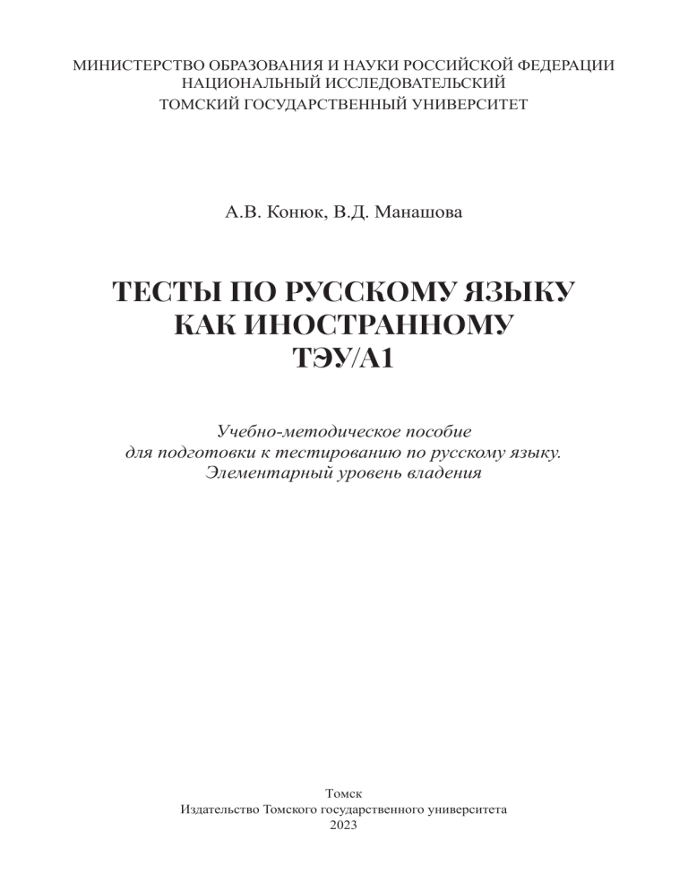МИНИСТЕРСТВО ОБРАЗОВАНИЯ И НАУКИ РОССИЙСКОЙ ФЕДЕРАЦИИ НАЦИОНАЛЬНЫЙ ИССЛЕДОВАТЕЛЬСКИЙ ТОМСКИЙ ГОСУДАРСТВЕННЫЙ УНИВЕРСИТЕТ А.В. Конюк, В.Д. Манашова ТЕСТЫ ПО РУССКОМУ ЯЗЫКУ КАК ИНОСТРАННОМУ ТЭУ/А1 Учебно-методическое пособие для подготовки к тестированию по русскому языку. Элементарный уровень владения Томск Издательство Томского государственного университета 2023 1 УДК 811.161.1’ Рецензент – канд. филол. наук, доцент кафедры русского языка ТГУ Татьяна Борисовна Банкова К655 Конюк А.В., Манашова В.Д. Тесты по русскому языку как иностранному ТЭУ/А1: Пособие для подготовки к тестированию по русскому языку. Элементарный уровень владения. – Томск: Издательство Томского университета, 2023. – 40 с. Пособие предназначено для иностранных граждан, которые изучают русский язык как иностранный и планируют сдать экзамен (ТРКИ) на элементарный уровень владения (ТЭУ/А1), а также для преподавателей, осуществляющих подготовку к нему. © Конюк А.В., Манашова В.Д., 2023 © Томский государственный университет, 2023 2 СОДЕРЖАНИЕ Общая информация ...................................................................................................4 Субтест 1. Лексика. Грамматика..............................................................................7 Инструкция по выполнению субтеста...................................................................7 Рабочая матрица.....................................................................................................12 Ключи......................................................................................................................13 Субтест 2. Чтение.......................................................................................................14 Инструкция по выполнению субтеста.................................................................14 Рабочая матрица.....................................................................................................19 Ключи......................................................................................................................20 Субтест 3. Аудирование............................................................................................21 Инструкция по выполнению субтеста.................................................................21 Рабочая матрица.....................................................................................................24 Ключи......................................................................................................................25 Звучащие материалы к субтесту АУДИРОВАНИЕ...........................................26 Субтест 4. Письмо......................................................................................................31 ВАРИАНТ 1............................................................................................................31 Инструкция по выполнению субтеста.................................................................31 Примерный ответ..................................................................................................32 ВАРИАНТ 2............................................................................................................32 Инструкция по выполнению субтеста.................................................................32 Примерный ответ..................................................................................................33 Контрольная матрица для преподавателя.....................................................34 Субтест 5. Говорение.................................................................................................35 Инструкция по выполнению субтеста.................................................................35 Примерные ответы................................................................................................36 Контрольная матрица для преподавателя.....................................................38 3 ОБЩАЯ ИНФОРМАЦИЯ ТЭУ/А1 − Тест по русскому языку как иностранному. Элементарный уровень. Успешное прохождение предлагаемого теста даёт возможность получить сертификат элементарного уровня общего владения русским языком как иностранным. Данный уровень является достаточным для удовлетворения элементарных коммуникативных потребностей при общении в социально-бытовой, социально-культурной, учебно-проф