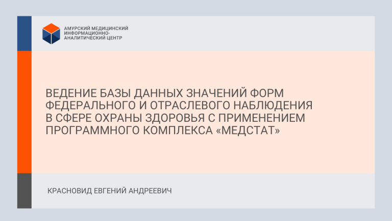 ВЕДЕНИЕ БАЗЫ ДАННЫХ ЗНАЧЕНИЙ ФОРМ ФЕДЕРАЛЬНОГО И ОТРАСЛЕВОГО НАБЛЮДЕНИЯ В СФЕРЕ ОХРАНЫ ЗДОРОВЬЯ С ПРИМЕНЕНИЕМ ПРОГРАММНОГО КОМПЛЕКСА «МЕДСТАТ» КРАСНОВИД ЕВГЕНИЙ АНДРЕЕВИЧ 2 ОСНОВНЫЕ ЭТАПЫ ВЗАИМОДЕЙСТВИЯ ПРИ ФОРМИРОВАНИИ И СБОРЕ СТАТИСТИЧЕСКОЙ ОТЧЕТНОСТИ База данных в формате DBF Передача заполненных и проверенных статистических форм по каналам связи Медицинская организация МИАЦ Очное согласование 3 ЭТАПЫ РАБОТЫ МЕДИЦИНСКОЙ ОРГАНИЗАЦИИ В ПРОГРАММНОМ КОМПЛЕКСЕ «МЕДСТАТ» Заполнение данными форм статистического наблюдения Проверка корректности заполнения форм Заполнение реквизитов организации Передача DBF файла базы данных в ГБУЗ АО «АМИАЦ» Выгрузка базы данных в формате DBF Печать заполненных бланков статистических форм 4 РАБОТА В ПРОГРАММОМ КОМПЛЕКСЕ «МЕДСТАТ»: ЗАПОЛНЕНИЕ ДАННЫМИ ФОРМ СТАТИСТИЧЕСКОГО НАБЛЮДЕНИЯ Пункт меню Оператор \ Ввод и корректура \ Табличный ввод 1. Выбор территории 2. Выбор формы 3. Выбор таблицы 4. Кнопка «Вызвать таблицу» 5 РАБОТА В ПРОГРАММОМ КОМПЛЕКСЕ «МЕДСТАТ»: ПРОВЕРКА КОРРЕКТНОСТИ ЗАПОЛНЕНИЯ ФОРМ Пункт меню Оператор \ Контроль 1. Выбор территории 2. Выбор типа контроля 3. Выбор формы 4. Кнопка «Выполнить по одной форме» 6 РАБОТА В ПРОГРАММОМ КОМПЛЕКСЕ «МЕДСТАТ»: ПРОВЕРКА КОРРЕКТНОСТИ ЗАПОЛНЕНИЯ ФОРМ Ведомость результата контроля формы: 7 РАБОТА В ПРОГРАММОМ КОМПЛЕКСЕ «МЕДСТАТ»: ПРОВЕРКА КОРРЕКТНОСТИ ЗАПОЛНЕНИЯ ФОРМ Как читать контроли? 15,1000,1:16,09>15,1000,1:16,10 15 , 1000 , 1:16 , 09 форма таблица строка графа Форма: 15, Таблица: 1000, Строки: с 1 по 16, Графа: 9 8 РАБОТА В ПРОГРАММОМ КОМПЛЕКСЕ «МЕДСТАТ»: ПРОВЕРКА КОРРЕКТНОСТИ ЗАПОЛНЕНИЯ ФОРМ 30,1001,1:139.410:412.341:349.371:373,03 30, 1001, 1:139.410:412.341:349.371:373, 03 9 РАБОТА В ПРОГРАММОМ КОМПЛЕКСЕ «МЕДСТАТ»: ПРОВЕРКА КОРРЕКТНОСТИ ЗАПОЛНЕНИЯ ФОРМ Выражение для номера строки: 1:3 проверить с первой по третью 1.3.5. перечисление 1+2-3 вычисление 1П6 сумма с 1 по 5 строки 1+5 сумма строк Номер графы: Номер графы может перечислятся как номер строк: 01:05, 01.02.04 Одновременная установка для строк s1:s2 и граф g1:g2 не допускается (где s1 и s2 номера строк, а g1 и g2 - номера граф). В отличие от строк все вычисления для граф описываются отдельно. 10 РАБОТА В ПРОГРАММОМ КОМПЛЕКСЕ «МЕДСТАТ»: ЗАПОЛНЕНИЕ РЕКВИЗИТОВ ОРГАНИЗАЦИИ Пункт меню Оператор \ Распечатка из БД заполненных бланков отчетных форм \ Заполнить реквизиты 11 РАБОТА В ПРОГРАММОМ КОМПЛЕКСЕ «МЕДСТАТ»: ПЕЧАТЬ ЗАПОЛНЕННЫХ БЛАНКОВ СТАТИСТИЧЕСКИХ ФОРМ Пункт меню Оператор \ Распечатка из БД заполненных бланков отчетных форм \ Выполнить 1. Выбор формы 2. Выбор территории 3. Кнопка «Выполнить» 12 РАБОТА В ПРОГРАММОМ КОМПЛЕКСЕ «МЕДСТАТ»: ПЕЧАТЬ ЗАПОЛНЕННЫХ БЛАНКОВ СТАТИСТИЧЕСКИХ ФОРМ 13 РАБОТА В ПРОГРАММОМ КОМПЛЕКСЕ «МЕДСТАТ»: ВЫГРУЗКА БАЗЫ ДАННЫХ В ФОРМАТЕ DBF Пункт меню Оператор \ Обмен базами\ Выгрузить из БД MEDСТАТ 1. Выбор территории 2. Кнопка «Территория (все формы), выгрузка для ИАЦ» 14 РАБОТА В ПРОГРАММОМ КОМПЛЕКСЕ «МЕДСТАТ»: ПЕРЕДАЧА DBF ФАЙЛА БАЗЫ ДАННЫХ В ГБУЗ АО «АМИАЦ» Почта VipNet Адрес – АМИАЦ (Administrator) Обязательная пометка в теме: «МЕДСТАТ – «Наименование медицинской организации» (например: «МЕДСТАТ – ГАУЗ АО «АОКБ») СПАСИБО ЗА ВНИМАНИЕ