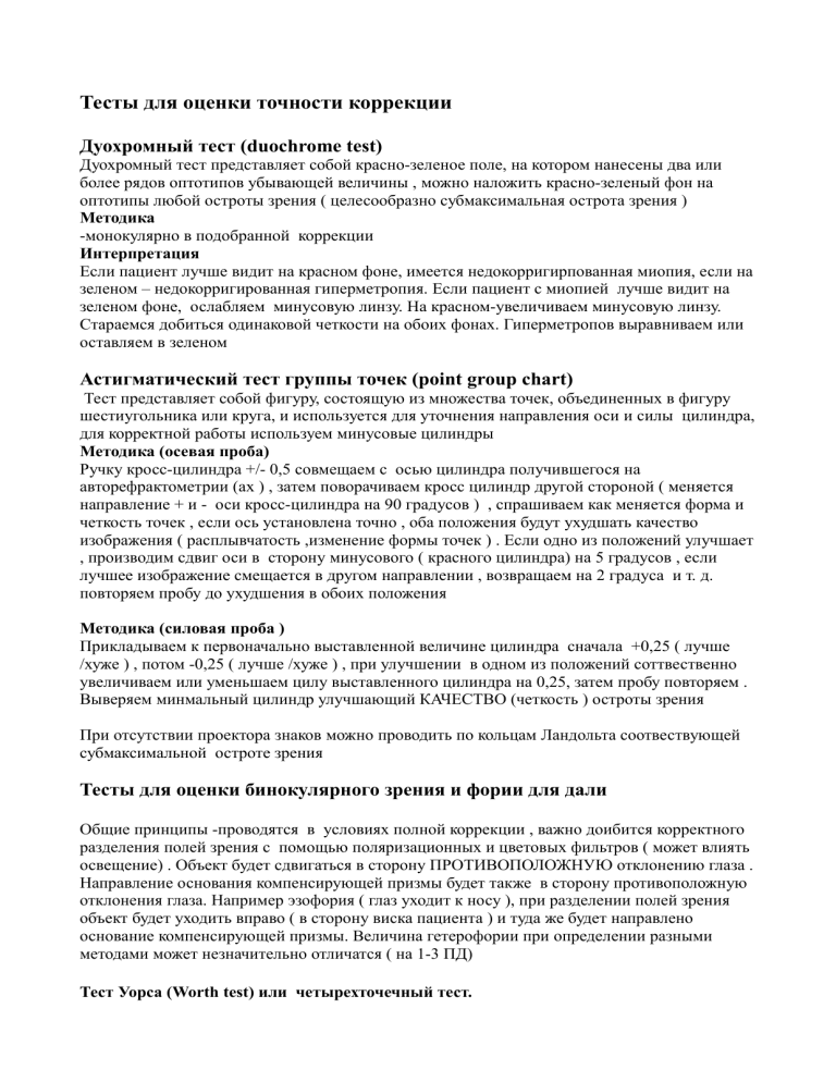 Тесты для оценки точности коррекции Дуохромный тест (duochrome test) Дуохромный тест представляет собой красно-зеленое поле, на котором нанесены два или более рядов оптотипов убывающей величины , можно наложить красно-зеленый фон на оптотипы любой остроты зрения ( целесообразно субмаксимальная острота зрения ) Методика -монокулярно в подобранной коррекции Интерпретация Если пациент лучше видит на красном фоне, имеется недокорригирпованная миопия, если на зеленом – недокорригированная гиперметропия. Если пациент с миопией лучше видит на зеленом фоне, ослабляем минусовую линзу. На красном-увеличиваем минусовую линзу. Стараемся добиться одинаковой четкости на обоих фонах. Гиперметропов выравниваем или оставляем в зеленом Астигматический тест группы точек (point group chart) Тест представляет собой фигуру, состоящую из множества точек, объединенных в фигуру шестиугольника или круга, и используется для уточнения направления оси и силы цилиндра, для корректной работы используем минусовые цилиндры Методика (осевая проба) Ручку кросс-цилиндра +/- 0,5 совмещаем с осью цилиндра получившегося на авторефрактометрии (ax ) , затем поворачиваем кросс цилиндр другой стороной ( меняется направление + и - оси кросс-цилиндра на 90 градусов ) , спрашиваем как меняется форма и четкость точек , если ось установлена точно , оба положения будут ухудшать качество изображения ( расплывчатость ,изменение формы точек ) . Если одно из положений улучшает , производим сдвиг оси в сторону минусового ( красного цилиндра) на 5 градусов , если лучшее изображение смещается в другом направлении , возвращаем на 2 градуса и т. д. повторяем пробу до ухудшения в обоих положения Методика (силовая проба ) Прикладываем к первоначально выставленной величине цилиндра сначала +0,25 ( лучше /хуже ) , потом -0,25 ( лучше /хуже ) , при улучшении в одном из положений соттвественно увеличиваем или уменьшаем цилу выставленного цилиндра на 0,25, затем пробу повторяем . Выверяем минмальный цилиндр улучшающий КАЧЕСТВО (четкость ) остроты зрения При отсутствии проектора знаков можно проводить по кольцам Ландольта соотвествующей субмаксимальной остроте зрения Тесты для оценки бинокулярного зрения и фории для дали Общие принципы -проводятся в условиях полной коррекции , важно доибится корректного разделения полей зрения с помощью поляризационных и цветовых фильтров ( может влиять освещение) . Объект будет сдвигаться в сторону ПРОТИВОПОЛОЖНУЮ отклонению глаза . Направление основания компенсирующей призмы будет также в сторону противоположную отклонения глаза. Например эзофория ( глаз уходит к носу ), при разделении полей зрения объект будет уходить вправо ( в сторону виска пациента ) и туда же будет направлено основание компенсирующей призмы. Величина гетерофории при определении разными методами может незначительно отличатся ( на 1-3 ПД) Тест Уорса (Worth test) или четырехточечный тест. Тест служит для оценки характера зрения при двух открытых глазах. Смотрим на него через красно-зеленые фильтры. При правильном разделении полей зрения два зеленых креста и круг виден левым глазом через зеленое стекло ( четырехточечный 3 круга : два зеленых и белый) , ромб и круг правым глазом через красное стекло ( четырехточечный 2 круга : красный и белый) . Обязательна проверка корректности разделения в условиях различной осве