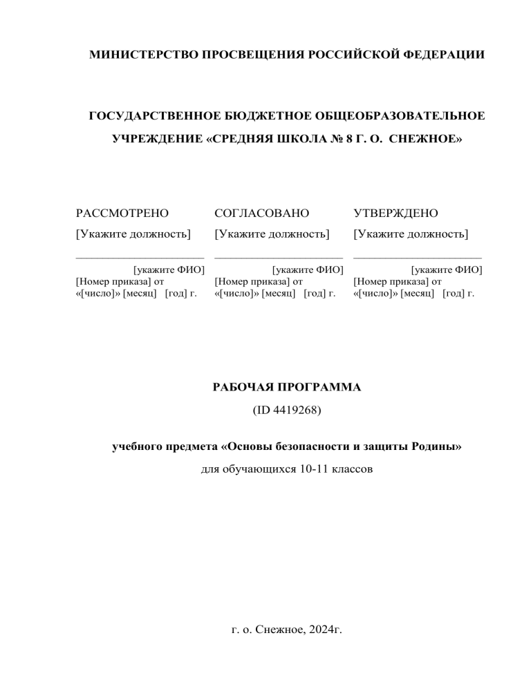 МИНИСТЕРСТВО ПРОСВЕЩЕНИЯ РОССИЙСКОЙ ФЕДЕРАЦИИ ГОСУДАРСТВЕННОЕ БЮДЖЕТНОЕ ОБЩЕОБРАЗОВАТЕЛЬНОЕ УЧРЕЖДЕНИЕ «СРЕДНЯЯ ШКОЛА № 8 Г. О. СНЕЖНОЕ» РАССМОТРЕНО СОГЛАСОВАНО УТВЕРЖДЕНО [Укажите должность] [Укажите должность] [Укажите должность] ________________________ ________________________ ________________________ [укажите ФИО] [укажите ФИО] [укажите ФИО] [Номер приказа] от [Номер приказа] от [Номер приказа] от «[число]» [месяц] [год] г. «[число]» [месяц] [год] г. «[число]» [месяц] [год] г. РАБОЧАЯ ПРОГРАММА (ID 4419268) учебного предмета «Основы безопасности и защиты Родины» для обучающихся 10-11 классов г. о. Снежное, 2024г. ПОЯСНИТЕЛЬНАЯ ЗАПИСКА Рабочая программа по учебному предмету "Основы безопасности и защиты Родины" (далее - ОБЗР) разработана на основе требований к результатам освоения образовательной программы среднего общего образования, представленных в ФГОС СОО, федеральной рабочей программы воспитания и предусматривает непосредственное применение при реализации ОП СОО. Программа ОБЗР позволит учителю построить освоение содержания в логике последовательного нарастания факторов опасности от опасной ситуации до чрезвычайной ситуации и разумного взаимодействия человека с окружающей средой, учесть преемственность приобретения обучающимися знаний и формирования у них умений и навыков в области безопасности жизнедеятельности. Программа ОБЗР в методическом плане обеспечивает реализацию практикоориентированного подхода в преподавании ОБЗР, системность и непрерывность приобретения обучающимися знаний и формирования у них навыков в области безопасности жизнедеятельности при переходе с уровня основного общего образования; помогает педагогу продолжить освоение содержания материала в логике последовательного нарастания факторов опасности: опасная ситуация, чрезвычайная ситуация и разумного построения модели индивидуального и группового безопасного поведения в повседневной жизни с учётом актуальных вызовов и угроз в природной, техногенной, социальной и информационной сферах. Программа ОБЗР обеспечивает: 1. формирование личности выпускника с высоким уровнем культуры и мотивации ведения безопасного, здорового и экологически целесообразного образа жизни; 2. достижение выпускниками базового уровня культуры безопасности жизнедеятельности, соответствующего интересам обучающихся и потребностям общества в формировании полноценной личности безопасного типа; 3. взаимосвязь личностных, метапредметных и предметных результатов освоения учебного предмета ОБЗР на уровнях основного общего и среднего общего образования; 4. подготовку выпускников к решению актуальных практических задач безопасности жизнедеятельности в повседневной жизни. ОБЩАЯ ХАРАКТЕРИСТИКА УЧЕБНОГО ПРЕДМЕТА «ОСНОВЫ БЕЗОПАСНОСТИ И ЗАЩИТЫ РОДИНЫ» В программе ОБЗР содержание учебного предмета ОБЗР структурно представлено одиннадцатью модулями (тематическими линиями), обеспечивающими системность и непрерывность изучения предмета на уровнях основного общего и среднего общего образования: Модуль № 1. «Безопасное и устойчивое развитие личности, общества, государства». Модуль № 2. «Основы военной подготовки». Модуль № 3. «Культура безопасности жизнедеятельности в современном обществе». Модуль № 4. «Безопасность в быту». Модуль № 5. «Безопасность на транспорте». Модуль № 6. «Безопасность в обще