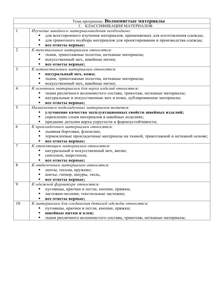 Тема программы: Волокнистые материалы 1. КЛАССИФИКАЦИЯ МАТЕРИАЛОВ 1 2 3 4 5 6 7 8 9 10 Изучение швейного материаловедения необходимо: для всестороннего изучения материалов, применяемых для изготовления одежды; для грамотного подбора материалов для проектирования и производства одежды; все ответы верные; К текстильным материалам относятся: ткани, трикотажные полотна, нетканые материалы; искусственный мех, швейные нитки; все ответы верные; К нетекстильным материалам относятся: натуральный мех, кожа; ткани, трикотажные полотна, нетканые материалы; искусственный мех, швейные нитки; К основным материалам для верха изделий относятся: ткани различного волокнистого состава, трикотаж, нетканые материалы; натуральные и искусственные мех и кожа, дублированные материалы; все ответы верные; Назначением подкладочных материалов является: улучшение качества эксплуатационных свойств швейных изделий; скрепление слоев материалов в швейных изделиях; придание деталям верха упругости и формоустойчивости; К прокладочным материалам относятся: льняная бортовка, флизелин; термоклеевые прокладочные материалы на тканой, трикотажной и нетканой основе; все ответы верные; К утепляющим материалам относятся: натуральный и искусственный мех, ватин; синтепон, шерстепон; все ответы верные; К отделочным материалам относятся: ленты, тесьма, кружево; шитье, гипюр, шнуры, тюль; все ответы верные; К одежной фурнитуре относятся: пуговицы, крючки и петли, кнопки, пряжки; застежки-молнии, текстильные застежки; все ответы верные; К материалам для соединения деталей одежды относятся: пуговицы, крючки и петли, кнопки, пряжки; швейные нитки и клеи; ткани различного волокнистого состава, трикотаж, нетканые материалы; 2. КЛАССИФИКАЦИЯ ВОЛОКОН Гибкие, тонкие и прочные тела, длина которых во много раз превышает их поперечные размеры, называется: 1 волокно; целлюлоза; кератин; Волокна, которые используются для изготовления пряжи, ниток, трикотажа, нетканых материалов, называются: 2 элементарное волокно; текстильное волокно; все ответы верные; Волокна, которые без разрушения делятся в продольном направлении, называются: элементарное волокно; 3 текстильное волокно; все ответы верные; Техническими волокнами называются: волокна, состоящие из скрепленных элементарных волокон; 4 лен, пенька, джут; все ответы верные; К натуральным волокнам относятся: волокна, создаваемые самой природой; 5 растительного, животного, минерального происхождения; все ответы верные; К химическим волокнам относятся: волокна, создаваемые самой природой; 6 волокна, создаваемые в заводских условиях путем их формования из полимеров или неорганических веществ; короткие волокна; Короткие искусственные и синтетические волокна называются: штапельные; 7 целлюлоза; кератин; Сложные органические соединения, из которых состоят все растительные волокна, называется: 8 целлюлоза; кератин; асбест; Все животные волокна содержат: белковое соединение шерсти - кератин; 9 белковые соединения натурального шелка – фиброин и серицин; все ответы верные; Синтетические волокна характеризуются: синтезированием низкомолекулярных продуктов переработки каменного угля, нефти, 10 газов; составом из полимеров (капрон, нитрон, хлорин, винол, спандекс); все ответы верные; Искусственные волокна характеризуются: химической переработкой отхо