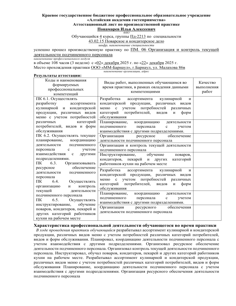 Краевое государственное бюджетное профессиональное образовательное учреждение «Алтайская академия гостеприимства» Аттестационный лист по производственной практике Понамарев Илья Алексеевич ФИО Обучающийся 4 курса, группы Пд-2213 по специальности 43.02.15 Поварское и кондитерское дело шифр, наименование специальности успешно прошел производственную практику по ПМ. 06 Организация и контроль текущей деятельности подчиненного персонала наименование профессионального модуля в объеме 108 часов (3 недели) с «02» декабря 2025 г. по «22» декабря 2025 г. Место прохождения практики ООО «ММ-Барнаул», г.Барнаул, ул. Малахова 86в наименование организации, адрес Результаты аттестации: Коды и наименования формируемых профессиональных компетенций ПК 6.1. Осуществлять разработку ассортимента кулинарной и кондитерской продукции, различных видов меню с учетом потребностей различных категорий потребителей, видов и форм обслуживания ПК 6.2. Осуществлять текущее планирование, координацию деятельности подчиненного персонала с учетом взаимодействия с другими подразделениями. ПК 6.3. Организовывать ресурсное обеспечение деятельности подчиненного персонала ПК 6.4. Осуществлять организацию и контроль текущей деятельности подчиненного персонала ПК 6.5. Осуществлять инструктирование, обучение поваров, кондитеров, пекарей и других категорий работников кухни на рабочем месте Виды работ, выполненных обучающимся во время практики, в рамках овладения данными компетенциями Качество выполнения работ Разработка ассортимента кулинарной и кондитерской продукции, различных видов меню с учетом потребностей различных категорий потребителей, видов и форм обслуживания Планирование, координацию деятельности подчиненного персонала с учетом взаимодействия с другими подразделениями. Организация ресурсное обеспечение деятельности подчиненного персонала Организация и контроль текущей деятельности подчиненного персонала Инструктирование, обучение поваров, кондитеров, пекарей и других категорий работников кухни на рабочем месте Разработка ассортимента кулинарной и кондитерской продукции, различных видов меню с учетом потребностей различных категорий потребителей, видов и форм обслуживания Планирование, координацию деятельности подчиненного персонала с учетом взаимодействия с другими подразделениями. Организация ресурсного обеспечения деятельности подчиненного персонала Характеристика профессиональной деятельности обучающегося во время практики В ходе проведения практики обучающийся разрабатывал ассортимент кулинарной и кондитерской продукции, различных видов меню с учетом потребностей различных категорий потребителей, видов и форм обслуживания. Планировал, координацию деятельности подчиненного персонала с учетом взаимодействия с другими подразделениями. Организовал ресурсное обеспечение деятельности подчиненного персонала. Организовал контроль текущей деятельности подчиненного персонала. Инструктировал, обучал поваров, кондитеров, пекарей и других категорий работников кухни на рабочем месте. Разрабатывал ассортимент кулинарной и кондитерской продукции, различных видов меню с учетом потребностей различных категорий потребителей, видов и форм обслуживания Планирование, координацию деятельности подчиненного персонала с учетом
