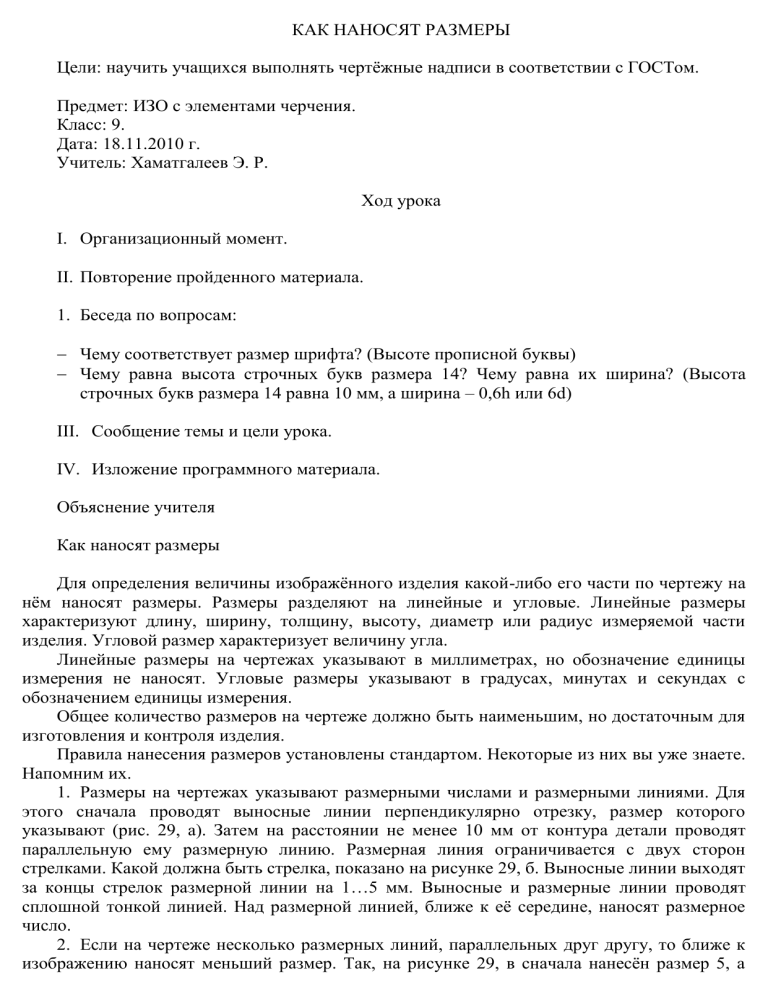 КАК НАНОСЯТ РАЗМЕРЫ Цели: научить учащихся выполнять чертёжные надписи в соответствии с ГОСТом. Предмет: ИЗО с элементами черчения. Класс: 9. Дата: 18.11.2010 г. Учитель: Хаматгалеев Э. Р. Ход урока I. Организационный момент. II. Повторение пройденного материала. 1. Беседа по вопросам: Чему соответствует размер шрифта? (Высоте прописной буквы) Чему равна высота строчных букв размера 14? Чему равна их ширина? (Высота строчных букв размера 14 равна 10 мм, а ширина – 0,6h или 6d) III. Сообщение темы и цели урока. IV. Изложение программного материала. Объяснение учителя Как наносят размеры Для определения величины изображённого изделия какой-либо его части по чертежу на нём наносят размеры. Размеры разделяют на линейные и угловые. Линейные размеры характеризуют длину, ширину, толщину, высоту, диаметр или радиус измеряемой части изделия. Угловой размер характеризует величину угла. Линейные размеры на чертежах указывают в миллиметрах, но обозначение единицы измерения не наносят. Угловые размеры указывают в градусах, минутах и секундах с обозначением единицы измерения. Общее количество размеров на чертеже должно быть наименьшим, но достаточным для изготовления и контроля изделия. Правила нанесения размеров установлены стандартом. Некоторые из них вы уже знаете. Напомним их. 1. Размеры на чертежах указывают размерными числами и размерными линиями. Для этого сначала проводят выносные линии перпендикулярно отрезку, размер которого указывают (рис. 29, а). Затем на расстоянии не менее 10 мм от контура детали проводят параллельную ему размерную линию. Размерная линия ограничивается с двух сторон стрелками. Какой должна быть стрелка, показано на рисунке 29, б. Выносные линии выходят за концы стрелок размерной линии на 1…5 мм. Выносные и размерные линии проводят сплошной тонкой линией. Над размерной линией, ближе к её середине, наносят размерное число. 2. Если на чертеже несколько размерных линий, параллельных друг другу, то ближе к изображению наносят меньший размер. Так, на рисунке 29, в сначала нанесён размер 5, а затем 26, чтобы выносные и размерные линии на чертеже не пересекались. Расстояние между параллельными размерными линиями должно быть не менее 7 мм. 3. Для обозначения диаметра перед размерным числом наносят специальный знак – кружок, перечёркнутый линией (рис. 30). Если размерное число внутри окружности не помещается, его выносят за пределы окружности, как показано на рисунке 30, в и г. Аналогично поступают при нанесении размера прямолинейного отрезка (см. рис. 29, в). 4. Для обозначения радиуса перед размерным числом пишут прописную латинскую букву R (см. рис. 31, а). Размерную линию для указания радиуса проводят, как правило, из центра дуги и оканчивают стрелкой с одной стороны, упирающейся в точку дуги окружности. 5. При указании размера угла размерную линию проводят в виде дуги окружности с центром в вершине угла (рис. 31, б). 6. Перед размерным числом, указывающим сторону квадратного элемента, наносят знак (рис. 32). При этом высота знака равна высоте цифр. 7. Если размерная линия расположена вертикально или наклонно, то размерные числа располагают, как показано на рисунках 29, в; 30; 31. 8. Если деталь имеет несколько одинаковых элементов, то на чертеже рекомендуется наносить размер лишь одного из них с указанием количества. Например, запись на чертеже «3 отв. Ø10» означает, чт