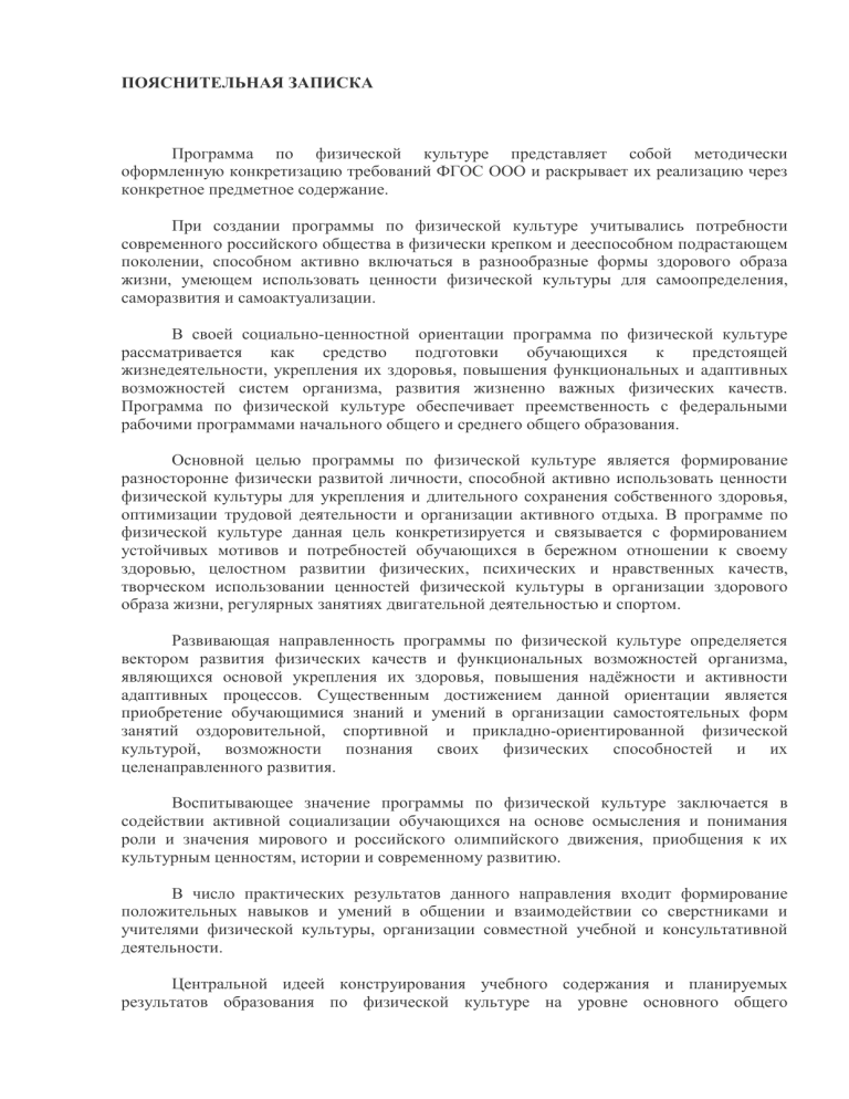 ПОЯСНИТЕЛЬНАЯ ЗАПИСКА Программа по физической культуре представляет собой методически оформленную конкретизацию требований ФГОС ООО и раскрывает их реализацию через конкретное предметное содержание. При создании программы по физической культуре учитывались потребности современного российского общества в физически крепком и дееспособном подрастающем поколении, способном активно включаться в разнообразные формы здорового образа жизни, умеющем использовать ценности физической культуры для самоопределения, саморазвития и самоактуализации. В своей социально-ценностной ориентации программа по физической культуре рассматривается как средство подготовки обучающихся к предстоящей жизнедеятельности, укрепления их здоровья, повышения функциональных и адаптивных возможностей систем организма, развития жизненно важных физических качеств. Программа по физической культуре обеспечивает преемственность с федеральными рабочими программами начального общего и среднего общего образования. Основной целью программы по физической культуре является формирование разносторонне физически развитой личности, способной активно использовать ценности физической культуры для укрепления и длительного сохранения собственного здоровья, оптимизации трудовой деятельности и организации активного отдыха. В программе по физической культуре данная цель конкретизируется и связывается с формированием устойчивых мотивов и потребностей обучающихся в бережном отношении к своему здоровью, целостном развитии физических, психических и нравственных качеств, творческом использовании ценностей физической культуры в организации здорового образа жизни, регулярных занятиях двигательной деятельностью и спортом. Развивающая направленность программы по физической культуре определяется вектором развития физических качеств и функциональных возможностей организма, являющихся основой укрепления их здоровья, повышения надёжности и активности адаптивных процессов. Существенным достижением данной ориентации является приобретение обучающимися знаний и умений в организации самостоятельных форм занятий оздоровительной, спортивной и прикладно-ориентированной физической культурой, возможности познания своих физических способностей и их целенаправленного развития. Воспитывающее значение программы по физической культуре заключается в содействии активной социализации обучающихся на основе осмысления и понимания роли и значения мирового и российского олимпийского движения, приобщения к их культурным ценностям, истории и современному развитию. В число практических результатов данного направления входит формирование положительных навыков и умений в общении и взаимодействии со сверстниками и учителями физической культуры, организации совместной учебной и консультативной деятельности. Центральной идеей конструирования учебного содержания и планируемых результатов образования по физической культуре на уровне основного общего образования является воспитание целостной личности обучающихся, обеспечение единства в развитии их физической, психической и социальной природы. Реализация этой идеи становится возможной на основе содержания учебного предмета, которое представляется двигательной деятельностью с её базовыми ком