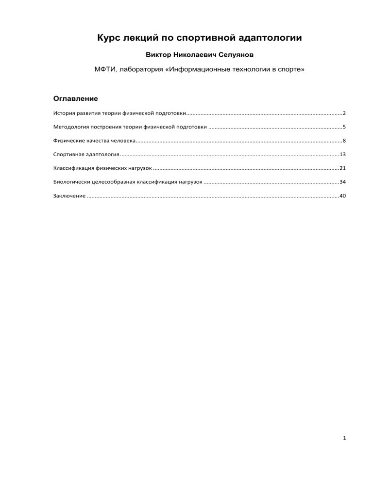 Курс лекций по спортивной адаптологии Виктор Николаевич Селуянов МФТИ, лаборатория «Информационные технологии в спорте» Оглавление История развития теории физической подготовки................................................................................................... 2 Методология построения теории физической подготовки ..................................................................................... 5 Физические качества человека................................................................................................................................... 8 Спортивная адаптология ........................................................................................................................................... 13 Классификация физических нагрузок ...................................................................................................................... 21 Биологически целесообразная классификация нагрузок ...................................................................................... 34 Заключение ................................................................................................................................................................ 40 1 История развития теории физической подготовки Эмпирический этап теории физической подготовки (ТФП) завершила свое развитие после выхода в свет монографии В. М. Зациорского «Физические качества спортсмена» (1966). В. М. Зациорский подвел итог развития этого направления теории физического воспитания. В результате были определены пять физических качеств: сила, быстрота, выносливость, гибкость и ловкость, а также пути их биологического развития и методы их воспитания. Методологический подход был заимствован из области эмпирического обобщения экспериментального материала. Эмпирический способ обобщения материала предполагает отсутствие понимания смысла явлений, сравнение, систематизация, классификация проводится на основании формальных критериев. В. М. Зациорский это прекрасно понимал, поэтому в главах для каждого физического качества привел тексты с мелким шрифтом, в которых с помощью сведений из биологических наук пытался объяснить природу явления физических качеств. Дальнейшее развитие ТФП шло по пути усиления вклада биологических наук в объяснение явления различных сторон физических качеств. Н. И. Волков написал в конце 60-х годов несколько статей с информацией о ходе биоэнергетических процессов в организме человека. Эта информация позволила существенно углубить представления о выносливости спортсменов. В. Н. Платонов написал в 80-е годы монографию «Адаптация в спорте». Это послужило толчком для усиления активности исследований в ГЦОЛИФКе. Ректор В. Меньшиков собрал ведущих специалистов и задал вопрос: «Украинские специалисты идут вперед, чем мы можем ответить?». После долгой паузы пришлось отвечать на вопрос самому молодому — В. Н. Селуянов предложил развивать математическое моделирование, компьютерные программы могут имитировать адаптационные процессы, а это дает основание для выполнения расчетов и поиска наиболее рациональных вариантов тренировочного процесса, т. е. надо развивать биологически целесообразные методы тренировки, переходить на истинно теоретический уровень мышления. Такое начало породило дискуссию. Ю. В. Врхошанский сказал, что это невозможно и не будет сделано никогда. Л. П. Матвеев отклонился от предмета дискуссии, но заявил, что вот вышла монография Ю. В. Верхошанского о скоростно-силовой подготовке прыгунов. В этой работе почему-то объем и интенсивность растут одновременно в предсоревновательном периоде, а это невозможно. Поэтому эту книгу надо выбро