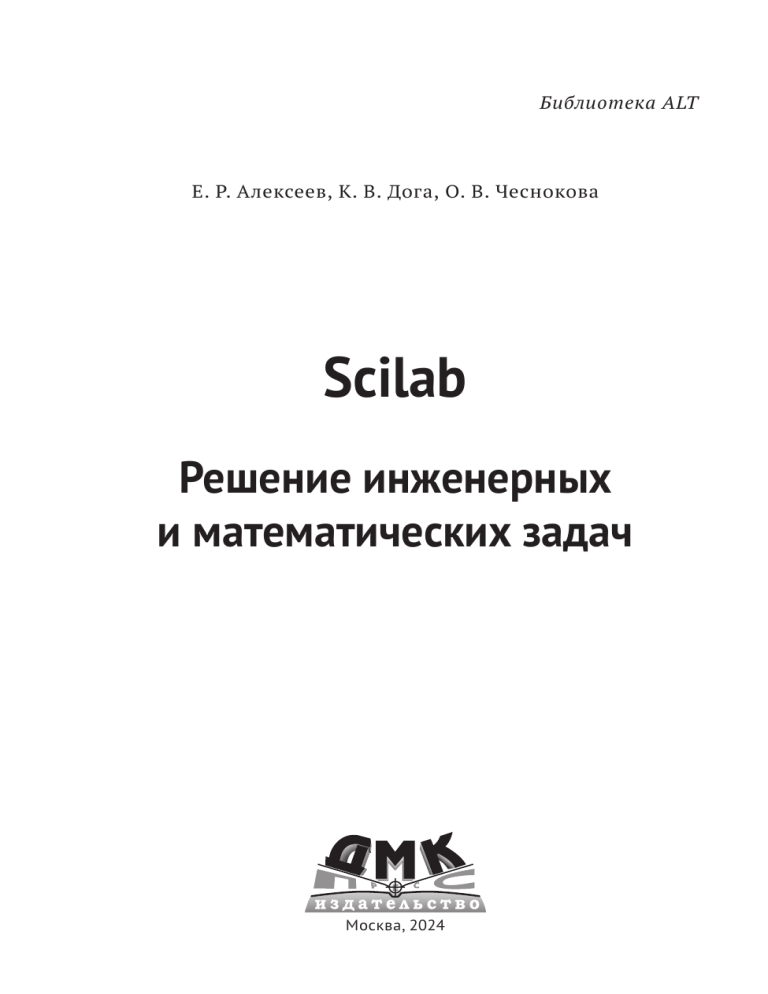 FDL. Книга содержит следующий текст, помещаемый на первую страницу обложки: «В серии “Библиотека ALT”». Название: «Scilab: Решение инженерных и математических задач».