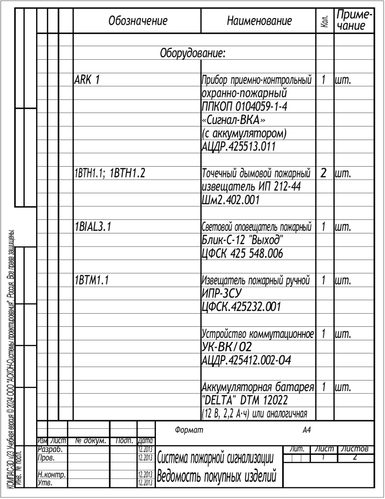 Наименование Кол. Обозначение Примечание КОМПАС-3D v23 Учебная версия © 2024 ООО "АСКОН-Системы проектирования", Россия. Все права защищены. Инв. № подл. Оборудование: ARK 1 Прибор приемно-контрольный 1 шт. охранно-пожарный ППКОП 0104059-1-4 «Сигнал-ВКА» (с аккумулятором) АЦДР.425513.011 1BTH1.1; 1BTH1.2 Точечный дымовой пожарный 2 шт. извещатель ИП 212-44 Шм2.402.001 1BIAL3.1 Световой оповещатель пожарный 1 шт. Блик-С-12 "Выход" ЦФСК 425 548.006 1BTM1.1 Извещатель пожарный ручной 1 шт. ИПР-3СУ ЦФСК.425232.001 Устройство коммутационное 1 шт. УК-ВК/02 АЦДР.425412.002-04 Аккумуляторная батарея 1 шт. "DELTA" DTM 12022 (12 В, 2,2 A·ч) или аналогичная Формат Изм Лист № докум. Подп. Дата Разраб. 12.2013 Пров. 12.2013 Н.контр. Утв. Система пожарной сигнализации 12.2013 12.2013 Ведомость покупных изделий A4 Лит. Лист Листов 1 2 КОМПАС-3D v23 Учебная версия © 2024 ООО "АСКОН-Системы проектирования", Россия. Все права защищены. Инв. № подл. Подп. и дата Взам. инв. № Инв. № дубл. Подп. и дата 1BIAD2.1 Изм. Лист № докум. Подп. Дата Не для коммерческого использования Наименование Кол. Форма тЗона Поз. Обозначение Примечание Оповещатель пожарно-охранный комбинированный 1 шт. "Маяк-12-КПМ2 НИ" ТУ 4372-001-49518441-99 Лист 2 Копировал Формат A4