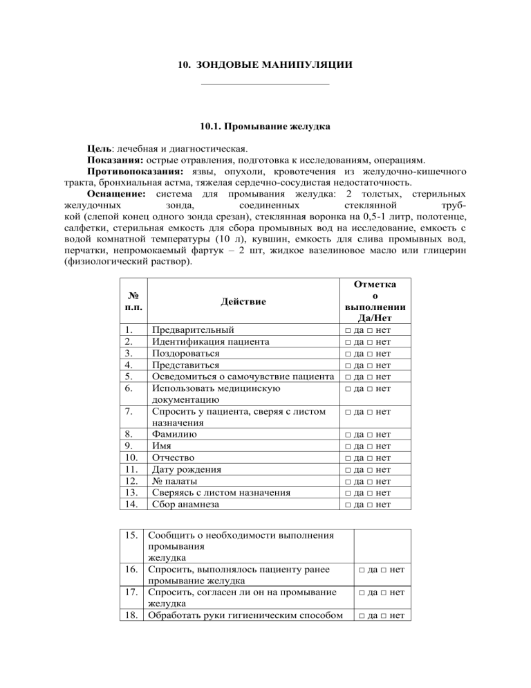 10. ЗОНДОВЫЕ МАНИПУЛЯЦИИ 10.1. Промывание желудка Цель: лечебная и диагностическая. Показания: острые отравления, подготовка к исследованиям, операциям. Противопоказания: язвы, опухоли, кровотечения из желудочно-кишечного тракта, бронхиальная астма, тяжелая сердечно-сосудистая недостаточность. Оснащение: система для промывания желудка: 2 толстых, стерильных желудочных зонда, соединенных стеклянной трубкой (слепой конец одного зонда срезан), стеклянная воронка на 0,5-1 литр, полотенце, салфетки, стерильная емкость для сбора промывных вод на исследование, емкость с водой комнатной температуры (10 л), кувшин, емкость для слива промывных вод, перчатки, непромокаемый фартук – 2 шт, жидкое вазелиновое масло или глицерин (физиологический раствор). № п.п. 1. 2. 3. 4. 5. 6. 7. 8. 9. 10. 11. 12. 13. 14. Отметка о Действие выполнении Да/Нет Предварительный □ да □ нет Идентификация пациента □ да □ нет Поздороваться □ да □ нет Представиться □ да □ нет Осведомиться о самочувствие пациента □ да □ нет Использовать медицинскую □ да □ нет документацию Спросить у пациента, сверяя с листом □ да □ нет назначения Фамилию □ да □ нет Имя □ да □ нет Отчество □ да □ нет Дату рождения □ да □ нет № палаты □ да □ нет Сверяясь с листом назначения □ да □ нет Сбор анамнеза □ да □ нет 15. Сообщить о необходимости выполнения промывания желудка 16. Спросить, выполнялось пациенту ранее промывание желудка 17. Спросить, согласен ли он на промывание желудка 18. Обработать руки гигиеническим способом □ да □ нет □ да □ нет □ да □ нет 19. Набор материалов 20. Толстый стерильный желудочный зонд 1015 мм, длиной 100-120 см соединенных стеклянной трубкой (слепой конец у одного зонда срезан) 21. Резиновая трубка длиной 70 см (для удлинения зонда) 22. Воронка емкостью – 1 л 23. Стеклянная соединительная трубка диаметром не менее 8 мм для удлинения зонда 24. Шприц Жане 25. Фонендоскоп 26. Тонометр 27. Емкость для промывных вод 28. Водный термометр 29. Ведро 30. Ковш 31. Стерильные салфетки 32. Жидкое вазелиновое масло или глицерин 33. Фартук – 2 шт. 34. Емкость с водопроводной водой температуры 23-25°С 10 л 35. Нестерильные перчатки 36. Одноразовая простынь (если кушетка) 37. Закрепленный пакет для утилизации отходов класса А 38. Закрепленный пакет для утилизации отходов класса Б 39. Проверка материалов 40. Проверить срок годности стерильного желудочного зонда 41. Проверить целостность упаковки стерильного желудочного зонда 42. Проверить срок годности стерильных салфеток 43. Проверить целостность упаковки стерильных салфеток 44. Подготовительный 45. Попросить удалить съемные протезы и убрать их в карман 46. Усадить пациента на стул со спинкой или уложить на кушетку в положении на боку 47. Надеть фартук на пациента 48. Поставить таз к ногам пациента (к головному концу кушетки, если положение пациента лёжа) 49. Подготовка кушетки □ да □ нет □ да □ нет □ да □ нет □ да □ нет □ да □ нет □ да □ нет □ да □ нет □ да □ нет □ да □ нет □ да □ нет □ да □ нет □ да □ нет □ да □ нет □ да □ нет □ да □ нет □ да □ нет □ да □ нет □ да □ нет □ да □ нет □ да □ нет □ да □ нет □ да □ нет □ да □ нет □ да □ нет □ да □ нет □ да □ нет □ да □ нет □ да □ нет 50. Постелить одноразовую простынь на кушетку 51. Уложить пациента: 52. : свободный край фартука опустить в таз 53. Измерить артериальное давление (при необходимости) 54. Подсчитать пульс (при необходимости) 55. надеть нестери