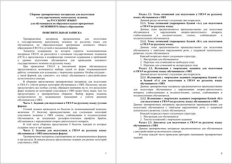 Сборник тренировочных материалов для подготовки к государственному выпускному экзамену по РУССКОМУ ЯЗЫКУ для обучающихся по образовательным программам ОСНОВНОГО общего образования ПОЯСНИТЕЛЬНАЯ ЗАПИСКА Тренировочные материалы предназначены для подготовки к государственному выпускному экзамену по русскому языку для обучающихся по образовательным программам основного общего образования (ГВЭ-9) в устной и письменной формах. Элементы содержания, на котором строятся экзаменационные материалы ГВЭ-9, не расходятся с основным государственным экзаменом (ОГЭ) и представлены в кодификаторе элементов содержания и требований к уровню подготовки обучающихся для проведения основного государственного экзамена по русскому языку. При проведении ГИА-9 в письменной форме обучающемуся предоставляется возможность выбора одной из форм экзаменационной работы: сочинение или изложение с творческим заданием. Особая ситуация – с такой формой, как «диктант»: его пишут обучающиеся с расстройствами аутистического спектра. В сборнике представлены тренировочные материалы для подготовки к ГИА-9 с учётом разных категорий обучающихся с ОВЗ. Поскольку трудно предусмотреть все особые случаи, обращаем внимание на то, что разделение форм экзамена по категориям участников с ОВЗ может быть иным, чем это предусмотрено в тренировочном сборнике. Выбор формы экзамена осуществляется по медицинским показаниям с учётом решения обучающегося с ОВЗ. Часть 1. Задания для подготовки к ГВЭ-9 по русскому языку (устная форма). Устный экзамен проводится по билетам (в экзаменационный комплект включены 15 билетов) преимущественно для следующих категорий участников экзамена с ОВЗ: слепые, слабовидящие и поздноослепшие обучающиеся, не владеющие рельефно-точечным шрифтом Брайля, обучающиеся с нарушениями опорно-двигательного аппарата. В этой части сборника представлены 8 билетов, каждый из которых содержит текст и три задания. Часть 2. Задания для подготовки к ГВЭ-9 по русскому языку обучающихся с ОВЗ (письменная форма) Тренировочные материалы сгруппированы по экзаменационным формам в три раздела. В каждом разделе представлены задания для разных категорий участников с ОВЗ. 1 Раздел 2.1. Темы сочинений для подготовки к ГВЭ-9 по русскому языку обучающихся с ОВЗ Данный раздел включает следующие два подраздела. 2.1.1. Темы сочинений (маркировка буквой «А») для подготовки к ГВЭ-9 по русскому языку Данные темы предназначаются преимущественно для подготовки обучающихся с нарушениями опорно-двигательного аппарата, слабослышащих и позднооглохших, слепых, слабовидящих и поздноослепших обучающихся. 2.1.2. Темы сочинений (маркировка буквой «К») для подготовки к ГВЭ-9 по русскому языку Данные темы предназначаются преимущественно для подготовки обучающихся с тяжёлыми нарушениями речи, с задержкой психического развития, глухих обучающихся Каждый подраздел имеет следующую структуру. 1. Инструкция для обучающихся 2. Перечень тем сочинений на свободную тему 3. Перечень тем сочинений на литературную тему Раздел 2.2. Изложения с творческим заданием для подготовки к ГВЭ-9 по русскому языку обучающихся с ОВЗ Данный раздел включает следующие два подраздела. 2.2.1. Изложения с творческим заданием (маркировка буквой «А» и буквой «С») для подготовки к ГВЭ-9 по русскому языку обучающихся с ОВЗ Да