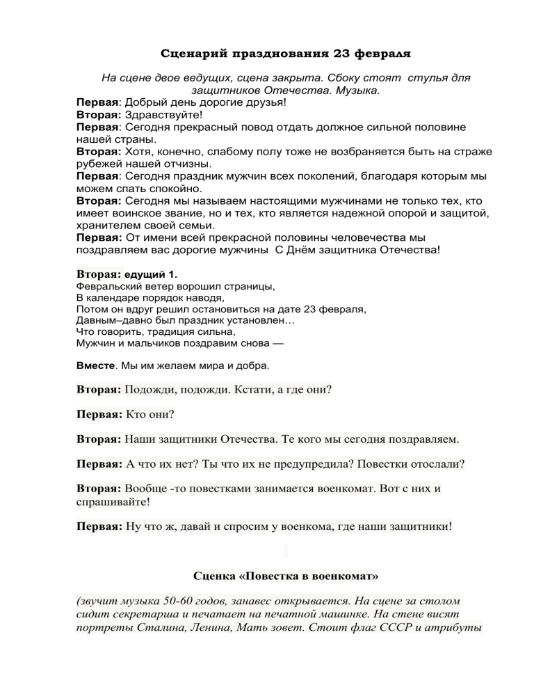 Сценарий празднования 23 февраля На сцене двое ведущих, сцена закрыта. Сбоку стоят стулья для защитников Отечества. Музыка. Первая: Добрый день дорогие друзья! Вторая: Здравствуйте! Первая: Сегодня прекрасный повод отдать должное сильной половине нашей страны. Вторая: Хотя, конечно, слабому полу тоже не возбраняется быть на страже рубежей нашей отчизны. Первая: Сегодня праздник мужчин всех поколений, благодаря которым мы можем спать спокойно. Вторая: Сегодня мы называем настоящими мужчинами не только тех, кто имеет воинское звание, но и тех, кто является надежной опорой и защитой, хранителем своей семьи. Первая: От имени всей прекрасной половины человечества мы поздравляем вас дорогие мужчины С Днём защитника Отечества! Вторая: едущий 1. Февральский ветер ворошил страницы, В календаре порядок наводя, Потом он вдруг решил остановиться на дате 23 февраля, Давным–давно был праздник установлен… Что говорить, традиция сильна, Мужчин и мальчиков поздравим снова — Вместе. Мы им желаем мира и добра. Вторая: Подожди, подожди. Кстати, а где они? Первая: Кто они? Вторая: Наши защитники Отечества. Те кого мы сегодня поздравляем. Первая: А что их нет? Ты что их не предупредила? Повестки отослали? Вторая: Вообще -то повестками занимается военкомат. Вот с них и спрашивайте! Первая: Ну что ж, давай и спросим у военкома, где наши защитники! Сценка «Повестка в военкомат» (звучит музыка 50-60 годов, занавес открывается. На сцене за столом сидит секретарша и печатает на печатной машинке. На стене висят портреты Сталина, Ленина, Мать зовет. Стоит флаг СССР и атрибуты того времени. Под музыку с трубкой во рту входит военком, секретарша соскакивает и отдает честь) Военком: Ну будет тебе голубушка, я и так знаю, что ты отличник производства. Ну, где они? Секретарша: Кто они? Военком: Ну, как, наши призывники. Ты повестки разослала в срок? Секретарша: так точно товарищ военком. Вот сижу жду! Военком: чего ты ждешь, день защитника уже на носу, а она сидит, ждет! Тревогу бить надо, не явка в военкомат - это нарушение Устава. Секретарша: Так что ж делать то мне, я, что -то не поняла? Военком: так слушай меня внимательно, сколько их всего? Секретарша: пять мужского и двое женского пола Военком: какие данные у нас имеются по ним? Секретарша: только фото и то детские Военком: срочно подавай в розыск, и без них ко мне не возвращайся, слышишь, ни ногой. Сорвать мне такое мероприятие, это ж надо учудила! Эх, бабы есть бабы! (секретарша проводит игру с залом по розыску главных героев, показывает фото, зал узнает и называет имя, если этого недостаточно, то даются основные характеристики по ним. Названные герои проходят и садятся на стулья, повестки при них. Так находят всех семерых) Секретарша: Ну, вот нашла всех, сидят как миленькие, ждут, чего дальше делать? Военком: Ну ты что их посадила, приглашай, давай, все тебе объяснять надо. (герои поднимаются на сцену) Военком: Да, заставили вы нас поволноваться. Это ж сколько мы будем за вами бегать, чтобы вам вручить военные билеты. Встать в строй, приготовиться к вручению . (секретарша от испуга становиться вместе с ними). Ты то куда встала, иди уже от сюда. Дорогие наши дембеля, сегодня для вас памятный день, как учил нас Ленин, как требовал Отец и призывала Мать. Сегодня вы стали взрослыми. От имени всех нас мы вручаем вам памятные билеты и медаль за отвагу. Вы мол