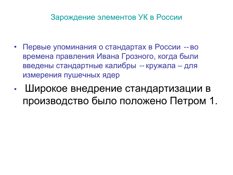 Зарождение элементов УК в России • Первые упоминания о стандартах в России -- во времена правления Ивана Грозного, когда были введены стандартные калибры -- кружала – для измерения пушечных ядер • Широкое внедрение стандартизации в производство было положено Петром 1. Указ №2436 от15 февраля 1712 г. «А ружья драгунские, так и солдатские, также и пистолеты, когда будет повелено, делать одним калибром». Указ от 11 января 1723 г. «Повелеваю хозяина Тульской фабрики Корнилу Белоглазова бить кнутом и сослать на работу в монастыри, понеже он, подлец, осмелился войску Государства продавать негодные пищали и фузеи. Старшину Альдермала Фрола Фукса бить кнутом и сослать в Азов, пусть не ставит клейма на плохие ружья. Приказано оружейной канцелярии переехать из Петербурга в Тулу денно и нощно блюсти исправность ружей. Пусть дьяки и подьячие смотрят, как альдермалы клейма ставят, буде сомнение возьмет, самим проверить и осмотром и стрельбою. А два ружья каждый месяц стрелять, пока не испортится. Буде заминка в войске приключится при сражении по недогляду дьяков и подьячих бить оных кутьями нещадно по голенному месту. Хозяину – 25 кнутов и пени по червонцу за ружь. Старшину Альдермала – бить до бесчувствия. Старшего дьяка отдать в унтер-офицеры. Дьяка – отдать в писари. Подьячего лишить воскресной чарки сроком на один год. Новому хозяину ружейной фабрики Демидову повелеваю построить дьякам и подьячим избы, дабы не хуже хозяйской были, буде хуже, пусть Демидов не обижается, повелеваю живота лишить. Опыт управления качеством в США. Характерные особенности: • Жесткий контроль качества изготовления продукции с использованием методов математической статистики; • Внимание к процессу планирования по объемным и качественным показателям, административный контроль за выполнением планов; • совершенствование управления фирмой в целом. • Конгресс США учредил национальные Премии им. Малькома Болдриджа за выдающиеся достижения в области повышения качества продукции. • С 1987 года выдаются ежегодно трем лучшим фирмам. Премии вручает Президент США во второй четверг ноября – всемирный день качества. • Опыт управления качеством в Японии Э.Деминг и Дж. Джуран Отличительные черты: • ориентация на постоянное совершенствование процессов и результатов труда во всех подразделениях; • ориентация на контроль качества процессов, а не качества продукции; • ориентация на предотвращение возможности допущения дефектов; • тщательное исследование и анализ возникающих проблем по принципу восходящего потока, т.е. от последующей операции к предыдущей; • культивирование принципа: «Твой потребитель – исполнитель следующей производственной операции; • полное закрепление ответственности за качество результатов труда за непосредственным исполнителем; • активное использование человеческого фактора, развитие творческого потенциала рабочих и служащих, культивирование морали: « Нормальному человеку стыдно плохо работать» Программа на японских предприятиях «пять нулей»: • не создавать (условия для появления дефектов); • не передавать ( дефектную продукцию на следующую стадию); • не принимать (дефектную продукцию с предыдущей стадии); • не изменять (технологические режимы); • не повторять (ошибок). главное в отношении к качеству в Японии: • широкое внедрение научны