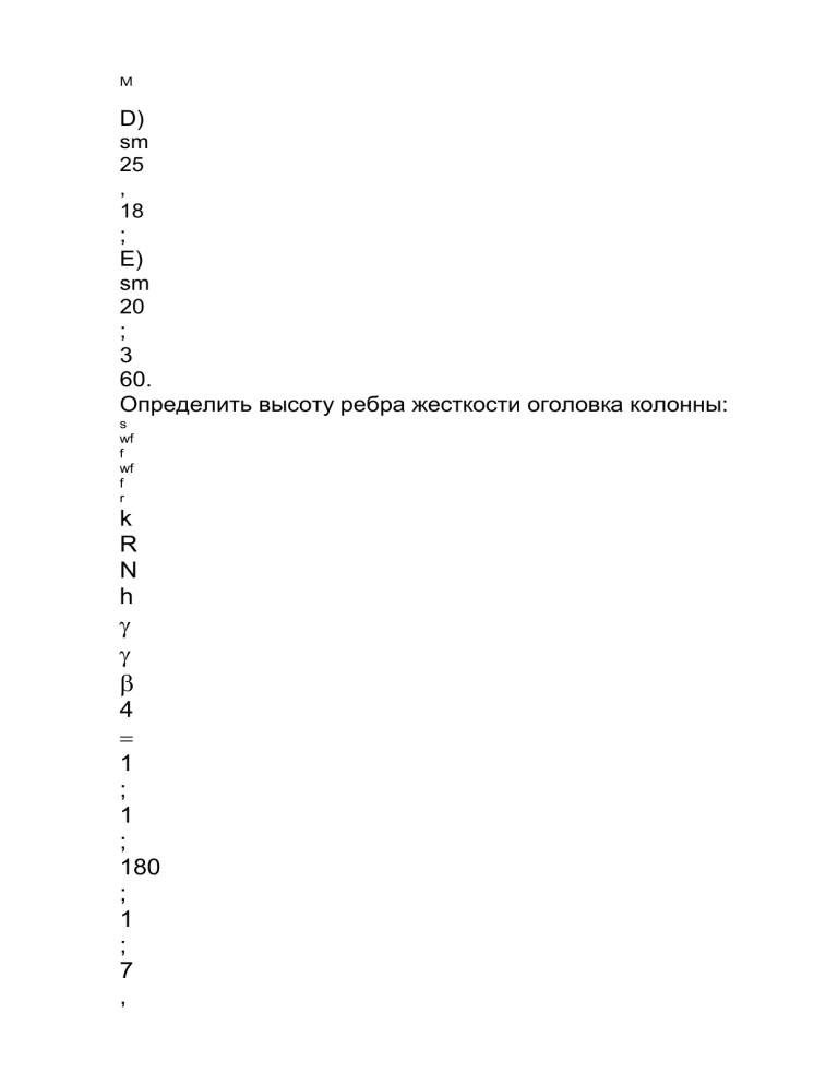 М D) sm 25 , 18 ; E) sm 20 ; 3 60. Определить высоту ребра жесткости оголовка колонны: s wf f wf f r k R N h 4 1 ; 1 ; 180 ; 1 ; 7 , 0 ; 820 wf s wf f f MPa R sm k kN N A) sm 16 ; B) sm 27 , 16 ; C) sm 7 , 17 ; D) sm 6 , 26 ; E) sm 5 , 15 ; 3 61. Проверить сечение балки на прочность: 1 ; 6200 ; 220 ; 1200 3 s s y s y sm W MPa R kNm M R W M A) ; 220 MPa ; B) ; 5 , 193 MPa ; C) ; 205 MPa ; D) ; 215 MPa ; E) ; 208 MPa ; 3 62. Проверить сечение балки на прочность: 3 6500 ; 230 ; 0 , 44 ; 9 sm W MPa R m kN q m l R W M s y s y A) ; 212 MPa B) ; 215 MPa C) ; 205 MPa D) ; 6 , 193 MPa E) ; 210 MPa 3 63. Проверить сечение балки на прочность: 3 6500 ; 230 ; 0 , 42 ; 9 sm W MPa R m kN q m l R W M s y s y A) ; 210 MPa B) ; 200 MPa C) ; 8 , 184 MPa D) ; 157 MPa E) ; 176 MPa 3 64. Проверить сечение балки на прочность: 3 6500 ; 230 ; 0 , 72 ; 10 sm W MPa R m kN q m l R W M s y s y A) ; 207 MPa B) ; 4 , 138 MPa C) ; 220 MPa D) ; 215 kN E) ; 282 kN 3 82. Определить усилие ( w N ) действующее в стенке сварочного шва: w w wy s w t l R N 1 2 t b l w w t t 1 ; 8 , 0 1 sm t ; 20 sm b ; 1 sm t w ; 200 MPa R wy 1 s A) ; 202 kN B) ; 301 kN C) ; 402 kN D) ; 760 kN E) ; 227 kN 3 83. Определить усилие ( w N ) действующее в стенке сварочного шва: w w wy s w t l R N 1 2 t b l w w t t 1 ; 8 , 0 1 sm t ; 24 sm b ; 6 , 0 sm t w ; 180 MPa R wy 1 s A) ; 126 kN B) ; 401 kN C) ; 303 kN D) ; 2 , 403 kN E) ; 215 kN 3 84. Определить усилие ( w N ) действующее в стенке сварочного шва: w w wy s w t l R N 1 2 t b l w w t t 1 ; 12 1 mm t ; 36 sm b ; 180 MPa R wy 1 s A) ; 285 kN B) ; 167 kN C) ; 301 kN D) ; 6 , 604 kN E) ; 226 kN 3 85. Определить усилие ( w N ) действующее в стенке сварочного шва: w w wy s w t l R N 1 2 t b l w w t t 1 ; 10 1 mm t ; 30 sm b ; 200 MPa R wy 1 s A) ; 216 kN B) ; 265 kN C) ; 308 kN D) ; 560 kN E) ; 158 kN 3 86. Определить усилие ( w N ) действующее в стенке сварочного шва: w w wy s w t l R N 1 2 t b l w w t t 1 ; 8 1 mm t ; 40 sm b ; 160 MPa R wy 1 s A) ; 167 kN B) ; 216 kN C) ; 308 kN D) ; 229 kN E) ; 5 , 614 kN 3 87. Определить площадь поверхности A f накладки N =45 0 kN , R y =230 MPa , s y f R N A / 5 , 0 , γ s = 1 , A) A f =1 2 sm 2 ; B) A f = 9,78 sm 2 ; C) A f =1 0,85 sm 2 ; D) A f =1 4,1 sm 2 ; E) A f = 16,6 sm 2 ; 3 88. Определить площадь поверхности A f накладки: N =50 0 kN , R y =2 1 0 MPa , s y f R N A / 5 , 0 , γ s = 0,8 , A) A f =1 0,8 sm 2 ; B) A f = 14,88 sm 2 ; C) A f =1 6,6 sm 2 ; D) A f =1 4,8 sm 2 ; E) A f = 21,2 sm 2 ; 3 89. Определить площадь поверхности A f накладки: N =55 0 kN , R y =2 7 0 MPa , s y f R N A / 5 , 0 , γ s = 0,85 , A) A f =1 8,2 sm 2 ; B) A f = 19,6 sm 2 ; C) A f =1 3,8 sm 2 ; D) A f =1 1,98 sm 2 ; E) A f = 19,5 sm 2 ; 3 90. Определить площадь поверхности A f накладки: N =70 0 kN , R y = 32 0 MPa , s y f R N A / 5 , 0 , γ s = 0,85 , A) A f =1 6,6 sm 2 ; B) A f = 21,8 sm 2 ; C) A f =30 sm 2 ; D) A f =1 2,86 sm 2 ; E) A f = 11 sm 2 ; 3 91. Определить количество болтов в соединении из условии на срез ( n четное число: s s s R d n N n 2 0 4 ; 2000 kN N ; 9 , 0 b ; 4 s n ; 20 mm d ; 21 0 mm d MPa R s 180 A) 19 ; B) 11 ; C) 14 ; D) 12 ; E) 9 ; 3 92. Определить количество болтов в соединении из условии на срез ( n - четное число): s s s R d n N n 2 0 4 ; 1950 kN N ; 9 , 0 b ; 6 s n ; 16 mm d ; 18 0 mm d MPa R s 180 A) 10 ; B) 6 ; C) 14 ; D) 16 ; E) 8 ; 3 93. Определить количество болтов в соединении по условию на срез ( n четное число): s s s R d n N n 2 0 4 ; 1800 kN N ; 1 b ; 4 s n ; 14 mm d ; 15 0 mm d MPa R s 180 A) 8 ; B) 12 ; C) 14 ; D) 16 ; E) 15 ; 3 94. Определить толщину накладки в соединении ( f t ) : ; 14 ; 14 2 sm b sm A f f A) ; 2 , 1 sm t f B) ; 0 , 1 sm t f C) ; 01 , 1 sm t f D) ; 1 sm t f E) ; 5 , 1 sm t f 3 95. Определить толщину накладки в соединении ( f t ) : ; 10 ; 16 2 sm b sm A f f A) ; 6 , 1 sm t f B) ; 2 sm t f C) ; 8 , 1 sm t f D) ; 2 , 1 sm t f E) ; 1 , 1 sm t f 3 96. Определить толщину накладки в соединении ( f t ) : ; 12 ; 4 , 24 2 sm b sm A f f A) ; 11 sm t f B) ; 8 , 10 sm t f C) ; 2 , 1 sm t f D) ; 0 , 1 sm t f E) ; 2 sm t f 3 97. Определить толщину накладки в соединении ( f t ) : kN N MPa R R N A loc b loc b 1600 ; 7 ; , , 0 A) ; 1400 2 sm B) ; 2285 2 sm C) ; 1500 2 sm D) ; 1350 2 sm E) ; 1100 2 sm 3 98. Определить толщину накладки в соединении ( f t ) : 2 60 ; 7 , 0 ; 800 ; sm A kN N A N s s A) ; 2100 2 sm B) ; 1780 2 sm C) ; 1695 2 sm D) ; 1770 2 sm E) ; 1600 2 sm 3 99. Определить толщину накладки в соединении ( f t ) : 2 60 ; 7 , 0 ; 800 ; sm A kN N A N s s A) ; 110 MPa s B) ; 190 MPa s C) ; 115 MPa s D) ; 130 MPa s E) ; 200 MPa s 4 00. Определить толщину накладки в соединении ( f t ) : 2 56 ; 9 , 0 ; 780 ; sm A kN N A N s s A) ; 120 MPa s B) ; 157 MPa s C) ; 168 MPa s D) ; 155 MPa s E) ; 166 MPa s Составил: Рустамов Э. Эксперт: Кулиева А