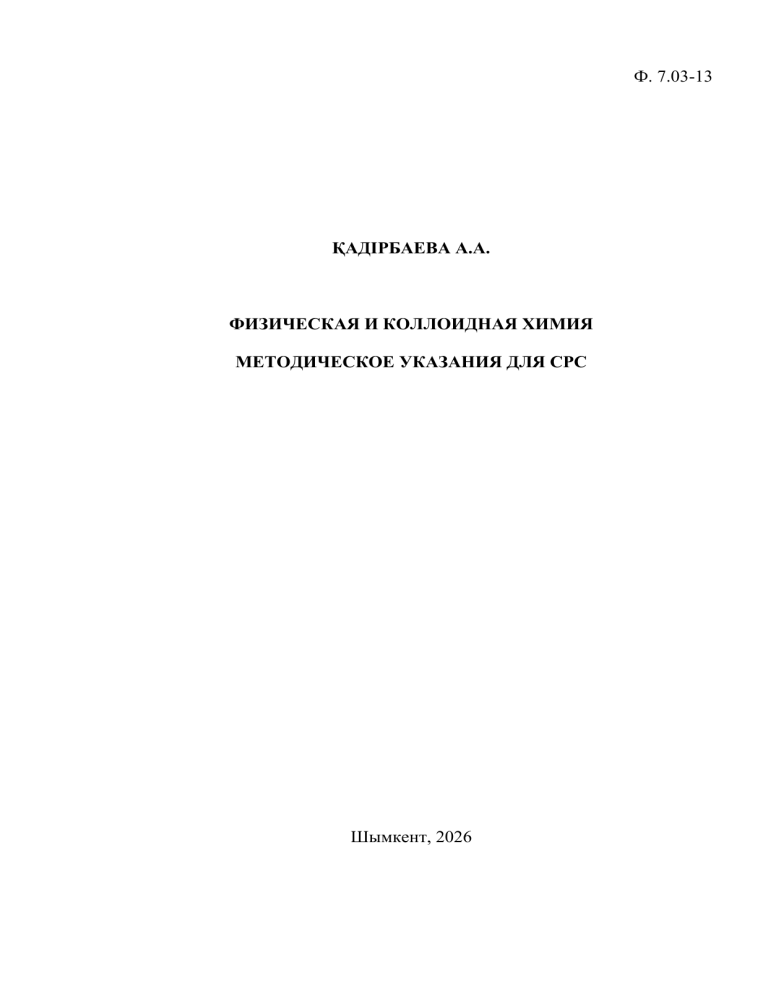 Ф. 7.03-13 ҚАДІРБАЕВА А.А. ФИЗИЧЕСКАЯ И КОЛЛОИДНАЯ ХИМИЯ МЕТОДИЧЕСКОЕ УКАЗАНИЯ ДЛЯ СРС Шымкент, 2026 МИНИСТЕРСТВО НАУКИ И ВЫСШЕГО ОБРАЗОВАНИЯ РЕСПУБЛИКИ КАЗАХСТАН Некоммерческое акционерное общество «Южно-Казахстанский университет им.М.Ауэзова» Қадірбаева А.А. ФИЗИЧЕСКАЯ И КОЛЛОИДНАЯ ХИМИЯ МЕТОДИЧЕСКОЕ УКАЗАНИЯ ДЛЯ СРС для студентов образовательной программы 6В07270-Технология фармцевтических производств Шымкент, 2026 УДК 541 Қадірбаева А.А. Физическая и коллоидная химия. Методическая указания для СРС - Шымкент: Южно-Казахстанский университет им. М.Ауэзова, 2026. -50 с. Методическая указания предназначен(о) для студентов ОП 6В07270технология фармацевтических произодств Рецензенты: Джакипбекова Н.О. – фармацевтической инженерии д.т.н., профессор кафедры © Южно-Казахстанский университет им. М.Ауэзова, 2026 Химии и ВВЕДЕНИЕ Физическая химия как фундаментальная дисциплина является одним из основных компонентов, составляющих методологическую базу подготовки специалистов, связанных с химической технологией и охраной окружающей среды. Специалисты такого профиля должны знать и понимать законы протекания физических и химических процессов, уметь использовать эти знания для предсказания направления протекания любого физикохимического процесса в окружающей среде, химических технологиях, подбирать оптимальные условия для проведения технологических процессов, т. е. управлять ими. Настоящее пособие ориентировано на бакалавриат и предназначено для самостоятельной работы студентов как заочной, так и очной форм обучения. В пособии дана программа курса, определяющая необходимый объѐм знаний по разделам дисциплины, приведѐн библиографический список основной и дополнительной литературы и электронных источников [1-30]. По каждому разделу дисциплины предлагаются вопросы для самопроверки полноты усвоения теоретических знаний, приведены примеры решения типовых задач и контрольные задачи для самостоятельного решения. В примерах решения типовых задач даются ссылки на соответствующую страницу учебника по физической химии проф. А. Г. Стромберга, изданного в 2001 (2006) году [1]. При рассмотрении примеров следует обратить внимание, что практически везде используется международная система единиц (СИ); все физические величины, где это требуется, приведены с соответствующими единицами измерения; во всех расчетных формулах величины подставлены в необходимых единицах измерения без математических преобразований. Для составления ряда контрольных задач использованы данные из задач классических задачников [12, 17], текст задач переработан и адаптирован для бакалавриата. Студентам заочной формы обучения даны общие указания для самостоятельной работы по изучению дисциплины, выполнения и оформления контрольной работы, выбора варианта контрольной работы. Набор задач в каждой контрольной работе для студентов различных направлений подготовки представлен в табл. 1. Нумерация примеров решения задач дана по каждому разделу, нумерация контрольных задач сплошная по всем разделам. В приложении приводятся необходимые справочные материалы для решения контрольных задач. Пособие заканчивается глоссарием, где представлены основные термины физической химии. Студентам очной формы обучения различных направлений подготовки и профилей пособие может быть рекомендован
