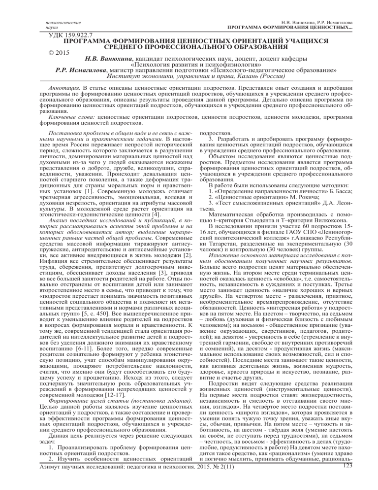 психологические науки Н.В. Ванюхина, Р.Р. Исмагилова ПРОГРАММА ФОРМИРОВАНИЯ ЦЕННОСТНЫХ... УДК 159.922.7 ПРОГРАММА ФОРМИРОВАНИЯ ЦЕННОСТНЫХ ОРИЕНТАЦИЙ УЧАЩИХСЯ СРЕДНЕГО ПРОФЕССИОНАЛЬНОГО ОБРАЗОВАНИЯ © 2015 Н.В. Ванюхина, кандидат психологических наук, доцент, доцент кафедры «Психология развития и психофизиология» Р.Р. Исмагилова, магистр направления подготовки «Психолого-педагогическое образование» Институт экономики, управления и права, Казань (Россия) Аннотация. В статье описаны ценностные ориентации подростков. Представлен опыт создания и апробации программы по формированию ценностных ориентаций подростков, обучающихся в учреждении среднего профессионального образования, описаны результаты проведения данной программы. Детально описана программа по формированию ценностных ориентаций подростков, обучающихся в учреждении среднего профессионального образования. Ключевые слова: ценностные ориентации подростков, ценности подростков, ценности молодежи, программа формирования ценностей подростков. Постановка проблемы в общем виде и ее связь с важ- подростков. 3. Разработать и апробировать программу формироными научными и практическими задачами. В настоящее время Россия переживает непростой исторический вания ценностных ориентаций подростков, обучающихся период, сложность которого заключается в разрушении в учреждении среднего профессионального образования. Объектом исследования являются ценностные подличности, доминировании материальных ценностей над духовными из-за чего у людей оказываются искажены ростков. Предметом исследования является программа представления о доброте, дружбе, великодушии, спра- формирования ценностных ориентаций подростков, обведливости, уважении. Происходит девальвация цен- учающихся в учреждении среднего профессионального ностей старшего поколения, а также деформация тра- образования. В работе были использованы следующие методики: диционных для страны моральных норм и нравствен1. «Определение направленности личности» Б. Басса; ных установок [1]. Современную молодежь отличает 2. «Ценностные ориентации» М. Рокича; чрезмерная агрессивность, эмоциональная, волевая и 3. «Тест смысложизненных ориентаций» Д.А. Леондуховная незрелость, ориентация на атрибуты массовой культуры. В молодежной среде растет ориентация на тьева. Математическая обработка производилась с помоэгоистически-гедонистические ценности [4]. Анализ последних исследований и публикаций, в ко- щью t–критерия Стьюдента и Т–критерия Вилкоксона. В исследовании приняли участие 60 подростков 15торых рассматривались аспекты этой проблемы и на которых обосновывается автор; выделение неразре- 16 лет, обучающихся в филиале ГАОУ СПО «Лениногоршенных раньше частей общей проблемы. Современные ский политехнический колледж» г.Азнакаево Республисредства массовой информации тиражируют антису- ки Татарстан, разделенные на экспериментальную (30 пружеские, антиродительские и антисемейные установ- человек) и контрольную (30 человек) группы. Изложение основного материала исследования с полки, все активнее внедряющиеся в жизнь молодежи [2]. Инфляция все стремительнее обесценивает результаты ным обоснованием полученных научных результатов. труда, сбережения, препятствует долгосрочным инве- Больше всего подростки ценят материально обе