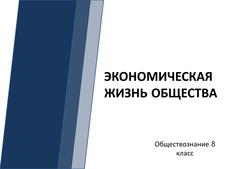 ЭКОНОМИЧЕСКАЯ ЖИЗНЬ ОБЩЕСТВА Обществознание 8 класс Экономику рассматривают к как сферу общественной жизни, обеспечивающую удовлетворение потребностей людей (экономическая сфера жизни общества); как способ организации хозяйственной деятельности людей, направленной на создание необходимых для потребления благ (экономика семьи, экономика фирмы, экономика государства); как науку о хозяйственной деятельности людей, способах её рационального ведения. ОПРЕДЕЛЕНИЕ — любая деятельность людей, связанная с материальным обеспечением условий жизни и созданием экономических благ. Экономика СУТЬ ЭКОНОМИКИ Экономические блага — товары, услуги и результаты работ, которые человек специально производит и которые доступны ПРОИЗВОДИТЬ ТОВАРЫ И УСЛУГИ в меньшем объёме, чем это необходимо, и поэтому особым образом распределяются. ПОВЫШАТЬ КАЧЕСТВО ЖИЗНИ ТОВАРЫ VS УСЛУГИ продукты труда, способные удовлетворять человеческие потребности и произведённые для обмена. деятельность, приносящую полезный результат для потребителя. ГЛАВНЫЕ ВОПРОСЫ ЭКОН ЧТО ПРОИЗВОДИТЬ, то есть какие товары и в каком количестве будут пользоваться спросом у потребителей; КАК ПРОИЗВОДИТЬ, то есть какую технику и оборудование, какие методы использовать при производстве товаров; ДЛЯ КОГО ПРОИЗВОДИТЬ, то есть кто будет потреблять эти товары. ДЛЯ ПРОИЗВОДСТВА ТОВАРОВ/УСЛУГ НЕОБХО ФАКТОРЫ ПРОИЗВОДСТВА Факторы производства — экономические ресурсы, необходимые для изготовления товаров и услуг. К НИМ ОТНОСЯТСЯ ТРУД, то есть деятельность людей по производству товаров и услуг посредством использования своих физических и интеллектуальных способностей; ЗЕМЛЯ, то есть все виды природных ресурсов, существующие на нашей планете и пригодные для производства экономических благ; КАПИТАЛ, то есть здания, сооружения, оборудование, денежные средства и другие ценности, которые требуются для производства экономических благ; ПРЕДПРИНИМАТЕЛЬСКИЕ СПОСОБНОСТИ, то есть способности человека к ведению деятельности по производству экономических благ; ИНФОРМАЦИЯ, то есть знания и сведения, необходимые для ведения деятельности по производству экономических благ. ПРОИЗВОДСТВО ВИДЫ ПОТРЕБЛЕНИЕ ЭКОНОМИЧЕС ОБМЕН КОЙ ДЕЯТЕЛЬНОСТ РАСПРЕДЕЛЕНИЕ И ПРОЦЕСС СОЗДАНИЯ ТОВАРОВ И УСЛ ПРОИЗВОДСТВО ОБМЕН движение произведённых товаров и услуг от одного субъекта экономической деятельности к другому. РАСПРЕДЕЛЕ НИЕ совокупность действий по разделению произведённых товаров и услуг и дохода между субъектами экономической деятельности. ПОТРЕБЛЕНИ использование благ (товаров и услуг) в удовлетворения потребностей. Е