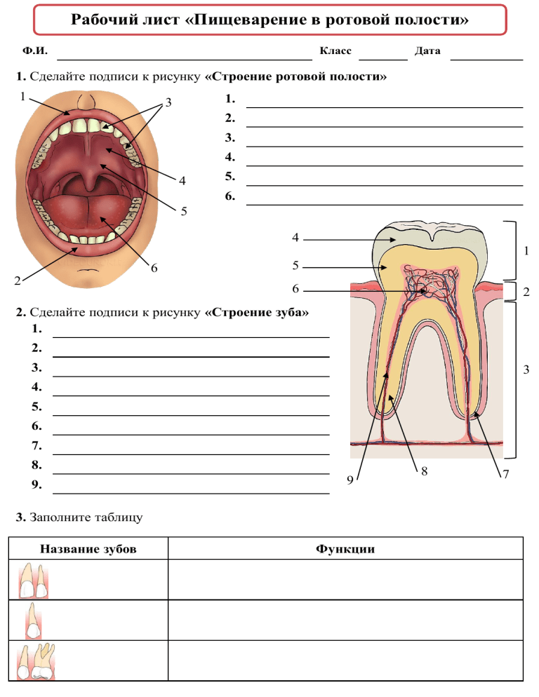 Рабочий лист «Пищеварение в ротовой полости» Ф.И. Класс Дата 1. Сделайте подписи к рисунку «Строение ротовой полости» 1 1. 3 2. 3. 4. 4 5. 6. 5 4 1 6 2 5 6 2 2. Сделайте подписи к рисунку «Строение зуба» 1. 2. 3. 3 4. 5. 6. 7. 8. 9. 9 3. Заполните таблицу Название зубов Функции 8 7 4. Сделайте подписи к рисунку «Вкусовые зоны языка» 4 1. 2. 3. 4. 3 2 1 5. Процессы в ротовой полости 6. Выполните лабораторную работу «Воздействие слюны на крахмал» 1. С помощью ватного тампона смочите часть крахмальной полоски слюной. Подержите полоску между ладонями в течение двух минут. 2. Поместите полоску в слабый раствор йода. 3. Сделайте вывод, что произошло с крахмалом на участке, смоченном слюной. Почему это произошло? 7. Сделайте подписи к рисунку и опишите механизм глотания 1. 2. 3. 4. 4 3 2 1