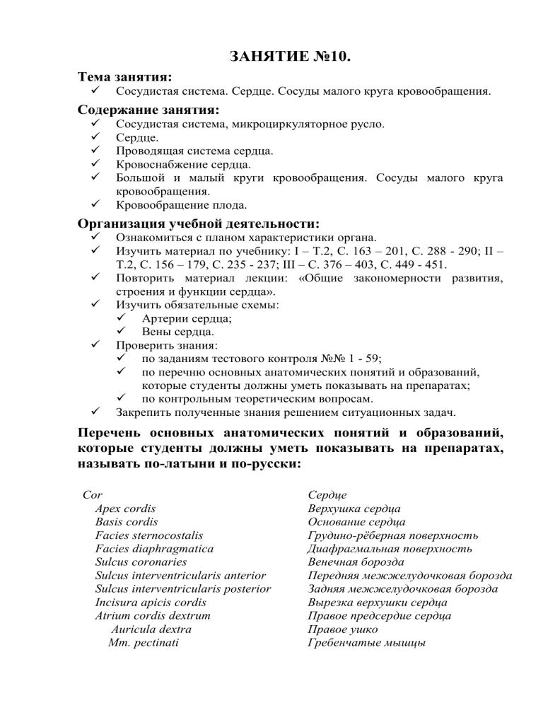 ЗАНЯТИЕ №10. Тема занятия: Сосудистая система. Сердце. Сосуды малого круга кровообращения. Содержание занятия: Сосудистая система, микроциркуляторное русло. Сердце. Проводящая система сердца. Кровоснабжение сердца. Большой и малый круги кровообращения. Сосуды малого круга кровообращения. Кровообращение плода. Организация учебной деятельности: Ознакомиться с планом характеристики органа. Изучить материал по учебнику: I – Т.2, С. 163 – 201, С. 288 - 290; II – Т.2, С. 156 – 179, С. 235 - 237; III – С. 376 – 403, С. 449 - 451. Повторить материал лекции: «Общие закономерности развития, строения и функции сердца». Изучить обязательные схемы: Артерии сердца; Вены сердца. Проверить знания: по заданиям тестового контроля №№ 1 - 59; по перечню основных анатомических понятий и образований, которые студенты должны уметь показывать на препаратах; по контрольным теоретическим вопросам. Закрепить полученные знания решением ситуационных задач. Перечень основных анатомических понятий и образований, которые студенты должны уметь показывать на препаратах, называть по-латыни и по-русски: Cor Apex cordis Basis cordis Facies sternocostalis Facies diaphragmatica Sulcus coronaries Sulcus interventricularis anterior Sulcus interventricularis posterior Incisura apicis cordis Atrium cordis dextrum Auricula dextra Mm. pectinati Сердце Верхушка сердца Основание сердца Грудино-рёберная поверхность Диафрагмальная поверхность Венечная борозда Передняя межжелудочковая борозда Задняя межжелудочковая борозда Вырезка верхушки сердца Правое предсердие сердца Правое ушко Гребенчатые мышцы Septum interatriale Fossa ovalis Limbus fossae ovale Ostium venae cavae superioris Ostium venae cavae inferioris Tuberculum intervenosum Valvula venae cavae inferioris Ostium sinus coronarii Valvula sinus coronarii Foramina venarum minimarum Ostium atrioventriculare dextrum Atrium cordis sinistrum Auricula sinistra Mm. pectinati Ostia venarum pulmonalium Ostium atrioventriculare sinistrum Ventriculus dexter Valva atrioventricularis dextra (tricuspidalis) Cuspis anterior Cuspis posterior Cuspis septalis M. papillaris anterior M. papillaris posterior M. papillaris septalis Chordae tendineae Trabeculae carneae Conus arteriosus Truncus pulmonalis Ostium trunci pulmonalis Valva trunci pulmonalis Valvulae semilunaris Nodulus valvulae semilunaris Lunulae valvulae semilunaris Sinus trunci pulmonalis Ventriculus sinister Valva atrioventricularis sinistra (mitralis) Cuspis anterior Cuspis posterior M. papillaris anterior M. papillaris posterior Conus arteriosus Межпредсердная перегородка Овальная ямка Край (валик) овальной ямки Отверстие верхней полой вены Отверстие нижней полой вены Межвенозный бугорок Заслонка нижней полой вены Отверстие нижней полой вены Заслонка венечного синуса Отверстия наименьших вен Правое предсердно-желудочковое отверстие Левое предсердие сердца Левое ушко Гребенчатые мышцы Отверстия легочных вен Левое предсердно-желудочковое отверстие Правый желудочек Правый (трёхстворчатый) предсердно - желудочковый клапан Передняя створка Задняя створка Перегородочная створка Передняя сосочковая мышца Задняя сосочковая мышца Перегородочная сосочковая мышца Сухожильные нити Мясистые трабекулы Артериальный конус Лёгочный ствол Отверстие лёгочного ствола Клапан лёгочного ствола Полулунные заслонки Узелок полулунной заслонки Края полулунной заслонки Пазуха лёгочного ствола Левый желудочек Левый (митральный) предсердножелудочковый клапан Передняя створка Задняя створка Передняя сосочковая мышца Задняя сосочковая мышца Артериальный конус Valva aortae Valvulae semilunares aortae Noduli valvularum semilunarium aortae Lunulae valvularum semilunarium aortae Sinus aortae Septum interventricularae Pars muscularis Pars memdranacea Miocardium Vortex cordis Annuli fibrosi (dexter et sinister) Trigonum fibrosum dexter Trigonum fibrosum sinister Nodus sinuatrialis Nodus atrioventricularis Fasciculus atrioventricularis Crus dextrum Crus sinistrum Endocardium Epicardium Bulbus aortae A. coronaria dextra R. interventricularis posterior A. coron