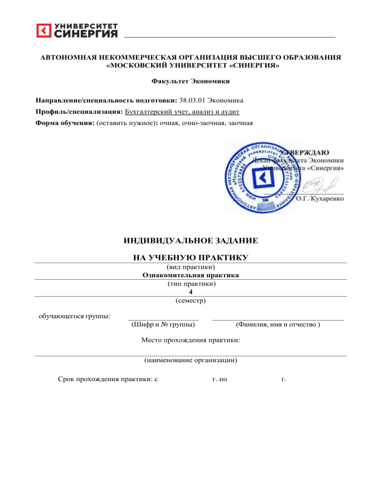 АВТОНОМНАЯ НЕКОММЕРЧЕСКАЯ ОРГАНИЗАЦИЯ ВЫСШЕГО ОБРАЗОВАНИЯ «МОСКОВСКИЙ УНИВЕРСИТЕТ «СИНЕРГИЯ» Факультет Экономики Направление/специальность подготовки: 38.03.01 Экономика. Профиль/специализация: Бухгалтерский учет, анализ и аудит Форма обучения: (оставить нужное): очная, очно-заочная, заочная ИНДИВИДУАЛЬНОЕ ЗАДАНИЕ НА УЧЕБНУЮ ПРАКТИКУ (вид практики) Ознакомительная практика (тип практики) 4 (семестр) обучающегося группы: (Шифр и № группы) (Фамилия, имя и отчество ) Место прохождения практики: (наименование организации) Срок прохождения практики: с г. по г. Содержание индивидуального задания на практику № Виды работ п/п 1. Инструктаж по соблюдению правил противопожарной безопасности, правил охраны труда, техники безопасности, санитарно-эпидемиологических правил и гигиенических нормативов. 2. Выполнение определенных практических кейсов-задач, необходимых для оценки знаний, умений, навыков и (или) опыта деятельности по итогам учебной практики ознакомительная практика __________________________________________________________________________________________________________________ (вид практики, тип практики) 2.1. Кейс-задача № 1 Описание ситуации: Базируясь на общедоступной информации об исследуемой любой коммерческой организации (официальный сайт, данные статистической отчетности), на документах, находящимися в открытом доступе, а также на финансовой и бухгалтерской отчетности коммерческой организации необходимо: Содержание задания: составить общее описание исследуемой организации: наименование, организационно-правовая форма, форма собственности, вид экономической деятельности (отрасль); охарактеризовать экономическую модель организации, рассмотреть внутреннюю и внешнюю среду коммерческой структуры, описать службы маркетинга, снабжения, сбыта, кадрового обеспечения организации и сферы деятельности; представить характеристику экономических ресурсов рассматриваемой организации. Решение профессиональной задачи. Ознакомиться с экономической и финансовой отчетностью организации, поставить цель и определить задачи, осуществить сбор информации, необходимой для изучения и проведения анализа деятельности организации, выбрать инструментальные средства для обработки экономических показателей в соответствии с поставленными задачами. 2.2. Кейс-задача № 2 Описание ситуации: Базируясь на общедоступной информации об исследуемой любой коммерческой организации (официальный сайт, данные статистической отчетности), на документах, находящимися в открытом доступе, а также на финансовой и бухгалтерской отчетности коммерческой организации необходимо: Содержание задания: Осуществить обработку данных изучаемого предприятия и произвести расчет производственной мощности организации, проанализировать структуру валовой, товарной и реализованной продукции; провести анализ экономических и финансовых ресурсов, источников формирования финансовых ресурсов (собственный капитал: уставный капитал, добавочный капитал, резервный капитал, нераспределенная прибыль; заемный капитал: долгосрочные и краткосрочные обязательства) за последние 3 года, 2 № п/п Виды работ выполнив при этом необходимые расчеты. Решение профессиональной задачи. По результатам проведенного анализа сформулировать развернутые выводы, дать оценку собственных и заемных ресурсов, обосновать и сформулировать пр