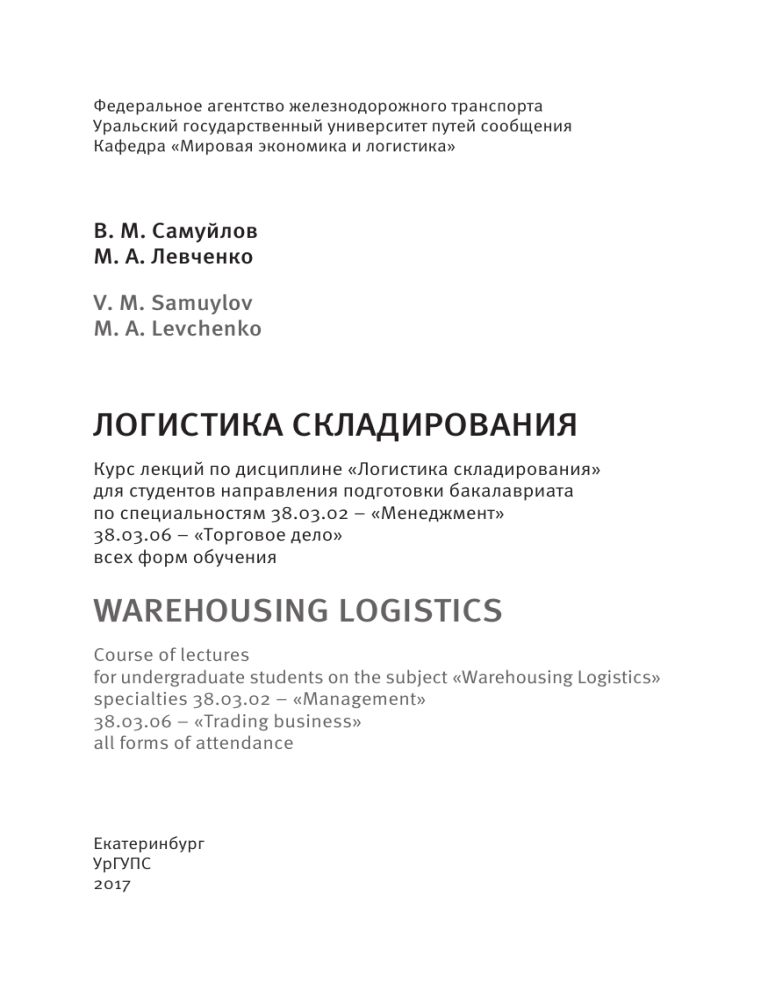 Федеральное агентство железнодорожного транспорта Уральский государственный университет путей сообщения Кафедра «Мировая экономика и логистика» В. М. Самуйлов М. А. Левченко V. М. Samuylov М. А. Levchenko Логистика складирования Курс лекций по дисциплине «Логистика складирования» для студентов направления подготовки бакалавриата по специальностям 38.03.02 – «Менеджмент» 38.03.06 – «Торговое дело» всех форм обучения WAREHOUSING LOGISTICS Course of lectures for undergraduate students on the subject «Warehousing Logistics» specialties 38.03.02 – «Management» 38.03.06 – «Trading business» all forms of attendance Екатеринбург УрГУПС 2017 УДК 658.71(043) С17 Самуйлов, В. М. С17 Логистика складирования : курс лекций / В. М. Самуйлов, М. А. Левченко. – Екатеринбург : УрГУПС, 2017. – 205, [1] с. ISBN 978-5-94614-393-6 Приведены теоретические материалы по основным темам курса «Логистика складирования», а также вопросы и задания для самостоятельной работы. Пособие предназначено для студентов направления подготовки бакалавриата очной и заочной форм обучения по специальностям 38.03.02 – «Менеджмент» и 38.03.06 – «Торговое дело» . Может быть полезно преподавателям для эффективной организации учебного процесса. The work presents the theoretical material on the main themes of the course «Warehousing Logistics», as well as questions and tasks for unsupervised activities. The manual is intended for full-time undergraduate students in the study of discipline «Warehouse logistics», specialty 38.03.02 – «Management» and 38.03.06 – «Trading business». It may be useful to teachers for the effective organization of educational process. УДК 658.71(043) Издано по решению редакционно-издательского совета университета Авторы: В. М. Самуйлов, профессор кафедры «Мировая экономика и логистика», д-р техн. наук, УрГУПС М. А. Левченко, ассистент кафедры «Мировая экономика и логистика», УрГУПС Рецензенты: Л. В. Гашкова, доцент кафедры «Мировая экономика и логистика», УрГУПС М. Б. Петров, профессор, д-р техн. наук, руководитель Центра развития и размещения производительных сил Института экономики УрО РАН ISBN 978-5-94614-393-6 © Уральский государственный университет путей сообщения (УрГУПС), 2017 Оглавление Тема 1. Склад – элемент логистической системы . . . . . . . . . . . . . . . 6 1.1. История мирового складского хозяйства . . . . . . . . . . . . . . . . . . 6 1.2. Основные функции и задачи склада. Классификация складов в логистической системе . . . . . . . . . . . . . . . . . . . . . . . . . . . . 13 1.3. Место и роль складов в логистической системе . . . . . . . . . . . . 25 1.4. Субъекты логистической системы, имеющие склады . . . . . . . 28 Тема 2. Проблемы логистики складирования и роль межфункциональной координации в их решении . . . . . . . . . . 31 2.1. Роль межфункциональной координации в логистике складирования . . . . . . . . . . . . . . . . . . . . . . . . . . . . . . . . . . . . . . . . . . . . 31 2.2. Координация между смежными отделами компании при решении задач логистики складирования . . . . . . . . . . . . . . . . 41 Тема 3. Методология системного подхода к решению задач логистики складирования . . . . . . . . . . . . . . . . . . . . . . . . . . . . . . . . . . . 48 3.1. Основные принципы моделирования складских систем . . . . 48 3.2. Методология решения проблем логистики складирования . . . . . . . . . . . . . . . . . . . . . . . . . . . . . . . . . . . . . . . . . . . . 51 3.3. Разработка генерального плана складского хозяйства . . . . . . 54 3.4. Разработка складской технологии переработки товарных потоков . . . . . . . . . . . . . . . . . . . . . . . . . . . . . . . . . . . . . . . . . 55 3.5. Управление логистическим процессом на складе . . . . . . . . . . 55 3.6. Научные решения задач логистики складирования . . . . . . . . 56 Тема 4. Формирование складской сети . . . . . . . . . . . . . . . . . . . . . . . 59 4.1. Стратегические задачи логистики складирования . . . . . . . .