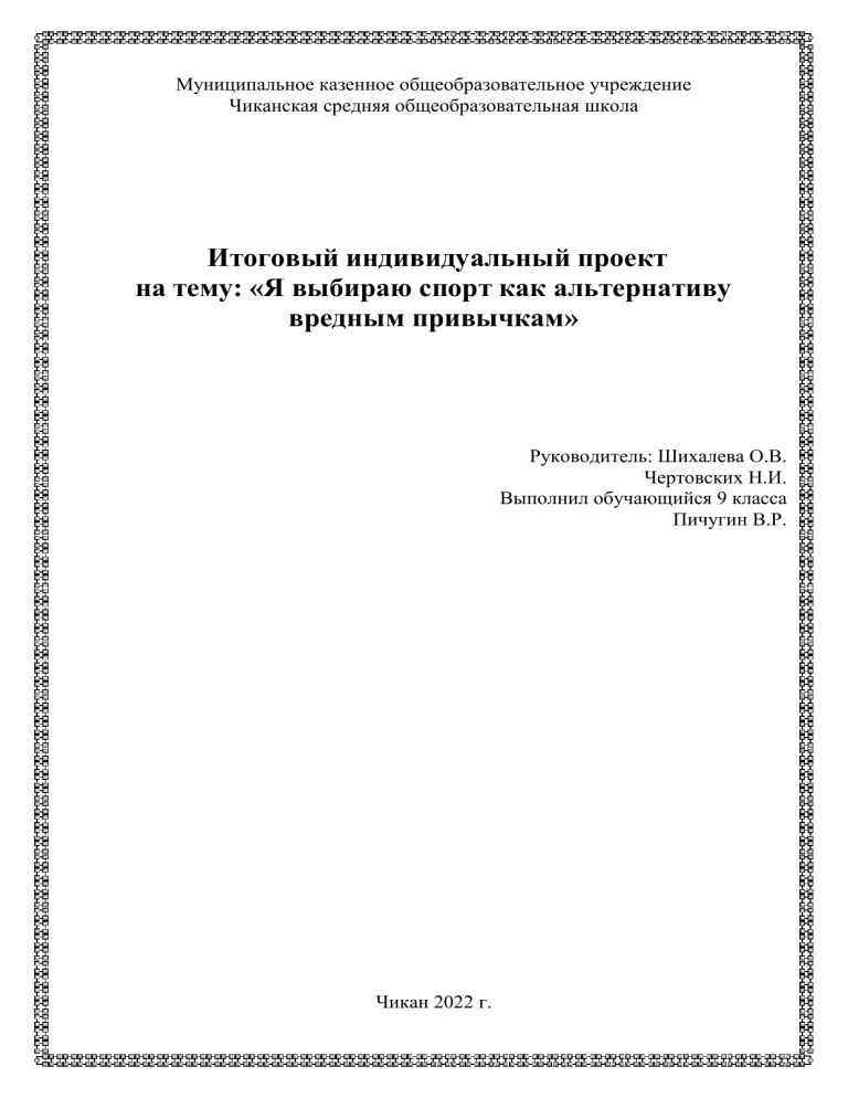 Муниципальное казенное общеобразовательное учреждение Чиканская средняя общеобразовательная школа Итоговый индивидуальный проект на тему: «Я выбираю спорт как альтернативу вредным привычкам» Руководитель: Шихалева О.В. Чертовских Н.И. Выполнил обучающийся 9 класса Пичугин В.Р. Чикан 2022 г. СОДЕРЖАНИЕ ВВЕДЕНИЕ...........................................................................................................3 Раздел 1: Теоретическое исследование, актуальные проблемы сохранения здорового образа жизни путем занятия спорта…………………………………………………………………………………4 Теоретические исследования здорового образа жизни. Актуальные проблемы здорового образа жизни. Сохранение здорового образа жизни путем занятия спорта. Раздел 2: Роль спорта в жизни человека. Анкетирование среди учащихся Заключение…………………………………………………………………………. Список литературы………………………………………………………………… 2 ПАСПОРТ 1.Название проекта: Я выбираю спорт как альтернативу вредным привычкам. 2.Предметная область - Физическая культура, ОБЖ, физика, информатика. 3.Типология проекта: Социально-исследовательский проект. 4.Цель проекта: Значимость спорта в современном мире. 5.Задачи: Доказать, что вредные привычки – это плохо. Убедить людей, что спорт – это жизнь. Проанализировать полученную информацию и сделать выводы. 6.Аннотация проекта: Актуальность выбранной темы состоит в том, что в последнее время всё чаще наблюдаются случаи употребления алкоголя, табака и наркотиков среди молодежи, в том числе и подростков. В жизни современного общества особо острыми стали проблемы, связанные с курением, наркоманией и употреблением алкоголя. Для сохранения здоровья каждый из нас должен понять необходимость ответственного отношения к нему и к своей жизни. Занятия физической культурой — лучшая мера профилактики употребления алкоголя, курения и наркомании. Кроме того, люди, постоянно занимающиеся физической культурой, внешне выглядят более привлекательными. Спорт- это биение твоего сердца, твое дыхание - это твой ритм жизни. 7. Продукт проекта: видеообращение в соцсетях и сайте школы, буклет «Здоровый образ жизни». 8.Этапы работы над проектом. 1. Стадия "подготовка ". На данной стадии я познакомился с необходимой документацией и введен в курс проектного метода. Определил тему и цели проекта, а также его содержание. Кроме того, выявил актуальность и значение данного проекта. 2. Стадия "планирования". Во время стадии "планирования" собирал, подготавливал и анализировал информацию, определил форму конечного продукта проекта, выяснил критерии оценивания результатов. Также составил план проекта, определил его задачи и вопросы. 3. Стадия "исследования". На данной стадии акцентировал внимание на решение поставленных задач. Внимательно изучали источники, осмысливал информацию, создал конспект 4. Стадия "Результаты и выводы". Проанализировав проделанную работу, составил выводы и заключение. 5. Стадия "Представление или отчет". Во время этой стадии подготовил продукт проекта. 6. Стадия "Защита проекта". Раздел 1: Теоретическое исследование, актуальные проблемы сохранения здорового образа жизни путем занятия спорта 3 Каждый человек имеет вредные привычки, что практически для всех является проблемой. Вредные привычки обладают рядом особенностей: Употребление алкоголя, наркотиков и курение вредны как з