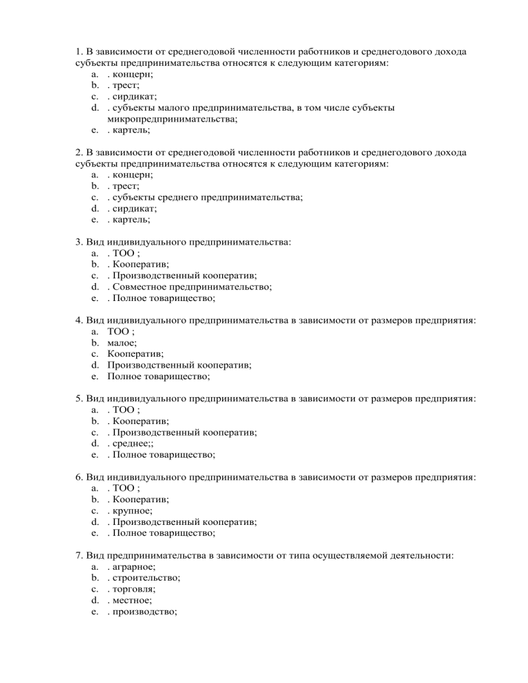 1. В зависимости от среднегодовой численности работников и среднегодового дохода субъекты предпринимательства относятся к следующим категориям: a. . концерн; b. . трест; c. . сирдикат; d. . субъекты малого предпринимательства, в том числе субъекты микропредпринимательства; e. . картель; 2. В зависимости от среднегодовой численности работников и среднегодового дохода субъекты предпринимательства относятся к следующим категориям: a. . концерн; b. . трест; c. . субъекты среднего предпринимательства; d. . сирдикат; e. . картель; 3. Вид индивидуального предпринимательства: a. . ТОО ; b. . Кооператив; c. . Производственный кооператив; d. . Совместное предпринимательство; e. . Полное товарищество; 4. Вид индивидуального предпринимательства в зависимости от размеров предприятия: a. ТОО ; b. малое; c. Кооператив; d. Производственный кооператив; e. Полное товарищество; 5. Вид индивидуального предпринимательства в зависимости от размеров предприятия: a. . ТОО ; b. . Кооператив; c. . Производственный кооператив; d. . среднее;; e. . Полное товарищество; 6. Вид индивидуального предпринимательства в зависимости от размеров предприятия: a. . ТОО ; b. . Кооператив; c. . крупное; d. . Производственный кооператив; e. . Полное товарищество; 7. Вид предпринимательства в зависимости от типа осуществляемой деятельности: a. . аграрное; b. . строительство; c. . торговля; d. . местное; e. . производство; 8. Вид предпринимательства в зависимости от типа осуществляемой деятельности: a. . аграрное; b. . строительство; c. . торговля; d. . местное; e. . коммерческое; 9. Вид предпринимательства в зависимости от типа осуществляемой деятельности: a. . аграрное; b. . строительство; c. . торговля; d. . местное; e. . финансовое; 10. Совместное предпринимательство включает в себя: a. . полное партнерство; b. . командитное товарищество; c. . предпринимательство супругов; d. . ТОО; e. . производственный кооператив; 11. Совместное предпринимательство включает в себя: a. . полное партнерство; b. . командитное товарищество; c. . крестьянское хозяйство или семейное предпринимательство; d. . ТОО; e. . производственный кооператив; 12. Лицензии делятся по следующим критериям: a. . по отраслям; b. . по структуре; c. . по объектам собственности; d. . по субъектам; e. . по организационно-правовым формам; 13. Лицензии делятся по следующим критериям: a. . по отраслям; b. . по структуре; c. . по объектам собственности; d. . по организационно-правовым формам; e. . по объему продукции (работ, услуг); 14. Лицензии делятся по следующим критериям: a. . по отраслям; b. . по структуре; c. . по объектам собственности; d. . по организационно-правовым формам; e. . по сфере экспорта и импорта товаров (работ, услуг); 15. Алгоритм создания частного предприятия включает в себя следующий этап: a. . Организационное собрание для создания предприятия (название фирмы, определение партнеров, основной вид деятельности и т.д. ); b. c. d. e. . отчисления в накопительный пенсионный фонд; . отчисления в Резервный фонд; . отчисления в уставный фонд; . отчисления в земельный фонд; 16. Алгоритм создания частного предприятия включает в себя следующий этап: a. . отчисления в накопительный пенсионный фонд; b. . отчисления в Резервный фонд; c. . отчисления в уставный фонд; d. . отчисления в земельный фонд; e. . Организационное собрание для создания предприятия (название фирмы, определение партнеров, основной вид деятельности и т.д. ); 17. Алгоритм создания частного п