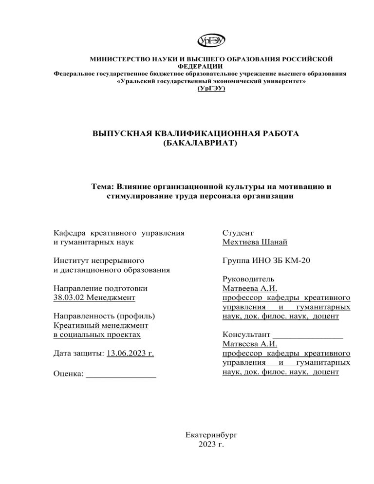 МИНИСТЕРСТВО НАУКИ И ВЫСШЕГО ОБРАЗОВАНИЯ РОССИЙСКОЙ ФЕДЕРАЦИИ Федеральное государственное бюджетное образовательное учреждение высшего образования «Уральский государственный экономический университет» (УрГЭУ) ВЫПУСКНАЯ КВАЛИФИКАЦИОННАЯ РАБОТА (БАКАЛАВРИАТ) Тема: Влияние организационной культуры на мотивацию и стимулирование труда персонала организации Кафедра креативного управления и гуманитарных наук Студент Мехтиева Шанай Институт непрерывного и дистанционного образования Группа ИНО ЗБ КМ-20 Направление подготовки 38.03.02 Менеджмент Направленность (профиль) Креативный менеджмент в социальных проектах Дата защиты: 13.06.2023 г. Оценка: ________________ Руководитель Матвеева А.И. профессор кафедры креативного управления и гуманитарных наук, док. филос. наук, доцент Консультант ________________ Матвеева А.И. профессор кафедры креативного управления и гуманитарных наук, док. филос. наук, доцент Екатеринбург 2023 г. СОДЕРЖАНИЕ Введение ................................................................................................................... 3 1 Теоретические основы исследования влияния организационной культуры на мотивацию и стимулирование труда персонала организации ....................... 5 1.1Понятие, цели и задачи организационной культуры...................................... 5 1.2 Механизм совершенствования организационной культуры предприятия 18 1.3 Теоретические основы управления мотивацией персонала ....................... 24 2. Общая характеристика и анализ влияния организационной культуры на мотивацию и стимулирование труда персонала организации ООО «Здоровое детство» .................................................................................................................. 37 2.1 Анализ организационной культуры ООО «Здоровое детство».................. 37 2.2 Анализ влияния организационной культуры на мотивацию и стимулирование труда персонала организации ООО «Здоровое детство»..... 39 3 Совершенствование организационной культуры ООО «Здоровое детство» ................................................................................................................................. 47 3.1 Разработка проекта совершенствования организационной культуры ООО «Здоровое детство» ............................................................................................... 47 3.2 Прогноз эффективности реализации проекта .............................................. 54 Заключение ............................................................................................................ 59 Список использованных источников .................................................................. 61 Приложение А ...................................................................................................... 68 2 ВВЕДЕНИЕ Развитие организационной культуры является актуальным вопросом для российских компаний. Устоявшиеся системы препятствуют творческому переосмыслению текущей деятельности и внедрению любых организационных инноваций ведь последние, как правило, требуют развития различных элементов сложившейся организационной культуры. Данную тему исследовали следующие авторы: Алиев О.М., Афанасьева О.П., Ванкевич Е.В., Михайлова Е.В., Глаз Ю.А., Зайцева М.В., Глякина Т.Е., Демидова Е.В., Ильина И.А., Душарина Е.Ю., Дятлов С.П., Кожухова Н.В., Минасян Д.С., Кондратенко Д.С., Лазвиашвили Л.В., Плота С., Рогачёв И.В., Соболева В.А., Солодкина Е.В., Самохвалова С.М., Суренян М.А., То Т.Ч., Усманова Е.Г., Усманов А.И., Щербаков И.В., Шабалина А.Н. Цель – выявить влияние организационной культуры на мотивацию и стимулирование труда персонала организации. Задачи: определить понятие, цели и задачи организационной культуры; изучить механизм совершенств