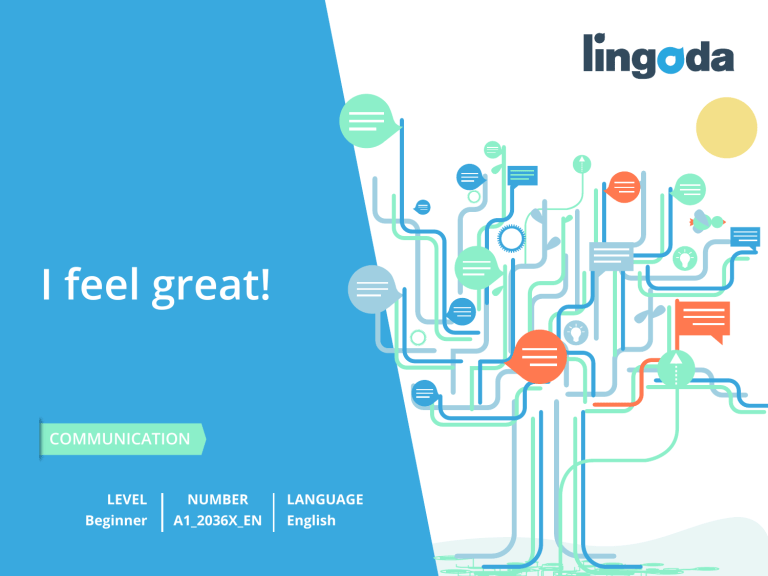 I feel great! COMMUNICATION LEVEL Beginner NUMBER A1_2036X_EN LANGUAGE English Goals ■ Can describe how I'm feeling using basic adjectives. ■ Can talk about how other people are feeling using 'to seem', 'to look' and 'to think' www.lingoda.com 2 How do you feel today? www.lingoda.com 3 happy I am smiling because I am happy. www.lingoda.com 4 sad Today she feels sad. www.lingoda.com 5 to move I feel happy when I move my body. www.lingoda.com 6 to live We are a family. We live together. www.lingoda.com 7 to breathe They are breathing deeply. www.lingoda.com 8 Talking about feelings Are you happy or sad? I am happy because I live in the United Kingdom. www.lingoda.com 9 Talking about the body We need to breathe in order to live. We feel happy because it is a sunny day. Sometimes we all feel sad. You have to move several body parts at the same time to swim. www.lingoda.com 10 Match the sentences to the pictures 1. She is very sad today. 2. We live together. 3. I am moving my body! 4. He feels happy. A B www.lingoda.com C D 11 Match the sentences 1. I am not ill. a. I feel sad. 2. I have no friends. b. I feel healthy. 3. I did not sleep very well. c. Now I feel better. 4. Last week I was ill. d. I am feeling tired. www.lingoda.com 12 Write sentences with the verbs below to feel to breathe to live to move www.lingoda.com 13 Talking about feelings When we talk about emotions, we use the verb to feel, followed by the adjective. Pronoun Verb + adjective I feel angry today. He feels happy when he swims. She is feeling ill today. www.lingoda.com 14 Talking about family This is my sister and me. In this picture we are very _______________. Sometimes when I _______________ sad, my sister _______________ me feel better. We really _______________ each other! makes happy feel love www.lingoda.com 15 to run They are running together. www.lingoda.com 16 worried I am worried about the future. www.lingoda.com 17 tired I can’t believe it’s time to wake up already! I still feel so tired. www.lingoda.com 18 angry Usually I am happy, but sometimes I feel angry. www.lingoda.com 19 excited She is excited about the weekend! www.lingoda.com 20 Talking about feelings She is worried about something. She looks very tired. www.lingoda.com 21 Talking about feelings I love to run in the morning. Today I feel angry, not happy. I am excited to see you! I hate feeling tired. www.lingoda.com 22 Make two lists with the words below Verbs Feelings www.lingoda.com breathe run tired happy excited move angry sad 23 Make sentences with these verbs run laugh sleep worry www.lingoda.com 24 How do you feel when you are ill? excited worried unwell sad tired angry happy worried www.lingoda.com 25 Vocabulary brainstorm What other feeling words do you know? www.lingoda.com 26 How are you? What makes you feel… tired excited worried angry happy ill sad scared great www.lingoda.com 27 What do you think? How are these people feeling? Why? www.lingoda.com 28 What do you think? How are these people feeling? Why? www.lingoda.com 29 Vocabulary brainstorm ■ Try to think of emotions or feelings that start with the letters in your name. www.lingoda.com 30 Reflect on the goals Go back to the second slide of the lesson and check if you have achieved all the goals of the lesson. yes no _______________________________ _______________________________ _______________________________ _______________________________ www.lingoda.com 31 Reflect on this lesson Think about everything you have seen in this lesson. What were the most difficult activities or words? The easiest? + _______________________________ + _______________________________ – _______________________________ – _______________________________ _______________________________ _______________________________ _______________________________ _______________________________ www.lingoda.com If you have time, go over the most difficult slides again 32 www.lingoda.com 33 Exercise p.11 1. D 2. C 3. B 4.A Exercise p.12 1.B 2. A 3. D 4. C Exercise p.15 (in reading order) happy; feel; makes; love Exercise p.23 Verbs: breathe, run, move Feelings: tired, happy, excited, angry, sad Answer key Homework www.lingoda.com 34 Word search C A C N G Y A N G R Y Z Find the words! 1. happy 2. healthy 3. angry 4. tired 5. worried 6. sad 7. breathe www.lingoda.com R Q G C V V B R E Q D F A U R S W D D O N S R C C R K S I F C E R X D F H N M L E B E K A T H E L T A N T D P K H E P J Y U Y V U G G T T I R E J M K G Q K L B J S A D Y T T E O K T R D U Y F 35 Vocabulary lists Check the first five words of the lesson. Sort them into two lists. Give your lists a name. List 2: _____________ List 1: _____________ www.lingoda.com 36 My favourite words Choose five words or phrases from the lesson and write them down in your list of My favourite words. Word one Word two Word three … www.lingoda.com 37 Make flashcards Make flashcards out of paper and copy down four words or phrases from this lesson that are hard for you. Hello! My name is… www.lingoda.com 38 Sentences in the third person plural Choose five example sentences from this lesson. Copy them and rewrite them about a group of people (or using the pronoun them). Examples: She is a doctor → Hannah and James are doctors. He speaks English and French → They speak English and French. … www.lingoda.com 39 Word search answer key Find the words! 1. happy 2. healthy 3. angry 4. tired A N G R Y 5. worried 6. sad 7. breathe www.lingoda.com H E B R E A T H E L A T P W H P O Y Y R R T I R E D I E D S A D 40 About this material This material is provided by Who are we? Why learn English online? What kinds of English classes do we offer? Who are our English teachers? How do our English certificates work? We also have a language blog! www.lingoda.com 41