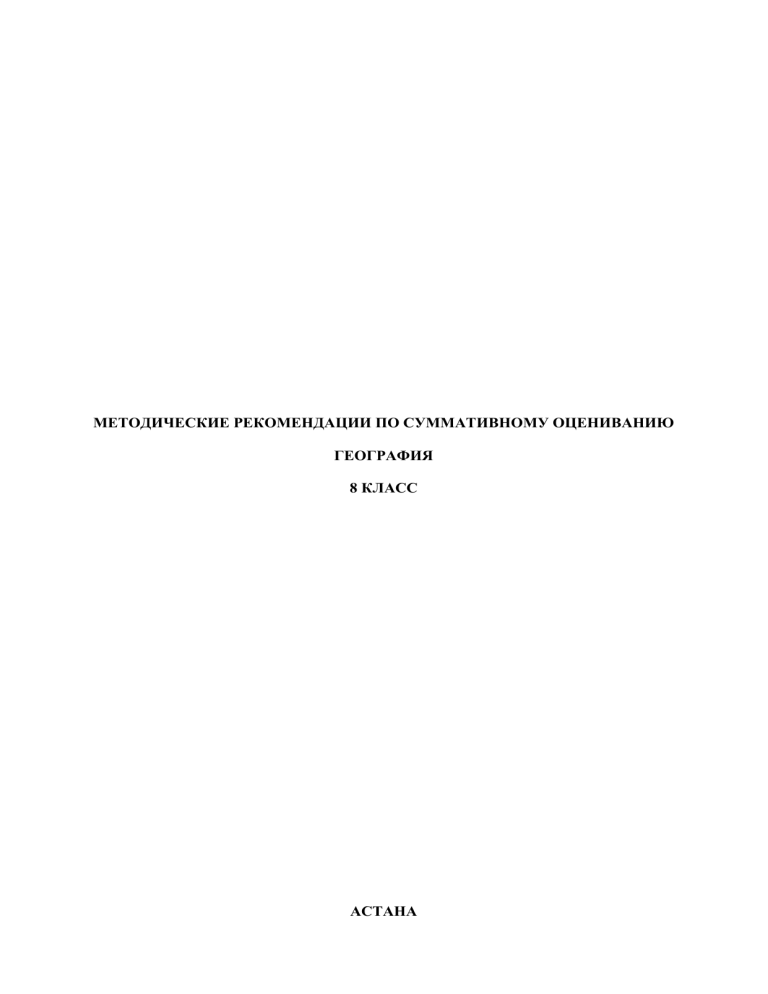 МЕТОДИЧЕСКИЕ РЕКОМЕНДАЦИИ ПО СУММАТИВНОМУ ОЦЕНИВАНИЮ ГЕОГРАФИЯ 8 КЛАСС АСТАНА ПРОЕКТ Методические рекомендации составлены в помощь учителю при планировании, организации и проведении суммативного оценивания по предмету «География» для обучающихся в 8 классах. Методические рекомендации подготовлены на основе учебной программы по предмету «География» (в рамках обновления содержания среднего образования) для основной школы (5-9 классы) (с русским языком обучения) и учебного плана. Суммативное оценивание в 8 классе проводится в 1,2,3 и 4 четвертях. Задания для суммативного оценивания за раздел/сквозную тему позволят учителю определить уровень достижения обучающимися целей обучения, запланированных на четверть. Для проведения суммативного оценивания за раздел/сквозную тему в методических рекомендациях предлагаются задания, критерии оценивания с дескрипторами и баллами. Также в сборнике описаны возможные уровни учебных достижений обучающихся (рубрики). Задания с дескрипторами и баллами носят рекомендательный характер. Для проведения суммативного оценивания за четверть предлагается спецификация со схемой выставления баллов. Спецификация стандартизирована и обязательна для проведения суммативного оценивания за четверть. Методические рекомендации предназначены для учителей основной школы, администрации школ, методистов отделов образования, школьных и региональных координаторов по критериальному оцениванию и других заинтересованных лиц. При подготовке методических рекомендаций использованы ресурсы (рисунки, фотографии, тексты, видео- и аудиоматериалы и др.), находящиеся в открытом доступе на официальных интернет-сайтах. 2 ПРОЕКТ СОДЕРЖАНИЕ ЗАДАНИЯ ПО СУММАТИВНОМУ ОЦЕНИВАНИЮ ЗА 1 ЧЕТВЕРТЬ .............................................4 Суммативное оценивание за раздел............................................................................................................ 4 «Методы географических исследований» \ подраздел « Исследования и исследователи» .................. 4 Суммативное оценивание за раздел............................................................................................................ 8 «Картография и географические базы данных» \ подраздел «Географические карты» ........................ 8 Суммативное оценивание за раздел..........................................................................................................12 «Физическая география» \ подраздел «Литосфера» ................................................................................12 ЗАДАНИЯ ПО СУММАТИВНОМУ ОЦЕНИВАНИЮ ЗА 2 ЧЕТВЕРТЬ .......................................... 16 Суммативное оценивание за раздел..........................................................................................................16 «Физическая география» \ подраздел «Атмосфера» ...............................................................................16 Суммативное оценивание за раздел..........................................................................................................20 «Физическая география» \ подраздел «Гидросфера» ..............................................................................20 ЗАДАНИЯ ПО СУММАТИВНОМУ ОЦЕНИВАНИЮ ЗА 3 ЧЕТВЕРТЬ .......................................... 24 Суммативное оценивание за раздел..........................................................................................................24 «Физическая география» \ подраздел «Биосфера» ..................................................................................24 Суммативное оценивание за раздел..........................................................................................................28 «Физическая география» \ подраздел «Природно-территориальные комплексы» ..............................28 Суммативное оценивание за раздел..................................................................