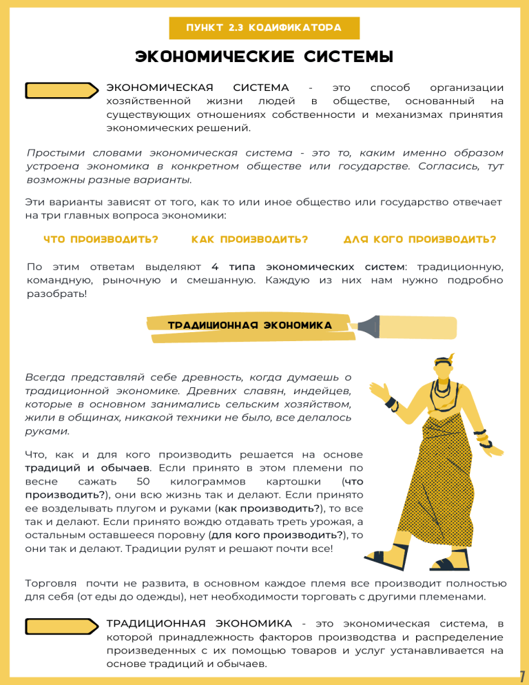 ПУНКТ 2.3 КОДИФИКАТОРА ЭКОНОМИЧЕСКИЕ СИСТЕМЫ ЭКОНОМИЧЕСКАЯ СИСТЕМА это способ организации хозяйственной жизни людей в обществе, основанный на существующих отношениях собственности и механизмах принятия экономических решений. Простыми словами экономическая система - это то, каким именно образом устроена экономика в конкретном обществе или государстве. Согласись, тут возможны разные варианты. Эти варианты зависят от того, как то или иное общество или государство отвечает на три главных вопроса экономики: ЧТО ПРОИЗВОДИТЬ? КАК ПРОИЗВОДИТЬ? ДЛЯ КОГО ПРОИЗВОДИТЬ? По этим ответам выделяют 4 типа экономических систем: традиционную, командную, рыночную и смешанную. Каждую из них нам нужно подробно разобрать! ТРАДИЦИОННАЯ ЭКОНОМИКА Всегда представляй себе древность, когда думаешь о традиционной экономике. Древних славян, индейцев, которые в основном занимались сельским хозяйством, жили в общинах, никакой техники не было, все делалось руками. Что, как и для кого производить решается на основе традиций и обычаев. Если принято в этом племени по весне сажать 50 килограммов картошки (что производить?), они всю жизнь так и делают. Если принято ее возделывать плугом и руками (как производить?), то все так и делают. Если принято вождю отдавать треть урожая, а остальным оставшееся поровну (для кого производить?), то они так и делают. Традиции рулят и решают почти все! Торговля почти не развита, в основном каждое племя все производит полностью для себя (от еды до одежды), нет необходимости торговать с другими племенами. ТРАДИЦИОННАЯ ЭКОНОМИКА - это экономическая система, в которой принадлежность факторов производства и распределение произведенных с их помощью товаров и услуг устанавливается на основе традиций и обычаев. 1 К признакам традиционной экономики относятся: факторы производства обычно находятся в общем владении (принадлежат общине) натуральное хозяйство (каждое племя все создает для себя и не продает/ покупает товары), значительная роль ручного труда хозяйственная деятельность основывается на исторически сложившихся методах ведения хозяйства (обычаях), технологии примитивны основа экономики - сельское хозяйство (аграрно-сырьевое), а земля главный фактор производства ПЛАНОВАЯ ЭКОНОМИКА она же централизованная, государственная, административная, командная Всегда представляй себе СССР, когда думаешь о плановой экономике. Государство решает все, брюки можно купить только от фабрики большевичка, продукты по карточкам и дефицит товаров на полке, не работать преступление, есть пятилетки для максимальной выработки. Старайся вспоминать рассказы своих родителей о жизни в СССР, о том, что никакие марки недоступны и есть только за границей. Что, как и для кого производить решается на основе плана, который составляет государство. Государство заранее считает, что понадобится, например, 10000 штанов в месяц (что производить?), отправляет заказы на производство государственным фабрикам (как производить?), а потом устанавливает цену для распределения между гражданами (для кого производить?). Все решает государство и его план! Вот, например, у Маши в 1960 году поизносились все штаны и она пошла купить себе новые. Хотела модные, вельветовые, коричневые. А у государства по плану в этом году производились только серые и черные из обычной ткани. У Маши нет