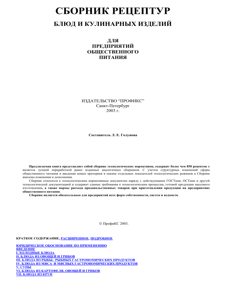 СБОРНИК РЕЦЕПТУР БЛЮД И КУЛИНАРНЫХ ИЗДЕЛИЙ ДЛЯ ПРЕДПРИЯТИЙ ОБЩЕСТВЕННОГО ПИТАНИЯ ИЗДАТЕЛЬСТВО “ПРОФИКС” Санкт-Петербург 2003 г. Составитель Л. Е. Голунова Предлагаемая книга представляет собой сборник технологических нормативов, содержит более чем 850 рецептов и является лучшей переработкой ранее изданных аналогичных сборников. С учетом структурных изменений сферы общественного питания и введения новых критериев в оценке отдельных показателей технологических режимов в Сборник внесены изменения и дополнения. Сборник относится к технологическим нормативным документам наряду с действующими ГОСТами, ОСТами и другой технологической документацией и содержит единые требования к технологическим процессам, готовой продукции массового изготовления, а также нормы расхода продовольственных товаров при приготовлении продукции на предприятиях общественного питания. Сборник является обязательным для предприятий всех форм собственности, систем и ведомств. ПрофиКС 2003. КРАТКОЕ СОДЕРЖАНИЕ, РАСШИРЕННОЕ, ПОДРОБНОЕ ЮРИДИЧЕСКОЕ ОБОСНОВАНИЕ ПО ПРИМЕНЕНИЮ ВВЕДЕНИЕ I. ХОЛОДНЫЕ БЛЮДА II. БЛЮДА ИЗ ОВОЩЕЙ И ГРИБОВ III. БЛЮДА ИЗ РЫБЫ, РЫБНЫХ ГАСТРОНОМИЧЕСКИХ ПРОДУКТОВ IV. БЛЮДА ИЗ МЯСА И МЯСНЫХ ГАСТРОНОМИЧЕСКИХ ПРОДУКТОВ V. СУПЫ VI. БЛЮДА ИЗ КАРТОФЕЛЯ, ОВОЩЕЙ И ГРИБОВ VII. БЛЮДА ИЗ КРУП VIII. БЛЮДА ИЗ МАКАРОННЫХ ИЗДЕЛИЙ IX. БЛЮДА ИЗ ЯИЦ X. БЛЮДА ИЗ ТВОРОГА XI. БЛЮДА ИЗ РЫБЫ И МОРЕПРОДУКТОВ XII. БЛЮДА ИЗ МЯСА И МЯСНЫХ ПРОДУКТОВ XIII. ГАРНИРЫ XIV. СОУСЫ XV. СЛАДКИЕ БЛЮДА XVI. НАПИТКИ ПРИЛОЖЕНИЕ РАСШИРЕННОЕ СОДЕРЖАНИЕ ЮРИДИЧЕСКОЕ ОБОСНОВАНИЕ ПО ПРИМЕНЕНИЮ ВВЕДЕНИЕ I. ХОЛОДНЫЕ БЛЮДА Бутерброды Банкетные закуски Гастрономические товары и консервы (порциями) Салаты и винегреты II. БЛЮДА ИЗ ОВОЩЕЙ И ГРИБОВ III. БЛЮДА ИЗ РЫБЫ, РЫБНЫХ ГАСТРОНОМИЧЕСКИХ ПРОДУКТОВ IV. БЛЮДА ИЗ МЯСА И МЯСНЫХ ГАСТРОНОМИЧЕСКИХ ПРОДУКТОВ V. СУПЫ Горячие супы Заправочные супы Борщи Щи Рассольники Супы картофельные с овощами, крупой, бобовыми и макаронными изделиями Супы с макаронными изделиями, домашней лапшой, крупой и бобовыми Солянки Супы молочные Супы-пюре Супы прозрачные Холодные супы VI. БЛЮДА ИЗ КАРТОФЕЛЯ, ОВОЩЕЙ И ГРИБОВ Отварные картофель и овощи Картофель, овощи и грибы, припущенные и тушеные Картофель, овощи и грибы жареные Картофель, овощи и грибы запеченные VII. БЛЮДА ИЗ КРУП Каши Рассыпчатые каши Вязкие каши Жидкие каши Изделия из каш Крупеники, запеканки и пудинги Котлеты и биточки VIII. БЛЮДА ИЗ МАКАРОННЫХ ИЗДЕЛИЙ IX. БЛЮДА ИЗ ЯИЦ Блюда из вареных яиц Омлеты X. БЛЮДА ИЗ ТВОРОГА XI. БЛЮДА ИЗ РЫБЫ И МОРЕПРОДУКТОВ Рыба отварная Рыба припущенная Рыба тушеная Рыба жареная Рыба запеченная Блюда из котлетной массы Блюда из рыбных консервов Блюда из морепродуктов XII. БЛЮДА ИЗ МЯСА И МЯСНЫХ ПРОДУКТОВ Отварное мясо, субпродукты Жареное мясо, субпродукты Тушеное мясо, субпродукты Блюда из рубленого мяса Мясо запеченное Блюда из сельскохозяйственной птицы, пернатой дичи и кролика XIII. ГАРНИРЫ Гарниры для горячих блюд Гарниры из круп, бобовых и макаронных изделий Гарниры из картофеля и овощей Гарниры для холодных блюд Гарниры из овощей Гарниры из овощей к сельди и отварной рыбе XIV. СОУСЫ Соусы горячие Соусы мясные красные Соусы белые на мясном бульоне Соусы на рыбном бульоне Соусы молочные Соусы сметанные Соусы грибные Соусы яично-масляные Смеси масляные Соусы холодные Соусы сладкие и сиропы XV. СЛАДКИ