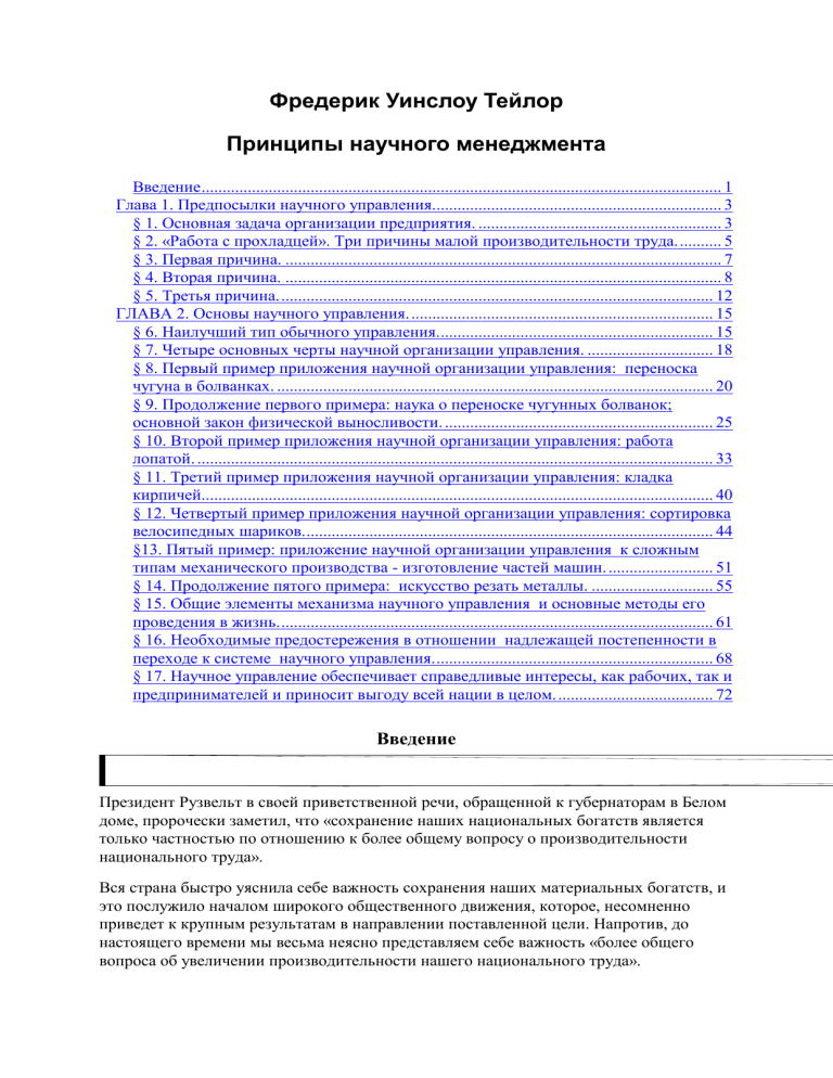 Фредерик Уинслоу Тейлор Принципы научного менеджмента Введение ............................................................................................................................ 1 Глава 1. Предпосылки научного управления..................................................................... 3 § 1. Основная задача организации предприятия. .......................................................... 3 § 2. «Работа с прохладцей». Три причины малой производительности труда. .......... 5 § 3. Первая причина. ........................................................................................................ 7 § 4. Вторая причина. ........................................................................................................ 8 § 5. Третья причина. ....................................................................................................... 12 ГЛАВА 2. Основы научного управления. ........................................................................ 15 § 6. Наилучший тип обычного управления. ................................................................. 15 § 7. Четыре основных черты научной организации управления. .............................. 18 § 8. Первый пример приложения научной организации управления: переноска чугуна в болванках. ........................................................................................................ 20 § 9. Продолжение первого примера: наука о переноске чугунных болванок; основной закон физической выносливости. ................................................................ 25 § 10. Второй пример приложения научной организации управления: работа лопатой. ........................................................................................................................... 33 § 11. Третий пример приложения научной организации управления: кладка кирпичей.......................................................................................................................... 40 § 12. Четвертый пример приложения научной организации управления: сортировка велосипедных шариков. ................................................................................................. 44 §13. Пятый пример: приложение научной организации управления к сложным типам механического производства - изготовление частей машин. ......................... 51 § 14. Продолжение пятого примера: искусство резать металлы. ............................. 55 § 15. Общие элементы механизма научного управления и основные методы его проведения в жизнь. ....................................................................................................... 61 § 16. Необходимые предостережения в отношении надлежащей постепенности в переходе к системе научного управления. .................................................................. 68 § 17. Научное управление обеспечивает справедливые интересы, как рабочих, так и предпринимателей и приносит выгоду всей нации в целом. ..................................... 72 Введение Президент Рузвельт в своей приветственной речи, обращенной к губернаторам в Белом доме, пророчески заметил, что «сохранение наших национальных богатств является только частностью по отношению к более общему вопросу о производительности национального труда». Вся страна быстро уяснила себе важность сохранения наших материальных богатств, и это послужило началом широкого общественного движения, которое, несомненно приведет к крупным результатам в направлении поставленной цели. Напротив, до настоящего времени мы весьма неясно представляем себе важность «более общего вопроса об увеличении производительности нашего национального труда». Мы непосредственно можем видеть, как исчезают наши леса, как пропадает неиспользованной наша водная энергия, как почва наша смывается морем, а конец наших запасов угля и железа есть вопрос недалекого будущего. Напротив неизмеримо большая непроизводительная растрата человеческой энергии, совершающаяся ежедневно в массе наших действий, являющихся 