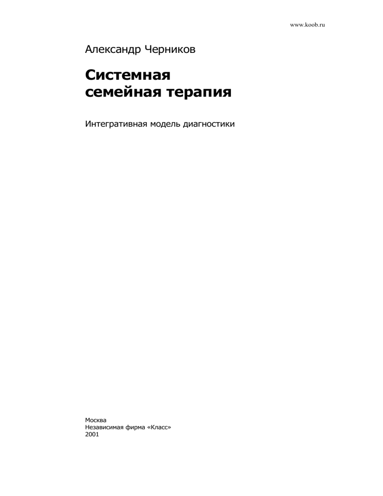www.koob.ru Александр Черников Системная семейная терапия Интегративная модель диагностики Москва Независимая фирма «Класс» 2001 www.koob.ru УДК 615.851 ББК 53.57 Ч 89 Черников А.В. Ч 89 Системная семейная терапия: Интегративная модель диагностики. — Изд. 3-е, испр. и доп. М.: Независимая фирма “Класс”, 2001. — 208 с. — (Библиотека психологии и психотерапии, вып. 97). ISBN 5-86375-042-1 Системная семейная терапия помогает понять отдельного человека в контексте его социальных связей. Эта книга ставит и решает особую задачу — помочь специалисту выработать целостное представление о семье как о группе взаимозависимых индивидов — семейной системе. Эффективная терапия невозможна без развитой диагностики проблем семьи и типовых терапевтических ситуаций. Описываемая в книге интегративная модель системной семейной психотерапевтической диагностики призвана ускорить процесс оценки семейной системы и выдвижения терапевтических гипотез. Она обеспечивает терапевта надежным инструментом, позволяющим провести всестороннюю оценку семейной системы, выдвинуть обоснованные гипотезы и наметить план терапии. Автор отвечает на вопрос о том, как связать воедино представления о многопоколенном семейном наследии, задачах развития жизненного цикла, распределении власти в семье, особенностях взаимодействия ее членов и условной пользе, извлекаемой семьей из своих проблем. Отдельная глава посвящена проблемам обучения специалистов (психологов, врачей, социальных работников) — всех тех, кто призван оказывать помощь семье. Книга является прекрасным пособием для всех, кто хотел бы изучить устройство семьи с позиции современной семейной терапии. Главный редактор и издатель серии Л.М. Кроль Научный консультант серии Е.Л. Михайлова ISBN 5-86375-042-1 © 2001 А.В. Черников © 2001 Независимая фирма “Класс”, издание, оформление © 2001 Е.А. Кошмина, дизайн обложки Исключительное право публикации на русском языке принадлежит издательству “Независимая фирма “Класс”. Выпуск произведения или его фрагментов без разрешения издательства считается противоправным и преследуется по закону. www.kroll.igisp.ru Купи книгу “У КРОЛЯ” www.koob.ru ВВЕДЕНИЕ В начале 1960-х годов семейная терапия выделилась в самостоятельную область психотерапевтической практики. Ее становление связано с развитием теории коммуникаций и применением теории систем к объяснению проблем человеческого поведения. Постепенно все большую популярность стал приобретать подход к семье как к единице психологического воздействия. В связи с этим идентифицированный пациент (т.е. тот, по поводу которого семья обратилась в консультацию) рассматривается не как медицинский больной, а скорее как элемент дисфункциональной семейной системы. Семейная терапия предполагает возможность терапевтической помощи ребенку или взрослому пациенту через его семью, в которой он заболел или получил разного рода отклонения. Соответственно, в фокусе работы оказываются не интрапсихические проблемы членов семьи, а паттерны взаимодействий, устройство и процессы самой семьи. Таким образом, целью семейной терапии является создание условий для формирования функциональной семейной организации, которая обеспечит максимальный рост потенциальных возможностей каждого члена семьи. Несмотря на сорокалетнюю историю, семейная терапия остается сравнительно молодой область