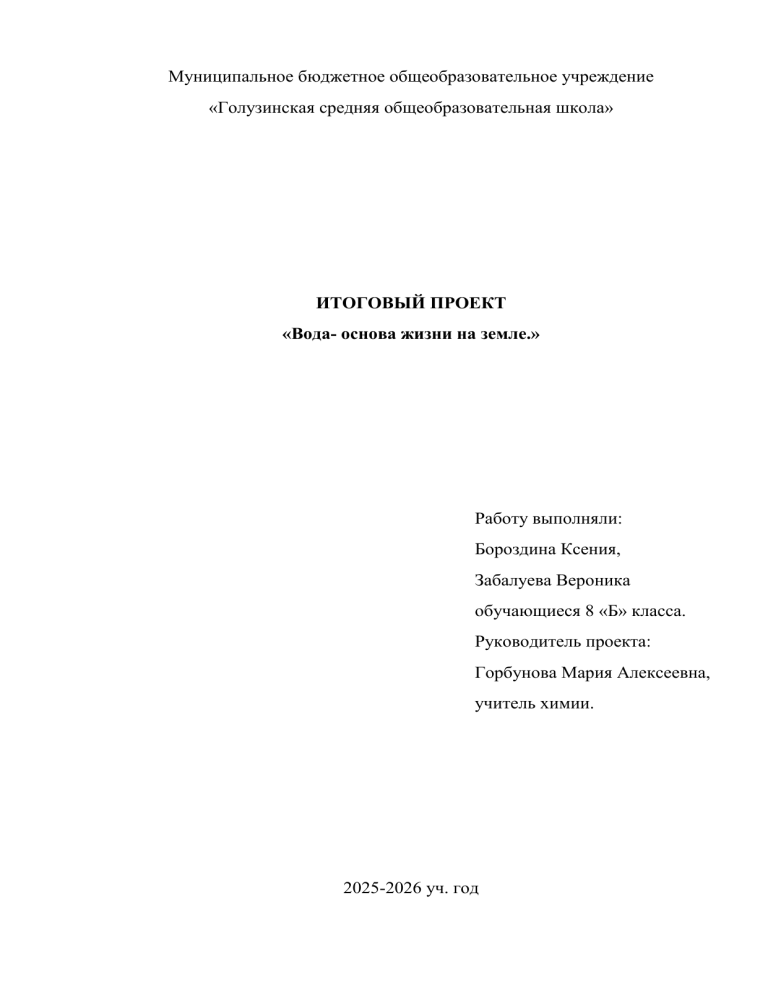 Муниципальное бюджетное общеобразовательное учреждение «Голузинская средняя общеобразовательная школа» ИТОГОВЫЙ ПРОЕКТ «Вода- основа жизни на земле.» Работу выполняли: Бороздина Ксения, Забалуева Вероника обучающиеся 8 «Б» класса. Руководитель проекта: Горбунова Мария Алексеевна, учитель химии. 2025-2026 уч. год Оглавление Введение…………………………………………………………………………...3 Основная часть…………………………………………………………………….5 1. Вода – самое распространенное вещество на Земле………………………….5 2. Роль воды в живом организме……………………………………………….…7 3. Вода и здоровье человека……………………………………………………...9 4.Методы очистки воды в домашних условиях………………………………..12 5.Свойства воды……………………………………………………………….....14 Заключение……………………………………………………………………….16 Список литературы………………………………………………………………17 2 Введение В жизни людей вода занимает особое место. Вместе с землей и воздухом она окружает человека, сопровождает его на протяжении всей жизни и порой даже не привлекает особого внимания. Вода существует - и этого вполне достаточно. Для проживающего в городах цивилизованного человека очень часто общение с субстанцией, покрывающей более половины поверхности планеты, осуществляется через водопроводный кран на кухне или в ванной комнате. И только в экстремальных ситуациях – отключение водопровода, прорыв системы отопления – или во время отдыха с выездом на водный объект мы начинаем ценить воду как одно из основных условий жизни на Земле. Ежедневно мы выпиваем около 2,5 литров воды, а за все время жизни - такое ее количество, которое в сотни, раз превышает человеческий вес. Без воды человек не может обходиться, но на состояние нашего здоровья влияет не только количество выпитой воды, а и ее качество. Основным показателем качества воды является ее влияние на здоровье человека. А если вода не соответствует стандартам и в ней содержатся различного рода примесей, то, безусловно, они оказывают далеко неблаготворное влияние на здоровье, вызывая различные заболевания. По данным Всемирной Организации Здравоохранения (ВОЗ) вода содержит 13 тысяч потенциально токсичных элементов; 80% заболеваний передается водой; 25 миллионов человек ежегодно умирают от них. Актуальность. В настоящее время проблема защиты воды стоит на первом месте во всех планированиях экологических объединений. И действительно, ведь вода- источник жизни. А жизнь очень дорога. Поэтому следует принимать серьезные меры по охране воды. Казалось бы, вода… Ее у нас очень много, 2/3 планеты заняты водой. Но не все вечно. Даже огромный океан может превратиться в лужу. Цель: Выяснить роль воды в жизни и здоровье человека, научиться определять жесткость различных образцов воды Задачи: 1.Определить роль воды в живом организме и ее значение в жизни 2.Найти и изучить методы определения жесткости воды в домашних и лабораторных условиях 3.Сделать сравнение жесткости различных образцов воды 3 Объект исследования: Вода. Предмет исследования: Вода – основа жизни. Гипотеза: Вода, благодаря своим волшебным свойствам, просто необходима для жизни на Земле. Методы исследования: анализ; наблюдение; сбор информации из книг, журналов, газет; сравнение; обобщение. 4 Основная часть 1. Вода – самое распространенное вещество на Земле Вода – это с