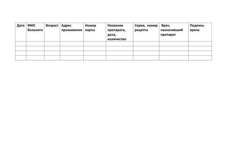 Дата ФИО Возраст Адрес Номер больного проживания карты Название препарата, доза, количество Серия, номер Врач, рецепта назначивший препарат Подпись врача