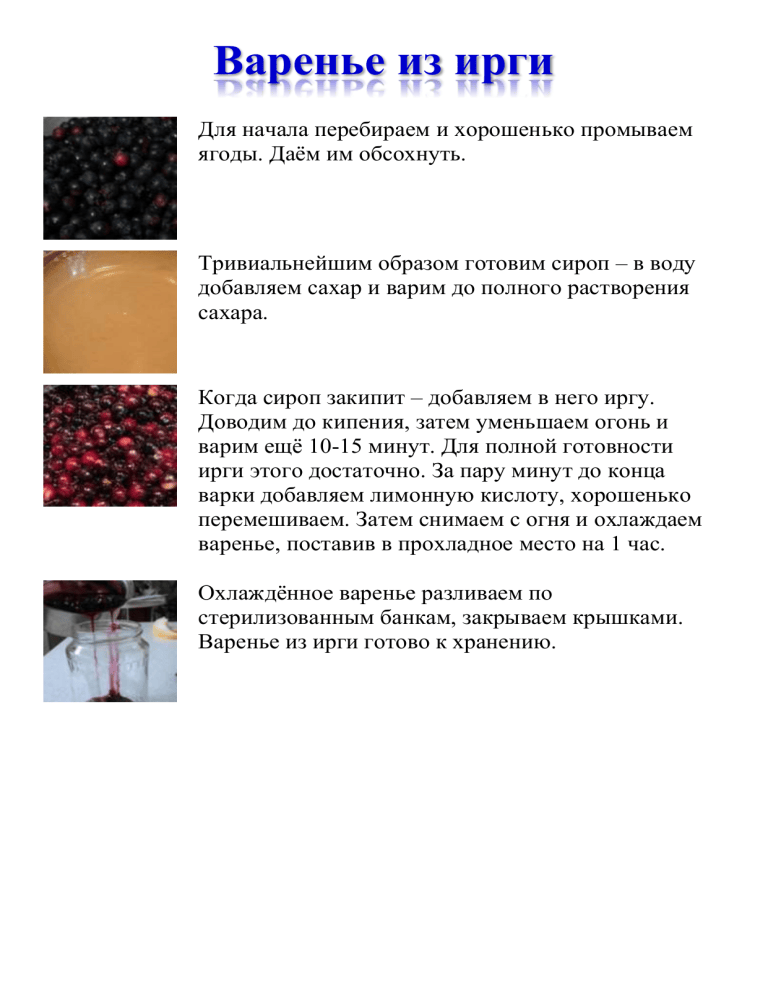 Варенье из ирги Для начала перебираем и хорошенько промываем ягоды. Даём им обсохнуть. Тривиальнейшим образом готовим сироп – в воду добавляем сахар и варим до полного растворения сахара. Когда сироп закипит – добавляем в него иргу. Доводим до кипения, затем уменьшаем огонь и варим ещё 10-15 минут. Для полной готовности ирги этого достаточно. За пару минут до конца варки добавляем лимонную кислоту, хорошенько перемешиваем. Затем снимаем с огня и охлаждаем варенье, поставив в прохладное место на 1 час. Охлаждённое варенье разливаем по стерилизованным банкам, закрываем крышками. Варенье из ирги готово к хранению.